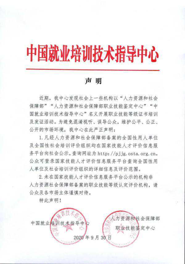 中国就业培训技术指导中心发出声明 日前,社会上一些机构以“人力资源和社会保障部”“人力资源和社会保障部职业技能鉴定中心”“中国就业培训技术指导中心”名义开展职业技能等级证书培训及发证活动,对此,人社部中国就业培训技术指导中心发出严正声明。 声明 1.凡经人力资源和社会保障部备案的全国性用人单位及全国性社会培训评价组织均在国家技能人才评价信息服务平台向社会公示,查询网址为http//中可登录国家技能人才评价信息服务平台查询全国性用人单位及社会培训评价组织的详细信息及评价范围。 2.未在国家技能人才评价信息服务平台公示的机构非人力资源社会保障部备案的职业技能等级认定评价机构,请公众及各市场主体谨慎对待。