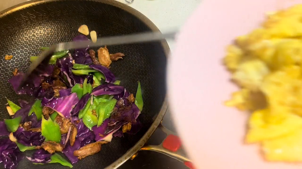 一碗香。 大家好,欢迎来到今天的张太太厨房。今天是跟大家分享美食的第376天,今天做一个简单的家庭小炒叫一碗香,备菜开做。 ·先来调一个料汁,碗内放入生抽、老抽、一点点蚝油、鸡汁、一点点的盐、再来一点点糖、胡椒粉,把它们搅匀备用。 ·锅内放入稍微多一点的底油,先来煎一下鸡蛋,鸡蛋稍微高一点的淋入锅内,然后稍微转动着锅,让蛋饼尽量面积大一点。一面煎好之后把它翻面煎至另外一面,把鸡蛋两面都煎至定型,不要把它煎的太老。定型之后就把它铲成这样稍微大一点的块,然后盛出备用。 ·锅内不用留底油,直接把五花肉片放入锅内翻炒,因为五花肉肥的部分会出油,所以不用留底油或者是少留一点点也可以。镜头被我碰歪了,但当时没有发现,好在还是能照到整个操作过程的。五花肉把它炒的这样油出的多一些,稍微的有一点点焦,五花肉炒成这样更香一些。 ·接着加入蒜片和小米辣,爆出锅香,然后放入切好的辣椒段和紫甘蓝。紫甘蓝我没有切,是用手撕的,尖椒我是把它切成了滚刀块。 ·把青菜在锅内炒至断生,接着放入刚刚炒好的鸡蛋,把它跟菜炒匀,然后沿锅边烹入一点料酒。 ·接着把刚刚调好的酱汁放入锅内,把它翻炒均匀让食材都能裹满酱汁。 ·最后淋出锅,淋入一点料油,然后把它炒匀就可以盛盘上桌。 一碗香就做好啦,简单还很下饭,大家在自己的厨房试一试。祝大家用餐愉快,相约明天的张太太厨房。