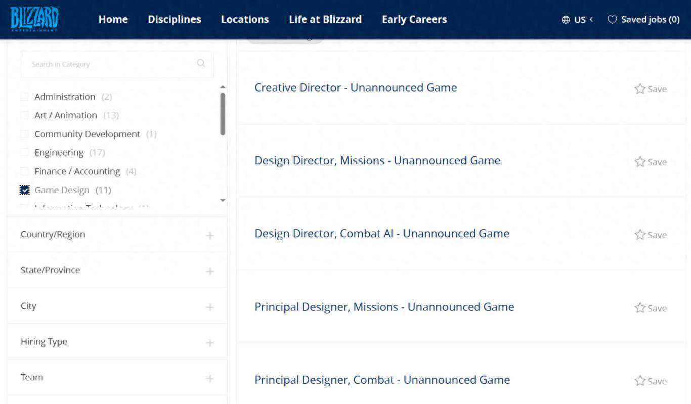 据外媒消息,暴雪目前正为一款未公布的游戏招聘员工。当前暴雪的官方招聘页面显示共有72个可用职位,其中12个职位与一款“未公布的游戏”相关,其中包括创意总监、叙事总监和首席任务设计师等多个高级职位。