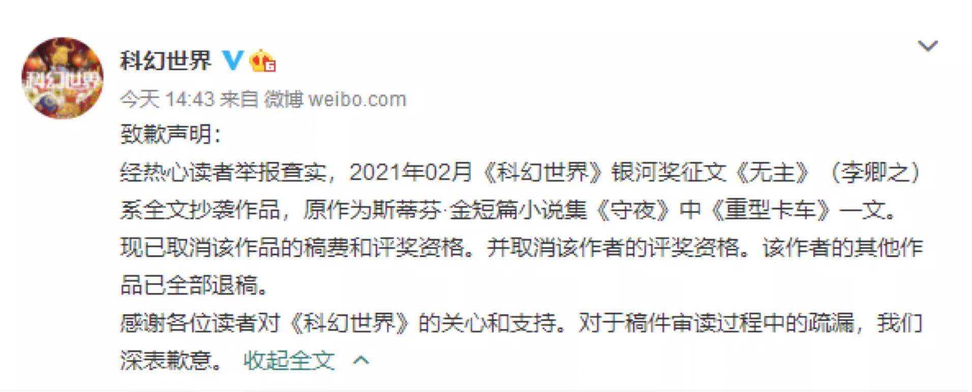 采写|镜陶 根据澎湃新闻报道,近日,2021年2月《科幻世界》上刊载的银河奖征文《无主》(李卿之)被读者爆料全文抄袭斯蒂芬·金短篇小说《重型卡车》。《重型卡车》选自斯蒂芬·金的短篇小说集《守夜》,讲述了人类反抗杀人卡车的故事,目前中文版由博集天卷出版。 2月22日,《无主》的作者李卿之在科幻世界百度贴吧中发帖承认抄袭,称自己是在转型期开始创作科幻小说,对抄袭的界限比较模糊,投稿后也抱有侥幸心理。2月23日,《科幻世界》回应称,已取消该作品的稿费和评奖资格。 事发后,新京报与《科幻世界》副主编拉兹取得了联系,拉兹表示,接到读者举报后,编辑部第一时间和作者进行了联系,作者承认自己对斯蒂芬·金的原著进行了改写,没有使用抄袭一词,并且该作者之前没有作品发表在《科幻世界》上。除了《无主》,作者也针对银河奖投了其他几篇自主创作的作品,但是由于质量问题,一概没有被录用。 《守夜》,【美】斯蒂芬·金著,邹亚译,版本:博集天卷2018年1月版 很多网友纷纷表示该纰漏应该归咎于审稿的编辑,作者抄袭了世界上最畅销小说家斯蒂芬·金的作品,编辑竟然看不出来。但根据《科幻世界》在《关于李卿之无主抄袭事件的说明》一文中的回应,该作品并不像网友想象中的那样一字不差地照搬《重型卡车》,而是使用了原作的主要设定和情节,将背景进行中国本土化,并对某些角色进行了改动,再加上了二次翻译。新京报记者与《守夜》的出版方博集天卷取得了联系,对方表示,书海无涯,编辑和杂志社也是受害方,抄袭防不胜防。 著名科幻作家宝树在微博表示,虽然斯蒂芬·金大名鼎鼎,但是作品量很大,编辑看不出来也是正常的,只要杂志还能有一个起码数量的读者群,必然有读者读过,所以发表出来一个月就被人发现了。 以下是《重型卡车》小说原文,刊载经出版方博集天卷同意: 那人名叫斯诺德格拉斯,我看见他正要做出什么疯狂的事情。他的眼睛瞪得大大的,露出大片眼白。看他那副样子,真像一条准备恶斗的疯狗。刚才骑着一辆旧“愤怒女神”摩托车在停车场发生侧滑的两个孩子想跟他打招呼,可他歪着脑袋,仿佛正在倾听其他什么声音。他的啤酒肚不算太大,还挺紧实的,包裹在一件蛮不错的西装里面,下面的裤子,屁股部分因磨损而发亮。他是一个推销员,展品包就放在身边,像一只熟睡的宠物狗。 “再试试收音机。”柜台边的卡车司机说。 快餐厨子耸耸肩,接通了收音机的电源。调台的指针啪的一下甩到一边,收音机里什么声音也没有。 “你调台得慢着点,”卡车司机不高兴了,“否则会错过。” “见鬼。”厨子说。他是个年长的黑人,脸上挂着温柔的笑容。他的心思不在卡车司机身上,他正透过餐车大小的落地窗往停车场看。 那儿有七八辆重型卡车,发动机突突地响着,低沉、无聊的声音,听上去像大猫在呜呜地叫。那几辆卡车中,有两三辆麦克,一辆海明威,还有四五辆雷欧。此外,还有铰链式卡车,州际运输车,车屁股上有好几块车牌,车后还有民用波段的拉杆天线。 偌大的停车场里,地面有环形的虚线标示。在停车场尽头,“愤怒女神”翻倒在一片碎石上,已经严重损毁,成了一堆废铁。在卡车停车区的调头处,有一辆被撞坏的凯迪拉克轿车,挡风玻璃碎了一地,车主还在车上,瞪着眼睛,仿佛一条被宰杀了的鱼,角质眼镜挂在一边耳朵上。 从那里再向前,差不多在停车场的中间位置,躺着一个身穿粉色衣裙的女孩。当她发现已经无处避让的时候,她从那辆凯迪拉克里跳了出来,可惜还是被撞身亡了。虽然她脸朝下趴着,可她的样子是最惨的,成群的苍蝇围着她打转。 路对面,一辆老式的福特旅行车被撞进了护栏。这起事故发生在一小时前。这么长时间了,没有人过问。站在快餐部的窗前,看不见高速公路,电话也打不通。 “你调得太快了,”卡车司机抗议道,“你应该……” 就在这时,斯诺德格拉斯跳了起来。他撞翻了桌子,桌上的咖啡杯无一幸免,摔碎在地上,连白糖也腾空飞起。他的眼睛看上去更加疯狂,嘴巴耷拉着,不停地喊叫:“我们要离开这里离开这里我们要离开这里离开这里……” 男孩在大喊,他的女朋友在尖叫。 我正坐在距离门口最近的一张凳子上,我一把抓住他的衬衫,但被他挣脱了。他加快了速度,已经出了类似银行金库门的圆形大门。 他砰的一声带上门,随即纵身跃过一堆砾石,奔向左边的排水沟。两辆卡车朝他背后袭来,烟囱大口大口地向空中喷吐深褐色的柴油废气,巨型后轮连续不断地扬起阵阵砾石。 他再跑五六步就可以到达平坦的停车场了,可就在这时,他停住脚,转身向后看,恐惧爬满了他的面孔。他的步子乱了,身体摇晃了几下,差一点摔倒。他再次站稳,但已经太晚了。一辆卡车闪在一边,另一辆开足马力冲了过来,车头的金属鬼脸在阳光下耀眼夺目。斯诺德格拉斯大叫一声,声音又高又尖,可还是淹没在雷欧柴油发动机的吼叫声中。 卡车没有将他扑倒,如果扑倒了,反而更好。结果是,卡车将他顶起来,扔出去,仿佛足球运动员踢了一个悬空球。一时间,在夏日午间的天空下,他就像一个残破的稻草人,消失在排水沟里。 大卡车的刹车咝咝作响,仿佛龙在喘息,它的前轮紧紧抓住地面,在停车场的砾石地面上留下一道道深深的凹槽。它及时罢手了。狗杂种! 坐在窗前的女孩发出一声尖叫,双手紧紧地捂着脸,太用力了,