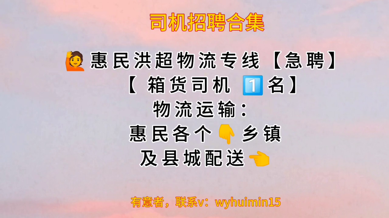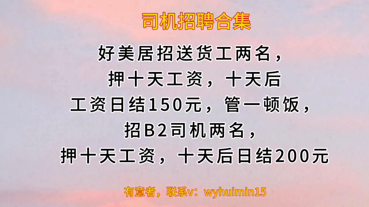 山东滨州佳捷子母车队现招聘40名C1及以上驾驶资格的司机。工作内容包括城市配送和周边地区的不装不卸运输,只负责开车,工资为多劳多得,每月净收入在9000-15000元之间。面试地址为商河中润商务中心。 招聘A2驾驶员40名,常年固定跑内蒙山西,公司配备独立员工宿舍、洗浴房、洗衣间,工资为趟结月结均可,全勤奖、节油奖、车辆爱惜奖等激励措施。公司资金链雄厚,欢迎有想法、能吃苦耐劳的司机朋友合作共赢。 招聘4.2米冷藏车司机,工资为底薪6000元加提成,要求吃苦耐劳,有团队精神,听从指挥,携手合作,共创辉煌。地址为阳信李纯白村118号,赞阳工厂对面的好美居。 惠民洪超物流专线急需招聘两名送货工,押十天工资,十天后日结200元。 酒仙网国际名酒城现招聘店长、营业员、送货司机业务员等职位,待遇优厚,公司总部提供专业培训和带薪旅游,绩效奖金、定期团建,酒水销售相关经验者优先。地址为惠民县东景豪庭A区沿街路东。 微遇,分享惠民县的精彩生活,是最美的时光。求出租、求职招聘、求购出售、二手转让、打听事、家政便民、征婚交友、商业服务,寻找合作伙伴:司机5名,要求C1及以上驾驶资格,运输范围为城市配送和周边地区,不装不卸,只负责开车,工资为多劳多得,每月净收入在9000-15000元之间。面试地址为商河中润商务中心。山东滨州佳捷子母车队新增40辆车,现招聘A2驾驶员40名,常年固定跑内蒙山西,配备独立员工宿舍、洗浴房、洗衣间,工资可月结或趟结,提供全勤奖、节油奖和车辆爱惜奖等福利。公司资金实力雄厚,欢迎有想法、能吃苦耐劳的司机朋友加入我们的合作共赢。 招聘4.2米冷藏车司机,月薪6000元起,外加提成。要求司机有团队精神,能够听从指挥,与公司共同发展。 地址位于阳信李纯白村118号,赞阳工厂对面。 好美居招聘两名送货工,工资押十天后日结150元,提供一顿工作餐。同时招聘两名B2司机,工资押十天后日结200元。 洪超物流专线招聘【急聘】【箱货司机】,负责惠民各个乡镇及县城的配送。 ·1、店长年薪5-10万,要求年龄25-38岁,男女不限、形象佳、气质好、沟通能力强,会管理、有执行力,熟悉office软件应用,有上进心。 ·2、营业员月薪3000+提成,女性,年龄25-40岁,高中以上学历,形象气质佳、性格外向、高情商、会社交软件,执行能力强。 ·3、送货司机业务员,底薪4000-10000元,代理品牌包括水井坊、西凤酒、小糊涂仙、四特酒、张裕葡萄酒,总部提供专业培训、带薪旅游、绩效奖金、定期团建、酒水销售相关经验者优先。 地址:惠民县东景豪庭A区沿街路东,酒仙网国际名酒城。
