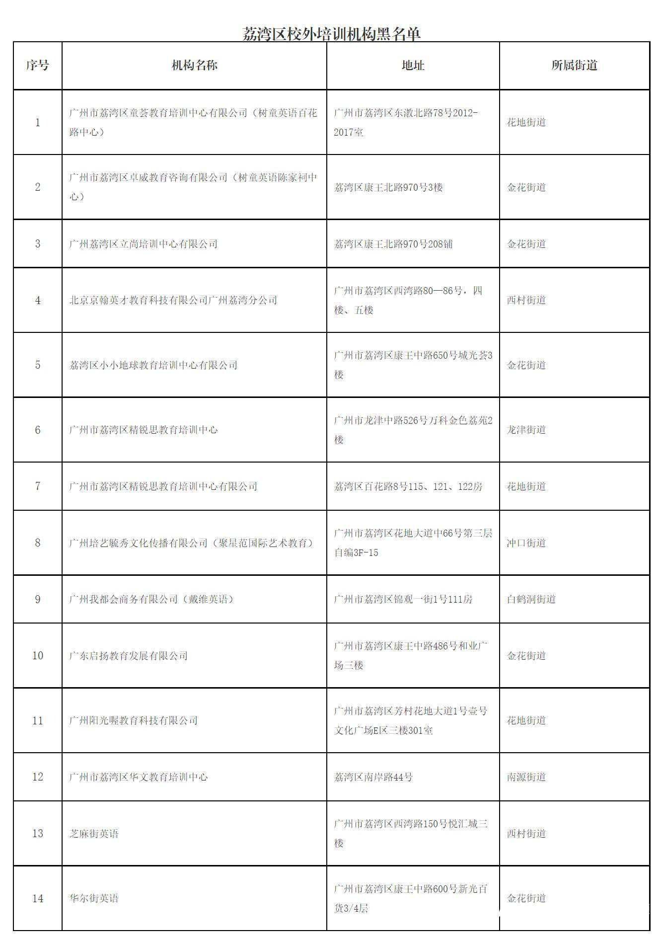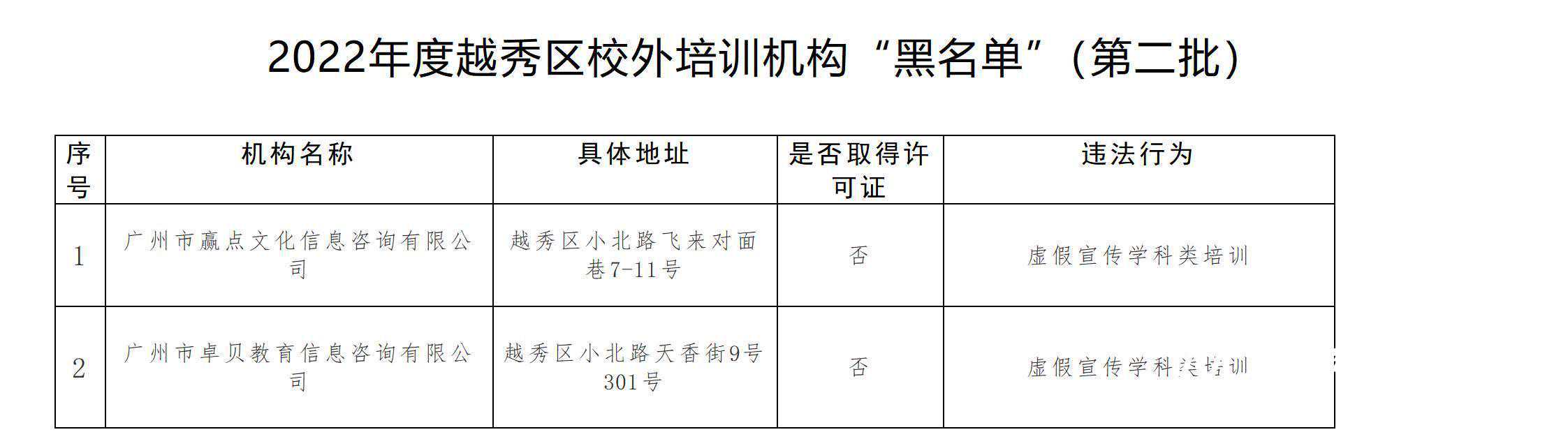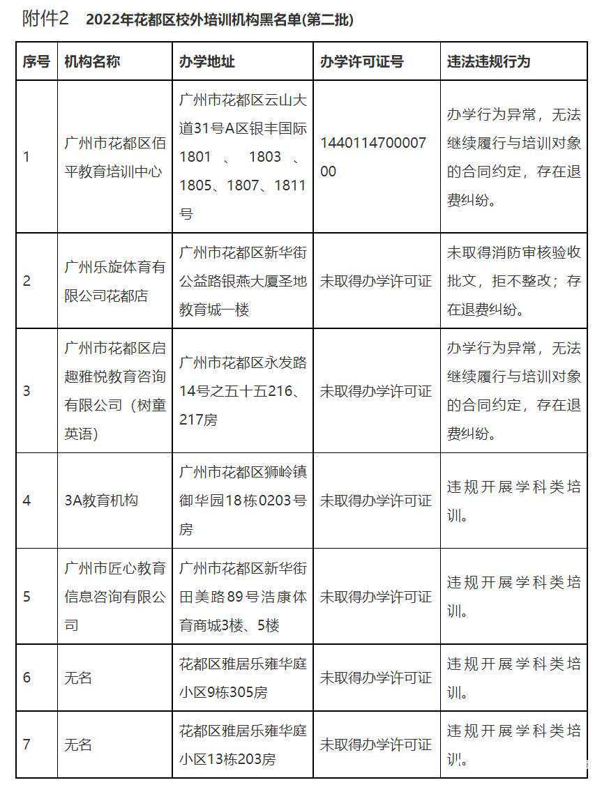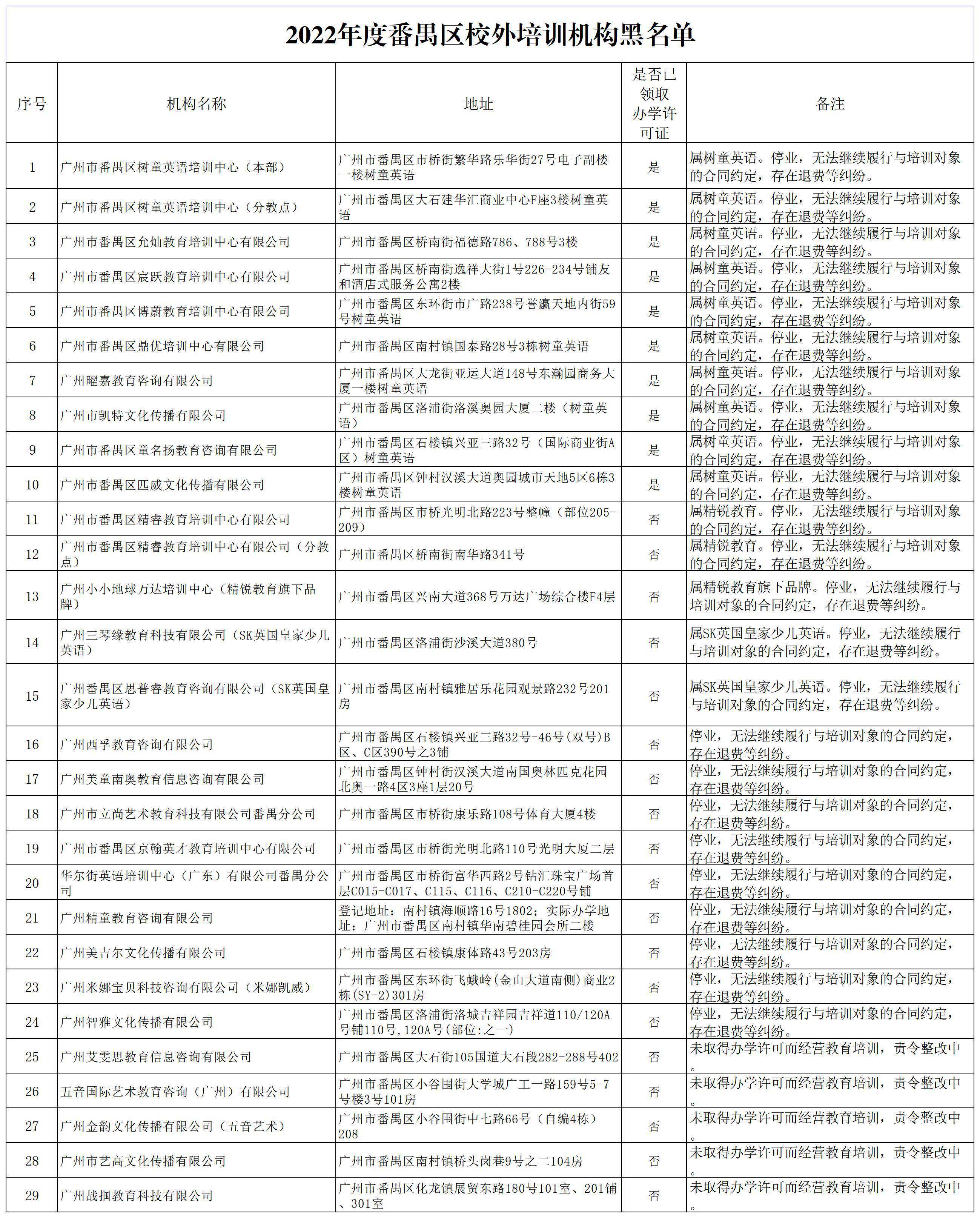 南都讯记者叶斯茗实习生郑纬浩近日,广州多区陆续发布校外培训机构“黑白名单”,希望广大学生家长理性选择合法、有证有照的校外培训机构,避雷“黑名单”里的问题培训机构,有效维护自身权益。 越秀区 7月20日,越秀区教育局在官网公布了《2022年度越秀区校外培训机构“白名单”》和《2022年度越秀区校外培训机构“黑名单”(第二批)》。共有97家机构上榜“白名单”。 其中,广州市赢点文化信息咨询有限公司和广州市卓贝教育信息咨询有限公司因虚假宣传学科类培训被越秀区教育局列入了“黑名单”。 海珠区 海珠区教育局向社会公布2022年度海珠区校外培训机构白名单和黑名单(第二批),其中公布白名单172家,而海珠区海伦奥格雷迪戏剧培训中心、海珠区致德教育培训中心有限公司、海珠区熙励教育培训中心和一家无名机构上榜黑名单。 白云区 7月20日,白云区教育局发布《广州市白云区校外培训机构专项治理办公室关于白云区辖内校外培训机构黑白名单有关信息的第十次公告》,面向社会公布白云区校外培训机构“黑白名单”,其中上榜黑名单的机构有11家。 荔湾区 7月26日,荔湾区教育局公布《荔湾区校外培训机构黑白名单》。共有40家机构上榜“白名单”,14家机构上榜“黑名单”。 天河区 7月27日,广州市天河区教育局公布了天河区2022年第二批校外培训机构“黑白名单”。其中“白名单”涵盖了共105家校外培训机构,有3家机构进入了“黑名单”,分别是乐学书苑及2家无名称机构。 番禺区 7月27日,番禺区教育局在官网公布《2022年度番禺区校外培训机构白名单和黑名单》。其中共有177家培训机构被列入“白名单”。 有24家培训机构因无法继续履行与培训对象的合同约定,存在退费等纠纷被列入“黑名单”,5家培训机构因未取得办学许可而经营教育培训被列入“黑名单”。 黄埔区 7月27日,黄浦区教育局发布《2022年黄埔区第二批校外培训机构黑白名单》,并表示将对校外培训机构“黑白名单”实行动态管理。 广州市黄埔区立尚培训中心有限公司因无法继续履行与培训对象的合同约定,存在退费等纠纷被列入“黑名单”。 增城区 增城区去教育局公布《增城区校外培训机构黑白名单》,共92家校外培训机构上榜“白名单”,12家机构上榜“黑名单”。 花都区 花都区教育局向社会公布《2022年花都区校外培训机构白名单》和《2022年花都区校外培训机构黑名单(第二批)》,共108家校外培训机构上榜“白名单”,7家校外培训机构上榜“黑名单”。 广州市花都区佰平教育培训中心、广州乐旋体育有限公司花都店和广州市花都区启趣雅悦教育咨询有限公司(树童英语)由于办学行为异常,无法继续履行与培训对象的合同约定,存在退费纠纷等原因被列入“黑名单”。3A教育机构、广州市匠心教育信息咨询有限公司及两家无名称机构,因违规开展学科类培训被列入“黑名单”。 南沙区 7月19日,南沙区教育局面向社会发布《南沙区校外培训机构正常经营名单、预警名单、已注销名单》。