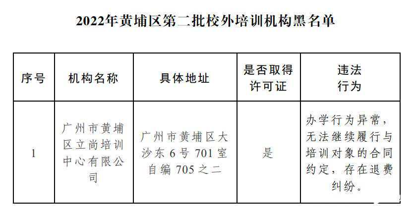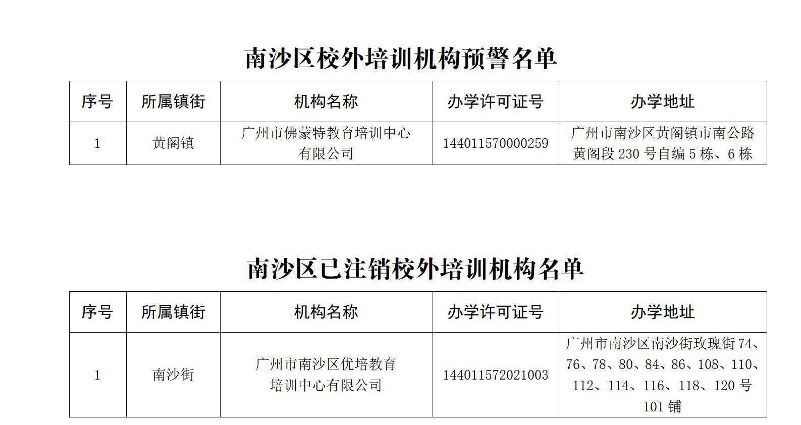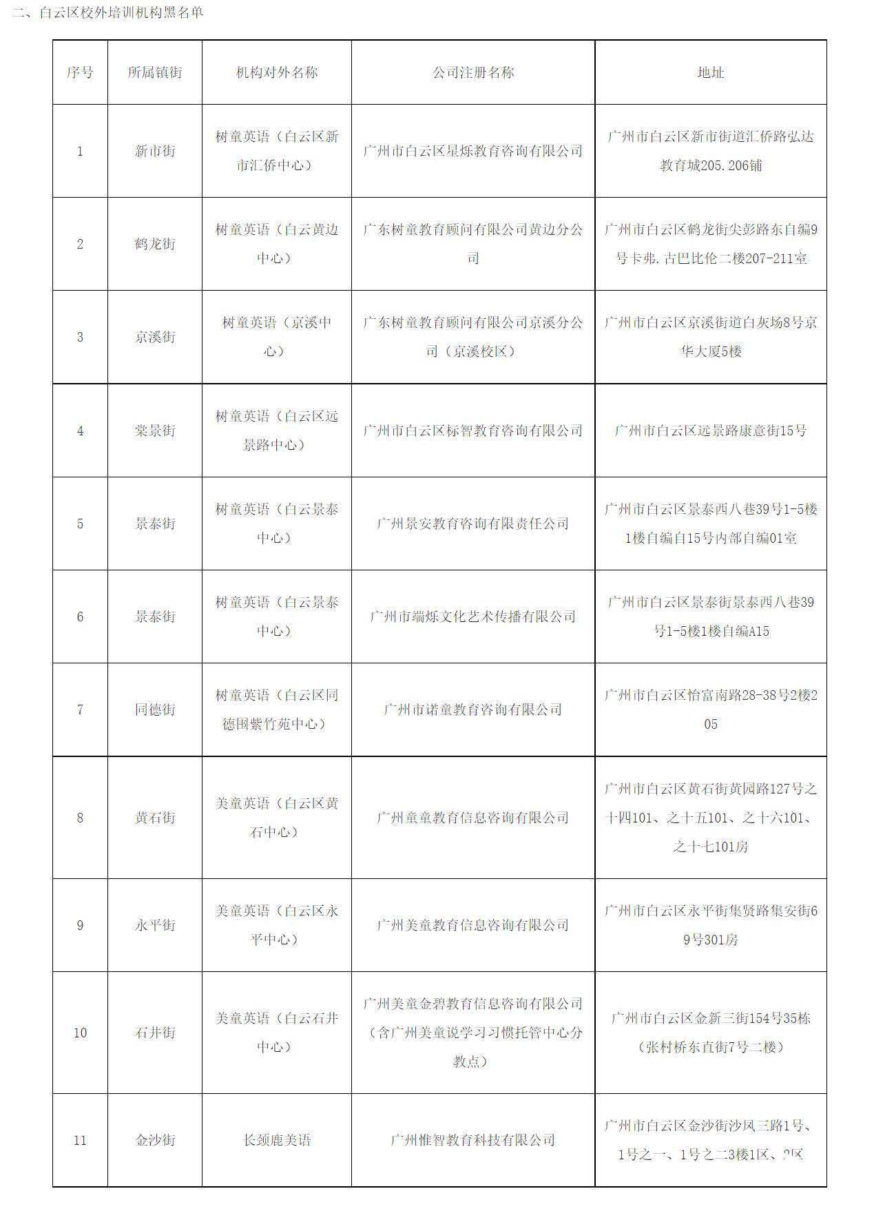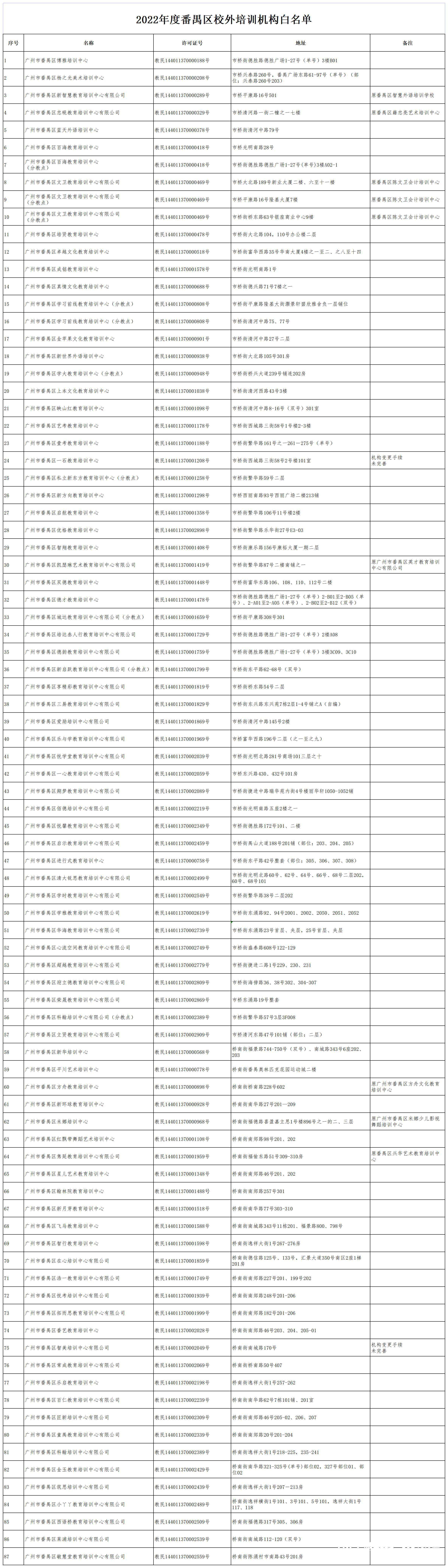 南都讯记者叶斯茗实习生郑纬浩近日,广州多区陆续发布校外培训机构“黑白名单”,希望广大学生家长理性选择合法、有证有照的校外培训机构,避雷“黑名单”里的问题培训机构,有效维护自身权益。 越秀区 7月20日,越秀区教育局在官网公布了《2022年度越秀区校外培训机构“白名单”》和《2022年度越秀区校外培训机构“黑名单”(第二批)》。共有97家机构上榜“白名单”。 其中,广州市赢点文化信息咨询有限公司和广州市卓贝教育信息咨询有限公司因虚假宣传学科类培训被越秀区教育局列入了“黑名单”。 海珠区 海珠区教育局向社会公布2022年度海珠区校外培训机构白名单和黑名单(第二批),其中公布白名单172家,而海珠区海伦奥格雷迪戏剧培训中心、海珠区致德教育培训中心有限公司、海珠区熙励教育培训中心和一家无名机构上榜黑名单。 白云区 7月20日,白云区教育局发布《广州市白云区校外培训机构专项治理办公室关于白云区辖内校外培训机构黑白名单有关信息的第十次公告》,面向社会公布白云区校外培训机构“黑白名单”,其中上榜黑名单的机构有11家。 荔湾区 7月26日,荔湾区教育局公布《荔湾区校外培训机构黑白名单》。共有40家机构上榜“白名单”,14家机构上榜“黑名单”。 天河区 7月27日,广州市天河区教育局公布了天河区2022年第二批校外培训机构“黑白名单”。其中“白名单”涵盖了共105家校外培训机构,有3家机构进入了“黑名单”,分别是乐学书苑及2家无名称机构。 番禺区 7月27日,番禺区教育局在官网公布《2022年度番禺区校外培训机构白名单和黑名单》。其中共有177家培训机构被列入“白名单”。 有24家培训机构因无法继续履行与培训对象的合同约定,存在退费等纠纷被列入“黑名单”,5家培训机构因未取得办学许可而经营教育培训被列入“黑名单”。 黄埔区 7月27日,黄浦区教育局发布《2022年黄埔区第二批校外培训机构黑白名单》,并表示将对校外培训机构“黑白名单”实行动态管理。 广州市黄埔区立尚培训中心有限公司因无法继续履行与培训对象的合同约定,存在退费等纠纷被列入“黑名单”。 增城区 增城区去教育局公布《增城区校外培训机构黑白名单》,共92家校外培训机构上榜“白名单”,12家机构上榜“黑名单”。 花都区 花都区教育局向社会公布《2022年花都区校外培训机构白名单》和《2022年花都区校外培训机构黑名单(第二批)》,共108家校外培训机构上榜“白名单”,7家校外培训机构上榜“黑名单”。 广州市花都区佰平教育培训中心、广州乐旋体育有限公司花都店和广州市花都区启趣雅悦教育咨询有限公司(树童英语)由于办学行为异常,无法继续履行与培训对象的合同约定,存在退费纠纷等原因被列入“黑名单”。3A教育机构、广州市匠心教育信息咨询有限公司及两家无名称机构,因违规开展学科类培训被列入“黑名单”。 南沙区 7月19日,南沙区教育局面向社会发布《南沙区校外培训机构正常经营名单、预警名单、已注销名单》。