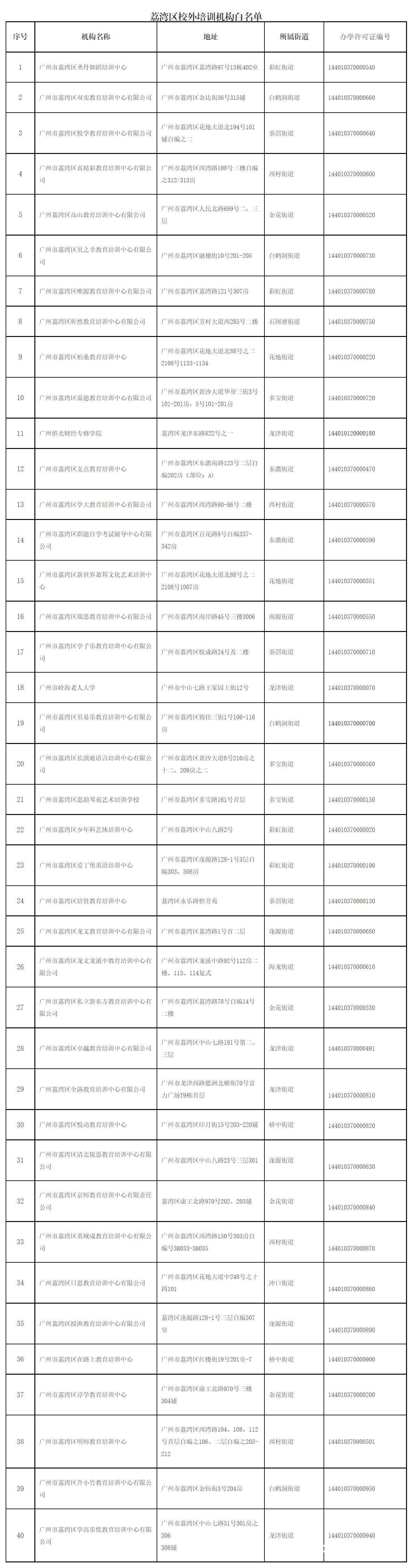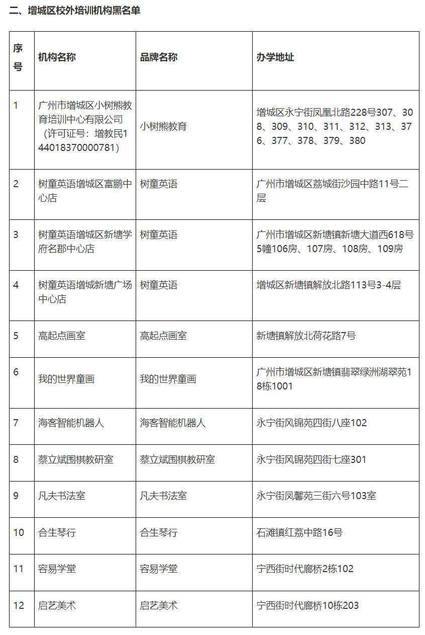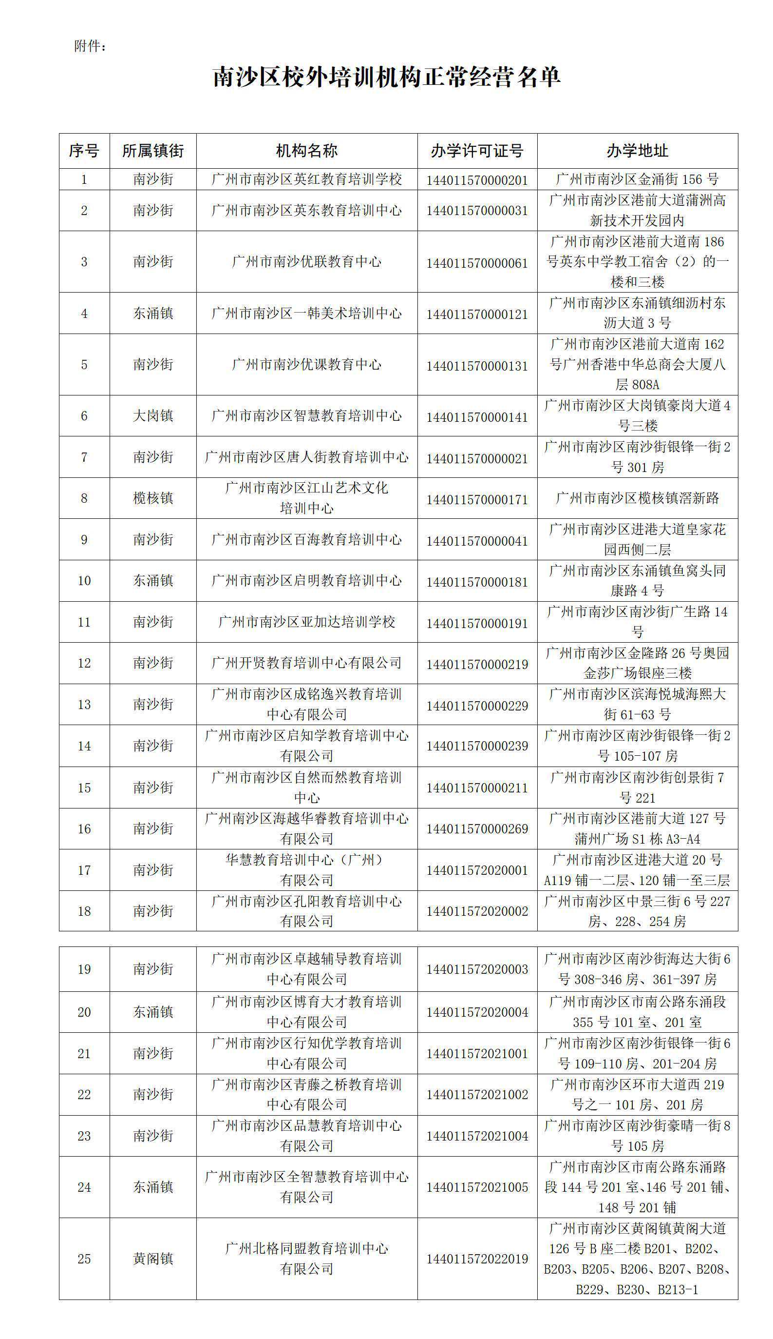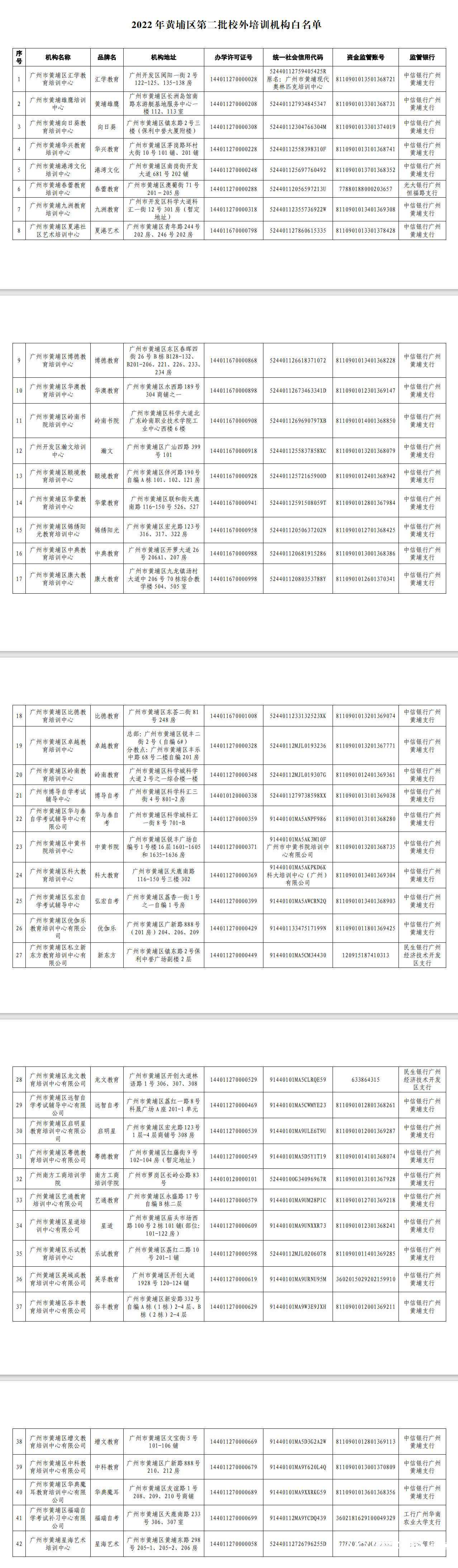 南都讯记者叶斯茗实习生郑纬浩近日,广州多区陆续发布校外培训机构“黑白名单”,希望广大学生家长理性选择合法、有证有照的校外培训机构,避雷“黑名单”里的问题培训机构,有效维护自身权益。 越秀区 7月20日,越秀区教育局在官网公布了《2022年度越秀区校外培训机构“白名单”》和《2022年度越秀区校外培训机构“黑名单”(第二批)》。共有97家机构上榜“白名单”。 其中,广州市赢点文化信息咨询有限公司和广州市卓贝教育信息咨询有限公司因虚假宣传学科类培训被越秀区教育局列入了“黑名单”。 海珠区 海珠区教育局向社会公布2022年度海珠区校外培训机构白名单和黑名单(第二批),其中公布白名单172家,而海珠区海伦奥格雷迪戏剧培训中心、海珠区致德教育培训中心有限公司、海珠区熙励教育培训中心和一家无名机构上榜黑名单。 白云区 7月20日,白云区教育局发布《广州市白云区校外培训机构专项治理办公室关于白云区辖内校外培训机构黑白名单有关信息的第十次公告》,面向社会公布白云区校外培训机构“黑白名单”,其中上榜黑名单的机构有11家。 荔湾区 7月26日,荔湾区教育局公布《荔湾区校外培训机构黑白名单》。共有40家机构上榜“白名单”,14家机构上榜“黑名单”。 天河区 7月27日,广州市天河区教育局公布了天河区2022年第二批校外培训机构“黑白名单”。其中“白名单”涵盖了共105家校外培训机构,有3家机构进入了“黑名单”,分别是乐学书苑及2家无名称机构。 番禺区 7月27日,番禺区教育局在官网公布《2022年度番禺区校外培训机构白名单和黑名单》。其中共有177家培训机构被列入“白名单”。 有24家培训机构因无法继续履行与培训对象的合同约定,存在退费等纠纷被列入“黑名单”,5家培训机构因未取得办学许可而经营教育培训被列入“黑名单”。 黄埔区 7月27日,黄浦区教育局发布《2022年黄埔区第二批校外培训机构黑白名单》,并表示将对校外培训机构“黑白名单”实行动态管理。 广州市黄埔区立尚培训中心有限公司因无法继续履行与培训对象的合同约定,存在退费等纠纷被列入“黑名单”。 增城区 增城区去教育局公布《增城区校外培训机构黑白名单》,共92家校外培训机构上榜“白名单”,12家机构上榜“黑名单”。 花都区 花都区教育局向社会公布《2022年花都区校外培训机构白名单》和《2022年花都区校外培训机构黑名单(第二批)》,共108家校外培训机构上榜“白名单”,7家校外培训机构上榜“黑名单”。 广州市花都区佰平教育培训中心、广州乐旋体育有限公司花都店和广州市花都区启趣雅悦教育咨询有限公司(树童英语)由于办学行为异常,无法继续履行与培训对象的合同约定,存在退费纠纷等原因被列入“黑名单”。3A教育机构、广州市匠心教育信息咨询有限公司及两家无名称机构,因违规开展学科类培训被列入“黑名单”。 南沙区 7月19日,南沙区教育局面向社会发布《南沙区校外培训机构正常经营名单、预警名单、已注销名单》。
