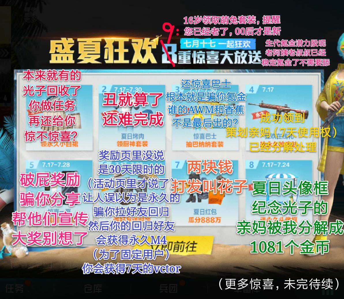 大家好,欢迎来到由小鱼干开讲的《精英聊天室》,又到了每天的“炒冷饭”时间,但本期可能是本月最后一期的“炒冷饭”了,因为3月18日,和平精英体验服就要开服,3月19日或者20日,火箭少女101的相关军需就要出来。 因此,明天开始小鱼干估计就有得忙了,在这里也要提醒抢到了体验服资格的玩家,明天也就是3月18日,体验服就要开服,同时也可以留意小鱼干第一时间为大家带来的测评! 本期话题:曾引玩家集体愤怒的“717事件”,“16兔”成导火索! 如果你现在,看到有人留言“16兔”,那么他正是这次“717事件”的见证者。 7月17日的“盛夏狂欢季”,光子给玩家们准备了9个活动,然而这9个活动,没有一个让玩家们满意的,全是满满的套路。最上面这张图,就是一位玩家为这9个活动所做的“点评”。 第一个活动,是完成任务免费领小白裙。但你知道这个小白裙是哪里来的吗?正是玩家自己的,玩家在刺激战场已经获得的小白裙,和平精英却把它强制回收了,然后在这个活动中,需要完成任务才能获得! 这样的操作,玩家们能不愤怒吗?小白裙本来就是玩家有的,现在光子却把它强制回收了,要再做一次任务才能“还给你”,真的是绝了! 如果说小白裙的活动,对于那些刺激战场时没有小白裙的玩家还算惊喜,那么“16兔”就彻底引爆了玩家们的怒火。“717”那天,忽然传出来大量玩家领取到一款新套装“萌酷兔限定”的消息。 当玩家们了解后,才发现只有刚满16岁的玩家才能领,本来这也没什么好嫉妒的,关键是这款“萌酷兔限定”,长得和“狂战萌兔”太像了,要知道很多玩家入手“狂战萌兔”是实打实花了点券的,现在却给这部分玩家免费送了一套差不多的套装,这能让人满意吗? 还有一些活动,大家应该还有印象,通过第一张图片,玩家的“点评”就能大概了解了,比如上面的“烤肉大师”活动,这套“滨海厨神”套装不仅丑,任务还难完成。 “惊喜巴士”相信大家还有印象,采用的是不重复,且“香蕉币”递增的抽取方式,然而“特工巴纳纳”套装和香蕉AWM,基本上就没有玩家不是最后两个出来的,这也配称为“惊喜”? 还有一些奖励,包括限时7天的M416皮肤,需要分享N个好友才能获得的粗制滥造服装以及7天Vector皮肤,毫无亮点的头像框,以及概率低到离谱的抽取活动,这些都进一步引发了玩家的怒火。 本来光子要送“福利”,玩家们是没意见的,但采用这种看似大方,实则套路满满的活动,玩家们能不愤怒吗?在“717事件”后的很长一段时间,光子的留言区都是骂声一片,并且“16兔”的留言,也从来没有停止过。 那么以上就是本期《精英聊天室》的全部内容了,原创手打不易,给小鱼干点个赞再走吧! 截图看看你的本命地点在哪~