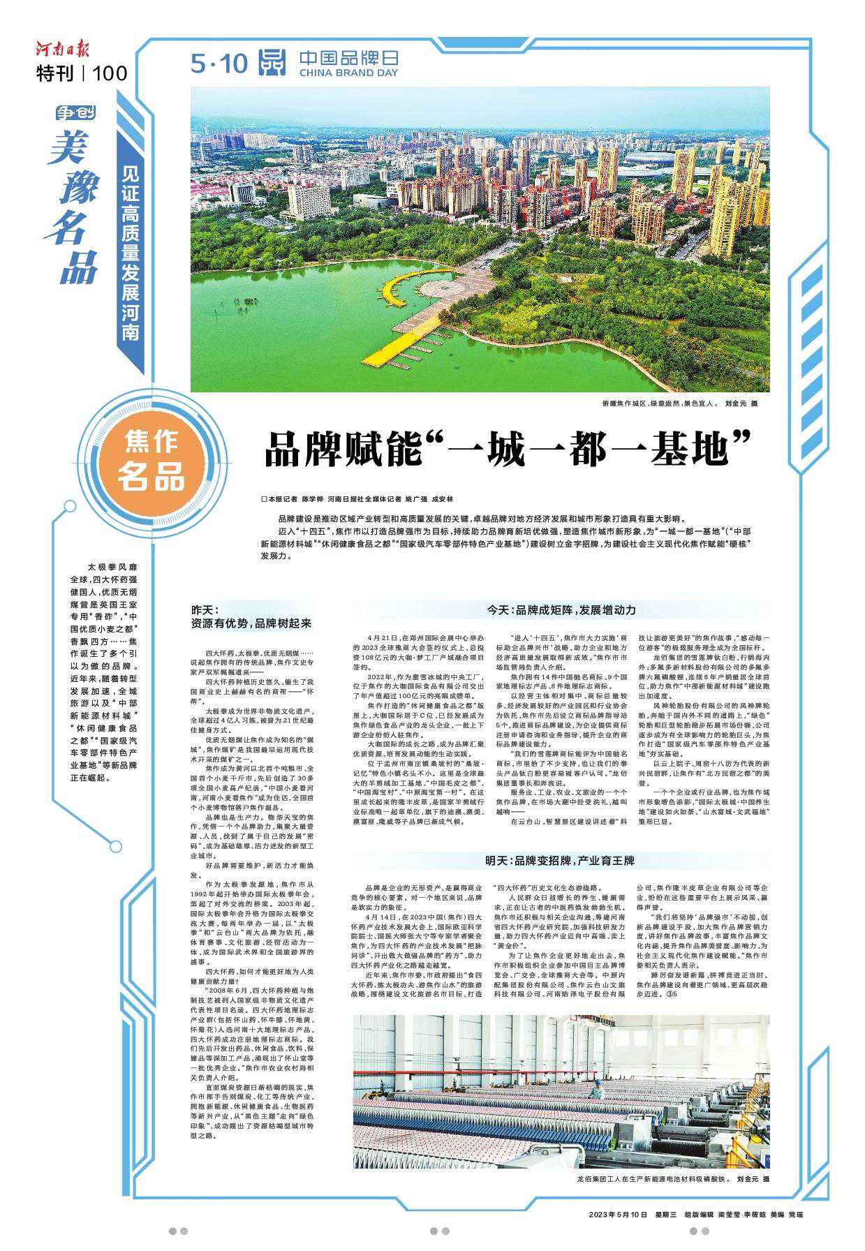 《》(2023年05月10日第T100版) 太极拳风靡全球,四大怀药强健国人,优质无烟煤曾是英国王室专用“香砟”,“中国优质小麦之都”香飘四方……焦作诞生了多个引以为傲的品牌。近年来,随着转型发展加速,全域旅游以及“中部新能源材料城”“休闲健康食品之都”“国家级汽车零部件特色产业基地”等新品牌正在崛起。 品牌建设是推动区域产业转型和高质量发展的关键,卓越品牌对地方经济发展和城市形象打造具有重大影响。迈入“十四五”,焦作市以打造品牌强市为目标,持续助力品牌育新培优做强,塑造焦作城市新形象,为“一城一都一基地”(“中部新能源材料城”“休闲健康食品之都”“国家级汽车零部件特色产业基地”)建设树立金字招牌,为建设社会主义现代化焦作赋能“硬核”发展力。 昨天:资源有优势,品牌树起来 四大怀药、太极拳、优质无烟煤……说起焦作拥有的传统品牌,焦作文史专家严双军娓娓道来—— 四大怀药种植历史悠久,催生了我国商业史上赫赫有名的商帮——“怀帮”。 太极拳成为世界非物质文化遗产,全球超过4亿人习练,被誉为21世纪最佳健身方式。 优质无烟煤让焦作成为知名的“煤城”,焦作煤矿是我国最早运用现代技术开采的煤矿之一。 焦作成为黄河以北首个吨粮市、全国首个小麦千斤市,先后创造了30多项全国小麦高产纪录,“中国小麦看河南,河南小麦看焦作”成为佳话,全国首个小麦博物馆落户焦作温县。 品牌也是生产力。物华天宝的焦作,凭借一个个品牌助力,集聚大量资源、人员,找到了属于自己的发展“密码”,成为基础雄厚、活力迸发的新型工业城市。 好品牌需要维护,新活力才能焕发。 作为太极拳发源地,焦作市从1992年起开始举办国际太极拳年会,架起了对外交流的桥梁。2003年起,国际太极拳年会升格为国际太极拳交流大赛,每两年举办一届,以“太极拳”和“云台山”两大品牌为依托,融体育赛事、文化旅游、经贸活动为一体,成为国际武术界和全国旅游界的盛事。 四大怀药,如何才能更好地为人类健康贡献力量? “2008年6月,四大怀药种植与炮制技艺被列入国家级非物质文化遗产代表性项目名录。四大怀药地理标志产业群(包括怀山药、怀牛膝、怀地黄、怀菊花)入选河南十大地理标志产品,四大怀药成功注册地理标志商标。我们先后开发出药品、休闲食品、饮料、保健品等深加工产品,涌现出了怀山堂等一批优秀企业。”焦作市农业农村局相关负责人介绍。 直面煤炭资源日渐枯竭的现实,焦作市挥手告别煤炭、化工等传统产业,拥抱新能源、休闲健康食品、生物医药等新兴产业,从“黑色主题”走向“绿色印象”,成功蹚出了资源枯竭型城市转型之路。 今天:品牌成矩阵,发展增动力 4月21日,在郑州国际会展中心举办的2023全球豫商大会签约仪式上,总投资108亿元的大咖·梦工厂产城融合项目签约。 2022年,作为蜜雪冰城的中央工厂,位于焦作的大咖国际食品有限公司交出了年产值超过100亿元的亮眼成绩单。 焦作打造的“休闲健康食品之都”版图上,大咖国际居于C位,已经发展成为焦作绿色食品产业的龙头企业,一批上下游企业纷纷入驻焦作。 大咖国际的成长之路,成为品牌汇聚优质资源、培育发展动能的生动实践。 位于孟州市南庄镇桑坡村的“桑坡·记忆”特色小镇名头不小。这里是全球最大的羊剪绒加工基地、“中国毛皮之都”、“中国淘宝村”、“中原淘宝第一村”。在这里成长起来的隆丰皮草,是国家羊剪绒行业标准唯一起草单位,旗下的迪澳、澳美、澳富丽、隆威等子品牌已渐成气候。 “进入‘十四五’,焦作市大力实施‘商标助企品牌兴市’战略,助力企业和地方经济高质量发展取得新成效。”焦作市市场监管局负责人介绍。 焦作拥有14件中国驰名商标、9个国家地理标志产品、8件地理标志商标。 以经营主体相对集中、商标总量较多、经济发展较好的产业园区和行业协会为依托,焦作市先后设立商标品牌指导站5个,推进商标品牌建设,为企业提供商标注册申请咨询和业务指导,提升企业的商标品牌建设能力。 “我们的雪莲牌商标能评为中国驰名商标,市里给了不少支持,也让我们的拳头产品钛白粉更容易被客户认可。”龙佰集团董事长和奔流说。 服务业、工业、农业、文旅业的一个个焦作品牌,在市场大潮中经受洗礼,越叫越响—— 在云台山,智慧景区建设讲述着“科技让旅游更美好”的焦作故事,“感动每一位游客”的极致服务理念成为全国标杆。 龙佰集团的雪莲牌钛白粉,行销海内外;多氟多新材料股份有限公司的多氟多牌六氟磷酸锂,连续8年产销量居全球首位,助力焦作“中部新能源材料城”建设跑出加速度。 风神轮胎股份有限公司的风神牌轮胎,奔驰于国内外不同的道路上,“绿色”轮胎和巨型轮胎稳步拓展市场份额,公司逐步成为有全球影响力的轮胎巨头,为焦作打造“国家级汽车零部件特色产业基地”夯实基础。 以云上院子、周窑十八坊为代表的新兴民宿群,让焦作有“北方民宿之都”的美誉。 一个个企业或行业品牌,也为焦作城市形象增色添彩,“国际太极城·中国养生地”建设如火如荼,“山水富城·文武福地”雏形已显。 明天:品牌变招牌,产业育王牌 品牌是企业的无形资产,是赢得商业竞争的核心要素。对一个地区来说,品牌是软实力的象征。 4月14日,在2023中