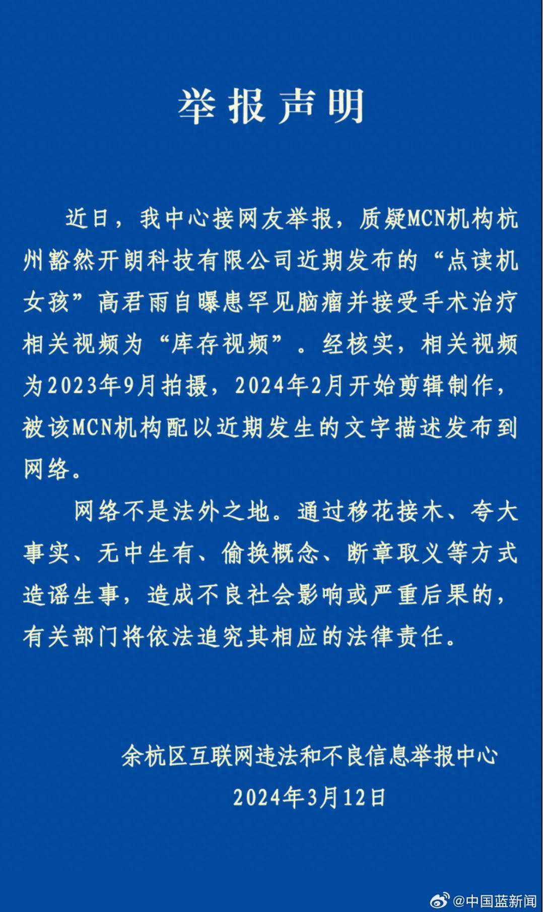 北京市高朋(南京)律师事务所魏增律师则告诉记者,第一、网络并非法外之地,民事主体的网络行为依然应当遵循法律法规规定,并遵循如“诚实信用”等一般民事法律行为准则。虽然民事主体在网络空间享有言论自由,有权在网络中披露和介绍自己的生活,但是网络行为应当遵循诚信原则,而不应当为博取流量编造或炒作矫情滥情、低俗媚俗等负面信息。 第二、民事主体应当为其网络行为承担法律责任。根据网络实名制的相关规定,网络账号的注册人应当为该账号的网络行为负责;如果网络账号由他人控制或代管,则网络行为的行为人和账号所有人都应当为网络行为承担相应的责任。对于本新闻事件,尚未见有诈捐或其他违法犯罪行为,但高君雨母亲仅凭一句“账号一直由签约公司代管”便试图撇清账号主体与本次事件的关系,显然无法实现。 扬子晚报/紫牛新闻记者张楠 编辑/弓立芳