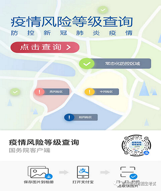 各位考生: 2022年成人高等学校招生全国统一考试(以下简称成人高考)将于11月5日至6日举行。为保障广大考生和考试工作人员的生命安全和身体健康,做好常态化疫情防控下的考试组织实施,所有考生须在考前14天、考前7天进行个人防疫信息申报,现将相关要求通告如下: 一、个人防疫信息申报 (一)申报时间 1.考前14天:10月20日08:00时-10月21日24:00时。 2.考前7天:10月27日08:00时-10月28日24:00时。 (二)申报流程 二、相关要求 (一)考生应如实填报防疫信息,如因隐瞒行程、隐瞒病情、故意压制症状、瞒报漏报健康情况等不配合防疫工作造成严重后果的,由本人承担相应的法律责任。 (二)所有考生须按时完成考前14天、考前7天个人防疫信息申报。没有按要求完成申报的,视为自行放弃本次考试,考生将无法在报名系统内打印准考证。 (三)考前14天起,请所有考生每天自觉进行体温测量,通过微信公众号“信用青海”实名申领信康码和行程卡。 (四)建议考生提前咨询了解当前居住地及参考地相关疫情防控政策,严格遵守属地化疫情防控要求,提前做好应考准备。 (五)若考生信康码、行程卡在考前7天个人防疫信息申报结束后转为非绿色的,必须第一时间向报考考区电话报备(报备联系方式详见附件2),按考区属地化疫情防控政策和考务管理规定应考。 青海省教育招生考试院 2022年10月19日 附件1 所在地疫情风险等级查询方法 步骤:手机打开支付宝→扫一扫→扫描下方二维码 附件2 青海省2022年成人高考各考区(报名点)咨询报备电话