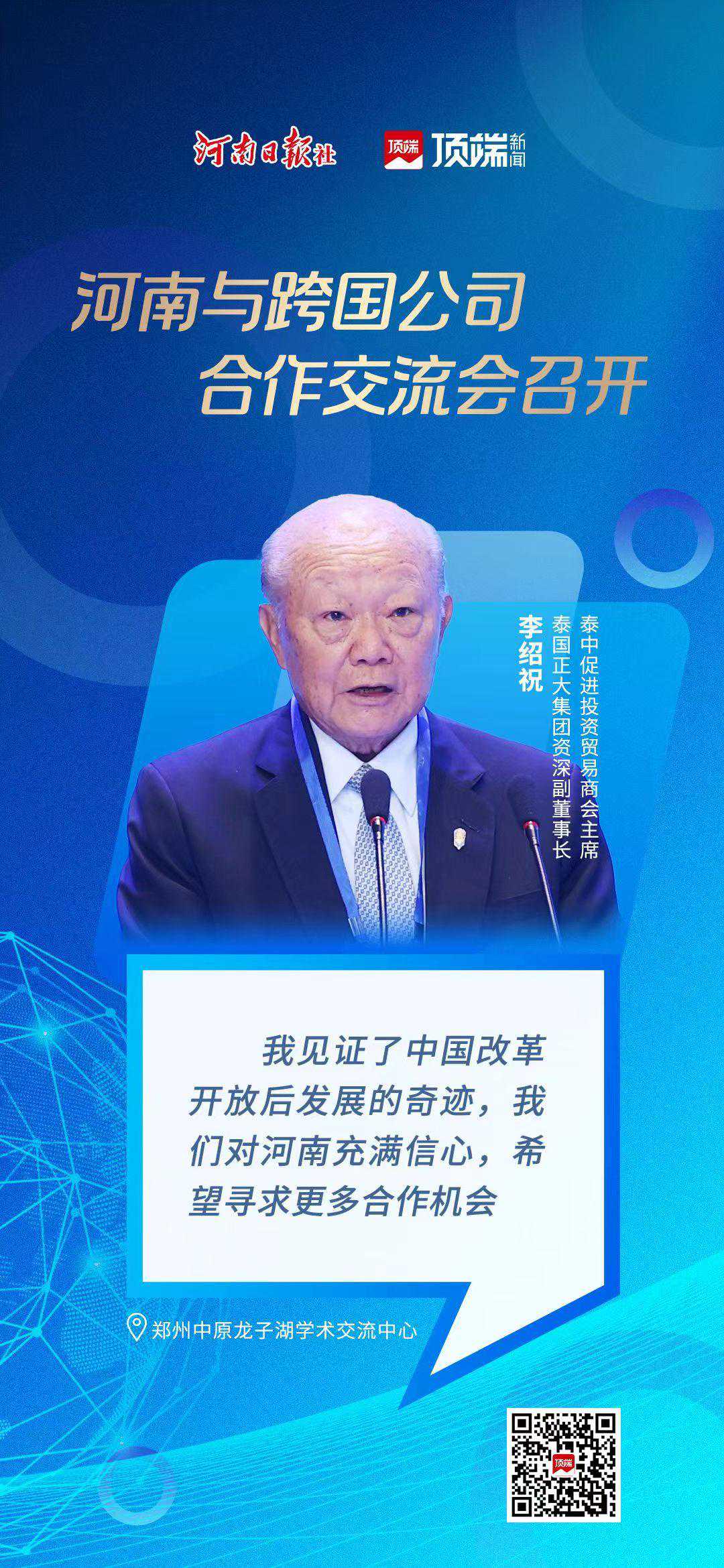 顶端新闻首席记者杨桂芳记者郝瑞铃/文宋亚猛/图 投资河南,“跨”享未来。9月6日,河南与跨国公司合作交流会在中原龙子湖学术交流中心举办。在交流会上,泰中促进投资贸易商会主席、泰国正大集团资深副董事长李绍祝做主旨发言。 正大集团在河南累计投资超400亿元 李绍祝说,自中国改革开放后,作为第一批来华经商的泰国企业家,自己见证了中国发展的奇迹,并认为当下的中国是世界科技及创新的领导者。 据介绍,在泰中促进投资贸易商会成员中,正大集团是最早来中国投资的,也是最早来河南投资的企业,正大集团1985年来河南投资建厂,30多年来,至今已在河南省投资40多家企业,投资项目涉及工业制造、生物制药以及现代化农牧业一条龙全产业链项目,累计总投资超400亿元。 在加强与河南投资方面,李绍祝表示:“我们对河南充满信心”。 李绍祝说:“我们希望在新能源汽车及核心部件、动力电池、储能设备等新能源相关产业,以及在国际化商业、服务业、新文旅、生物制药、农牧食品等方面,寻求更多的合作机会。” 他还对河南的智慧农业十分感兴趣,认为河南和泰国企业之间有非常广阔的合作空间,比如泰国盛产水果、海产品等,河南有丰富的农产品和资源性原材料。 泰国与河南文化旅游互补性很强 李绍祝很看重河南悠久的历史文化,对黄帝故里、少林寺、龙门石窟、包公府等著名景点,以及洛阳牡丹等都很熟悉。 “泰国,对东南亚国家和欧洲国家有很大的吸引力。”李绍祝说,泰国有独特的文化和海滨自然风光,有泰国美食,有完善的国际旅游服务体系,每年入境游客有4000多万人,其中近2000万来自西方国家。 李绍祝认为,泰国与河南文化旅游互补性很强。“我们乐意帮助推动泰国几家国际航空公司开通至河南的直航,把到泰国旅游的一部分国际游客引导到河南来,一定会有效地促进双向文化旅游交流合作。与此同时,我们也乐意帮忙推动引入国际知名品牌酒店及管理体系,以满足日益增长的旅游配套需求。”