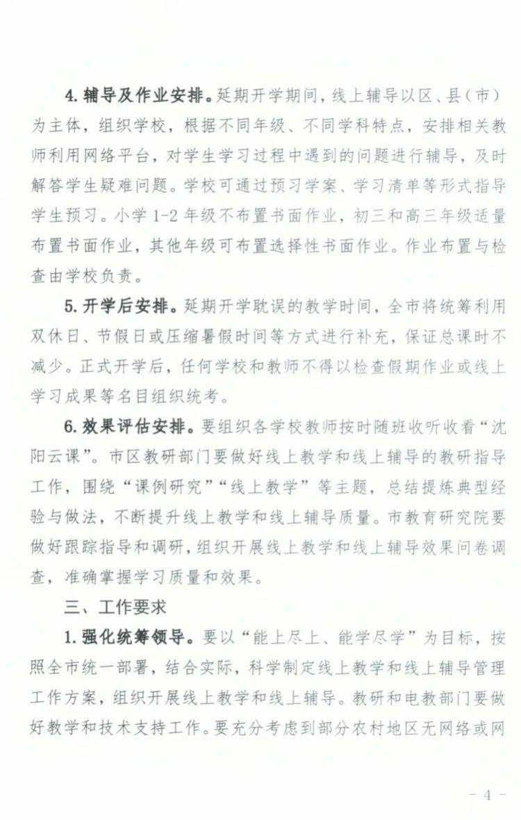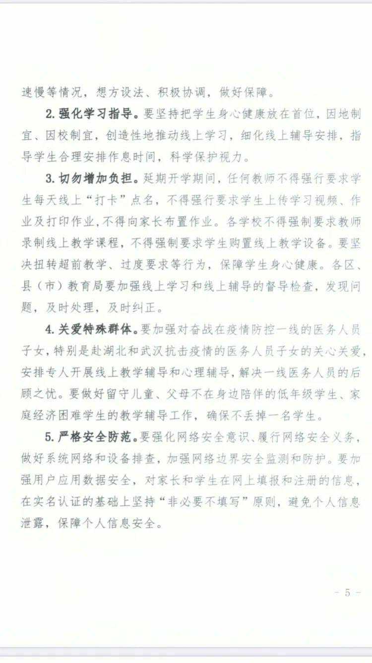 3月2日开始,全市中小学进行线上教学和线上辅导。线上教学内容将通过有线电视、互联网电视和网络播放平台播出。 其中,小学1-2年级每天3课时,3-6年级每天4课时,每天9时播出。初中7-9年级每天4课时,每天8:30播出,18时重播。普通高中1-3年级每天5课时,每天8:30播出,教学时间至14时。坚持同一年级同一课表同一授课教师原则,延期开学期间坚持预习性教学,正式开学后各校、各年级、各学科“零起点”教学。延期开学耽误的教学时间,全市将统筹利用双休日、节假日或压缩暑假时间等方式进行补充,保证总课时不减少。