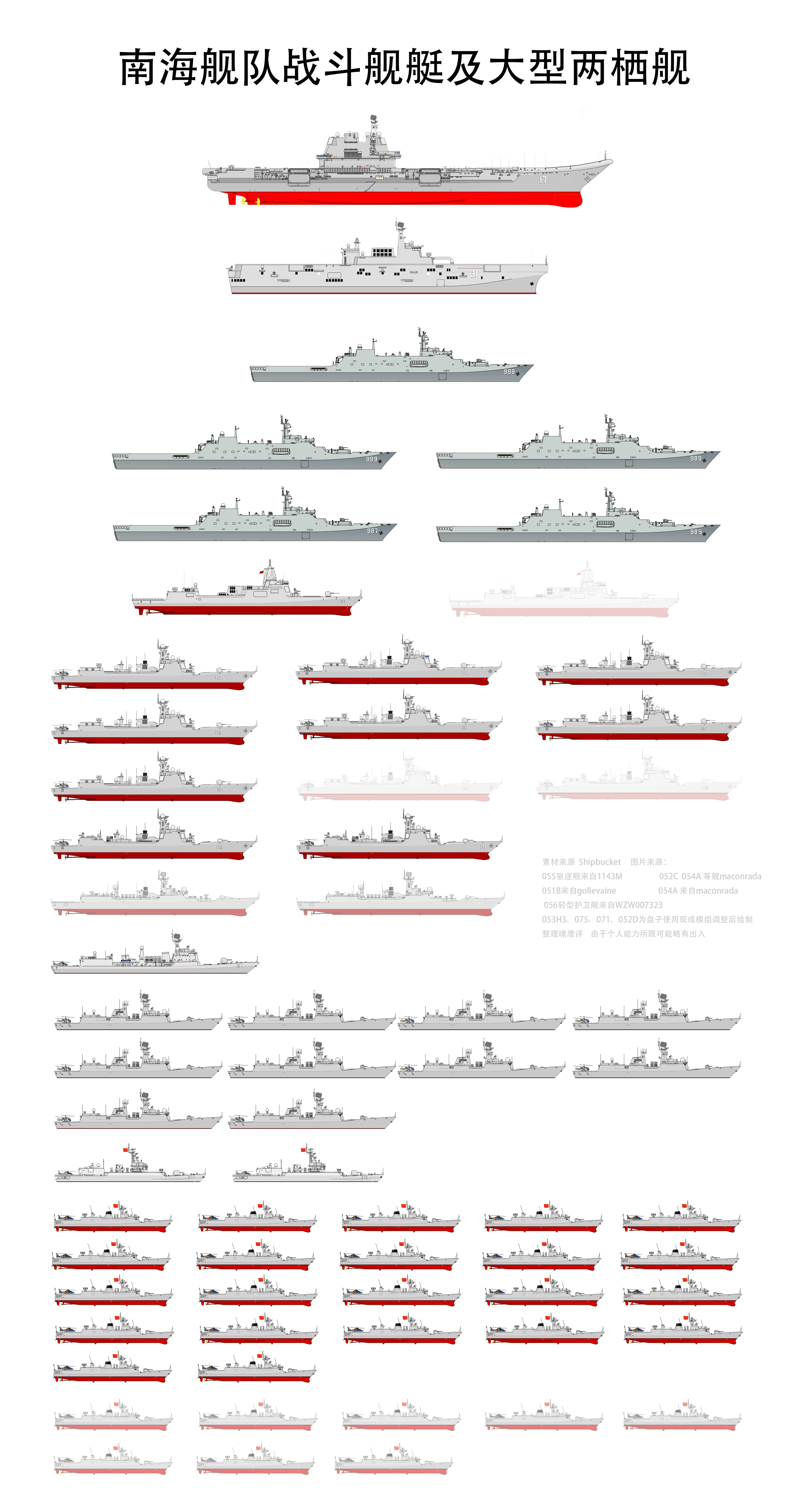过去的两天,盘子先后盘点了东海舰队与北海舰队,东海舰队受制于狭小的台海,在实力碾压台湾之后就进入了低速发展期,以至于东海舰队成为了今日海军当中唯一没有大型载机舰的舰队。北海舰队直面日本海自与第七舰队,因此北海舰队成为了当今时代先进水面舰艇优先配给的方向,成为了全军第一个配属航母的舰队,而且4艘055北海舰队独享其三。那么负责镇守万里石塘的南海舰队在2021年即将结束的今天实力如何呢? 献上画了一天的图: 南海舰队战斗舰及大型两栖舰一览图(2021) 东海舰队负责镇守的是万里石塘,辖区很大,东南亚诸国肆意侵占中国的岛礁,南海舰队的任务很是繁重,现如今的南海舰队是中国海军体系之下唯一拥有两款大型载机舰的舰队,承担着战时拦截从马六甲海峡方向而来的美国航母,防御从菲律宾印尼等方向偷袭的日美舰队的重任,拥有着独立抗衡美国第五舰队的实力。 现如今的南海舰队拥有一艘航母,一艘两栖攻击舰,10艘盾舰,2艘老式区域防空舰,11艘装备红旗-16防空导弹的准区域防空舰,31艘中小型护卫舰,毫不夸张的说,南海舰队拥有世界第三的强的水面舰艇编队。 前排提示,大多数舰艇均标明了服役时间,导致篇幅较长,舰名均已加粗,可以选择阅读重点,忽略服役时间。 055型万吨大驱第一批次的建造数量为8艘,南海舰队、北海舰队各得四艘,其中北海舰队由于需求更加急切,所以服役时间较早的4艘055型万吨大驱中,辽宁、拉萨、鞍山等三舰均划归了北海舰队,南海舰队得到的055仅仅是2021年4月23日海军节当天服役的105大连舰。当然了106延安舰也已经在路上了。 055型万吨大驱的性能就不用说了,S、X、C、L、KU等一连串波段的相控阵雷达已经是独一档的存在的,那112个9米级的850MM直径的冷热共架垂直发射单元更是全球最顶级的垂直发射单元。 比055垂发多的仅仅是垂垂老矣的提康德罗加以及韩国的世宗大王,但是提康德罗加早已行将就木,从外观上判断都能得出提康德罗加性能不如055的结论,韩国的世宗大王除了雷达不如055之外,存在兼容性问题的MK-41垂发与KVLS垂发也是一个相当好笑的故事。所以也是被055摁着抽。 垂垂老矣的提康德罗加 唯一能够在先进性方面与055一较高下的仅仅是美国的DDG-1000朱姆沃尔特级驱逐舰,但是朱姆沃尔特定位错误导致成本数倍于055的前提下,性能却不如055,因此055的综合性能是毋庸置疑的世界第一。南海舰队虽然现阶段只有一艘055,但是还有3艘055在路上呢,所以南海舰队的作战能力是相当的有保障的。 锈迹斑斑的朱姆沃尔特 对于很多国家而言,一支舰队有一艘盾舰就很了不起了,但是中国是那种菜的直抠脚的国家么?那不能啊!南海海舰队除了055型万吨大驱以外,还有7艘性能相当不错的052D型导弹驱逐舰,分别是:2014年3月21日172服役的昆明舰、2015年8月12日173服役的长沙舰、2015年12月12日服役的174合肥舰、2016年7月12日服役的175银川舰。2019年1月12日服役的161呼和浩特舰、2021年4月12日服役的162南宁舰、2021年9月前后服役的164桂林舰。除此以外165湛江舰、163焦作舰两舰已确认归属南海舰队,现阶段属于已下水未服役状态。 长沙舰 052D型导弹驱逐舰装备有一门130MM舰炮,64个HT-1冷热共架垂直发射单元,拥有至少16个9米级别的深坑,除了导弹少了点,其他性能笑傲除DDG-1000和055以外的全部水面舰艇。 合肥舰 南海舰队除了055以及052D驱逐舰之外还有两艘052C导弹驱逐舰,分别是2005年10月18日服役的170兰州舰,2005年12月服役的171海口舰。052C驱逐舰拥有48个蜂窝煤式的冷发射垂直发射单元,要用于搭载红旗-9系列防空导弹。052D与055在执行远程防空任务时,052C除了导弹少了16发外,其他的作战性能与052D相差无几。 兰州舰 但是在多用途能力方面无法搭垂发内无法搭载反潜导弹的052C不如052D,在反舰任务方面,052C虽也有8发倾斜发射的鹰击-62,但是与只要需要就能搭载16发鹰击-18的052D相比还是有些比不过,在近防炮方面,052C拥有的仅仅是前后各两门730近防炮,而052D则是1130近防炮+24联装的HQ-10防空导弹。当然了052D终究是052C的升级型,如果还比不过052C也就不配独立编号了,但是即便如此仍无法掩盖052C是一款相当成功的区域防空舰的事实。 海口舰 并且南海舰队的重要性通过南海舰队有盾舰的优先级就能判断出来,052C型前两艘,052D前四艘、055三号舰都是南海舰队,如此可见南海舰队的优先级真的很高。 南海舰队的常规区域防空舰一览图,未服役舰艇为20%透明度 很久之前画的山东舰舰(架空山东与辽宁弹射化改造的时候画的) 055型万吨大驱是当今世界最为强大的水面战斗舰艇,可以作为无航母编队的旗舰,成为一个舰队的火力核心,但是055型驱逐舰更为重要的身份是航母的一品带刀护卫,055是跟着航母跑的,没有航母就没有075,而南海舰队中被055和052D等星星环绕的月亮就是山东号航空母舰。山东舰是中国首艘国产航母,排水量五万吨级,能够搭载将近30架舰载战斗机,内部舱室的布置比辽宁舰更加合理。山东舰现阶段的出门套装就是山东舰+大连舰+随便来艘052D,酌情一到两艘的054A。 山东舰 而南海舰队相比同样拥有航母的北海舰队而言,南海舰队最大的优势就是南海舰队是中国现阶段唯一一个拥有两栖攻击舰的舰队,2021年4月23日服役的075型两栖攻击舰海南舰,舷号31,075型两攻在人民海军中的定位通过以省为名的舰名即可得知,075是和航母一样