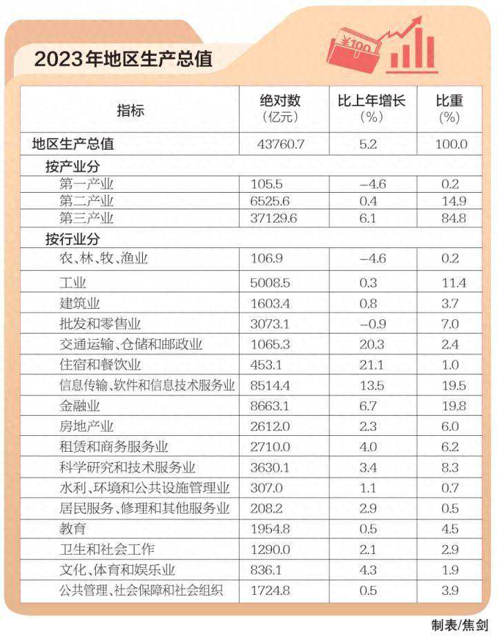 2023年是全面贯彻党的二十大精神开局之年,是三年新冠疫情防控转段后经济恢复发展的一年。面对内外部各种风险挑战,在以习近平同志为核心的党中央坚强领导下,全市坚持以习近平新时代中国特色社会主义思想为指导,全面贯彻党的二十大和二十届二中全会精神,深入贯彻习近平总书记对北京重要讲话精神,认真贯彻落实党中央决策部署,坚持稳中求进工作总基调,完整、准确、全面贯彻新发展理念,深化“五子”联动服务和融入新发展格局,着力提信心、强创新、优功能、促协同、抓治理、惠民生,经济整体回升向好,社会民生保障有力,首都高质量发展扎实推进。 一、综合 初步核算,全年实现地区生产总值43760.7亿元,按不变价格计算,比上年增长5.2%。其中,第一产业增加值105.5亿元,下降4.6%;第二产业增加值6525.6亿元,增长0.4%;第三产业增加值37129.6亿元,增长6.1%。三次产业构成为0.2︰14.9︰84.8。按常住人口计算,全市人均地区生产总值为20.0万元。 年末全市常住人口2185.8万人,比上年末增加1.5万人。其中,城镇人口1919.8万人,占常住人口的比重为87.8%;常住外来人口824.0万人,占常住人口的比重为37.7%。常住人口出生率为5.63‰,死亡率为6.13‰,自然增长率为-0.5‰。全年城镇新增就业28.1万人,城镇调查失业率均值为4.4%。 全年居民消费价格总水平比上年上涨0.4%。工业生产者出厂价格下降0.8%,工业生产者购进价格下降1.3%。农产品生产者价格下降0.3%。12月份,新建商品住宅销售价格环比指数为100.0、同比指数为101.7;二手住宅销售价格环比指数为98.8、同比指数为97.8。 全年完成一般公共预算收入6181.1亿元,比上年增长8.2%。其中,税收收入5357.1亿元,增长10.1%。全市一般公共预算支出7971.6亿元,比上年增长6.7%。全年累计新增减税降费及退税缓费971.7亿元。 新兴动能发展壮大。建设全球数字经济标杆城市,全年实现数字经济增加值18766.7亿元,按现价计算,比上年增长8.5%,占地区生产总值的比重为42.9%,比上年提高1.3个百分点。其中,数字经济核心产业增加值11061.5亿元,增长10.8%,占地区生产总值的比重为25.3%,提高1.3个百分点。全年实现高技术产业增加值11875.4亿元,按现价计算,增长7.1%,占地区生产总值的比重为27.1%,提高0.4个百分点。全年新设科技型企业12.3万家,增长15.9%,占全市新设企业的41.4%。 经济活力持续增强。推出北京市营商环境6.0版改革任务,制定实施“北京服务”意见和促进民营经济发展壮大行动方案,完善“服务包”“服务管家”机制。全年新设企业29.7万户,比上年增长20.3%。规模以上“专精特新”工业企业产值、服务业企业收入比上年分别增长5.2%和6.1%,增速分别高于规模以上工业、服务业平均水平2.6个和4.1个百分点。 绿色转型深入推进。全年可再生能源生产持续向好,全市发电装机容量中,可再生能源发电装机容量占比为20.4%,比上年提高1.3个百分点;生物质能、水能、太阳能、风能等可再生能源发电量占总发电量的比重为10.8%。万元地区生产总值用水量为9.30立方米,按不变价格计算,比上年下降3.33%。 京津冀协同发展走深走实。全年疏解提质一般制造业企业112家,治理违法建设2315万平方米。城市副中心建设保持千亿投资强度,第二批市级机关完成搬迁,北京艺术中心、北京城市图书馆、北京大运河博物馆建成投用。副中心政务服务中心一体化办事大厅在河北省大厂县、天津市武清区揭牌运行,在全国率先实现政务服务跨域通办。协同创新和产业协作更加紧密,京津冀三地共建京津冀国家技术创新中心,编制完成6条重点产业链图谱。雄安新区中关村科技园揭牌运营,30余家创新型企业、11家中关村集成服务机构入驻。 二、农业 全年实现农林牧渔业总产值252.5亿元,按可比价格计算,比上年下降4.6%。其中,农业(种植业)产值135.6亿元,增长5.1%;林业产值65.9亿元,受2022年新一轮百万亩造林绿化工程收官、基数较高影响,下降20.6%。全年粮食作物播种面积8.9万公顷,增长16.6%,粮食总产量47.8万吨,增长5.3%;蔬菜及食用菌产量207.5万吨,增长4.3%;年末生猪存栏量26.7万头、出栏量32.9万头。设施农业播种面积47.6万亩,实现产值60.4亿元,增长1.0%。农业观光园1044个,实现总收入21.2亿元,分别增长1.7%和15.4%。实际经营的乡村旅游接待户和单位为7738户(个),实现总收入15.0亿元,分别增长8.9%和9.1%。 启动实施“百村示范、千村振兴”工程。严格落实耕地保护制度,完成5.7万亩高标准农田建设,同步完成农业高效节水灌溉4.1万亩。推动农业科技创新,京瓦农业科技创新中心三个分中心投入运行。推进产业融合发展,农业产业化重点龙头企业120家,其中市级74家、国家级46家;全市有效期内地产农产品绿色食品企业77家,产品389个,绿色有机农产品产量增长21.0%;新增农民合作社市级示范社16家、示范家庭农场203家。改善乡村生活环境,累计完成2800余个村庄美丽乡村建设、2946个村庄煤改清洁能源。 三、工业和建筑业 全年实现工业增加值5008.5亿元,按不变价格计算,比上年增长0.3%。其中,规模以上工业增加值增长0.4%。在规模以上工业中,电力、热力生产和供应业增长7.9%,五大装备制造业增长10.6%,汽车制造业增长5.2%,计算机、通信和其他电子设备制造业下降0.9%,医药制造业下降21.7%(剔除新冠疫苗生产因素下降4.3%)。规模以上工业实现销售产值23113.6亿元,增长2.9%。其中,内销产值21342.7亿元,增长3.4%;出口交货