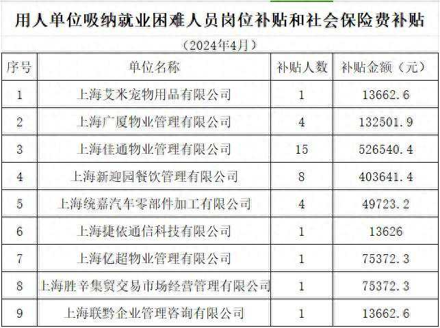 根据《上海市人力资源和社会保障局上海市财政局上海市民政局上海市残疾人联合会关于进一步做好本市就业援助工作的若干意见》(沪人社规〔2022〕8号)有关要求,经审核,现将用人单位吸纳就业困难人员岗位补贴和社会保险补贴名单(2024年4月)予以公示。公示时间:2024年4月22日——2024年4月26日,公示期内接受社会各界和群众监督,联系电话:59547895。