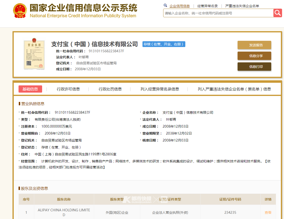 都市快报 作者:记者/编辑童蔚 如果你有晨起刷新闻的习惯,估计今天应该看到了这样一则新闻:国家企业信用信息公示系统显示,支付宝(中国)信息技术有限公司的股东为ALIPAYCHINAHOLDINGLIMITED,其法定代表人在2018年8月29日发生变更,由马云变更为叶郁青。 一时间,这则新闻引发网友热议,一大早还上了微博热搜第二名。 到了下午2点半,它依然挂在热搜榜上~ 那么,真相到底如何? 事实上,1个多小时前,支付宝官方微博已经发声了(还顺带写了第3点,扎一下我们的心)—— 据天眼查显示,叶郁青目前身兼支付宝董事长和总经理,还担任杭州玖联信息科技有限公司法人,并于2018年6月新任阿里巴巴(中国)有限公司余杭分公司法人,身兼杭州阿里科技有限公司董事等职务。 根据国家企业信用信息公示系统显示,目前,支付宝(中国)网络技术有限公司的法定代表人依然是彭蕾。 而蚂蚁金服方面是这样表示的:“支付宝的运营主体是支付宝(中国)网络技术有限公司,并非支付宝(中国)信息技术有限公司。法人变更属于公司内部治理范畴,与公司实际经营情况无关。”