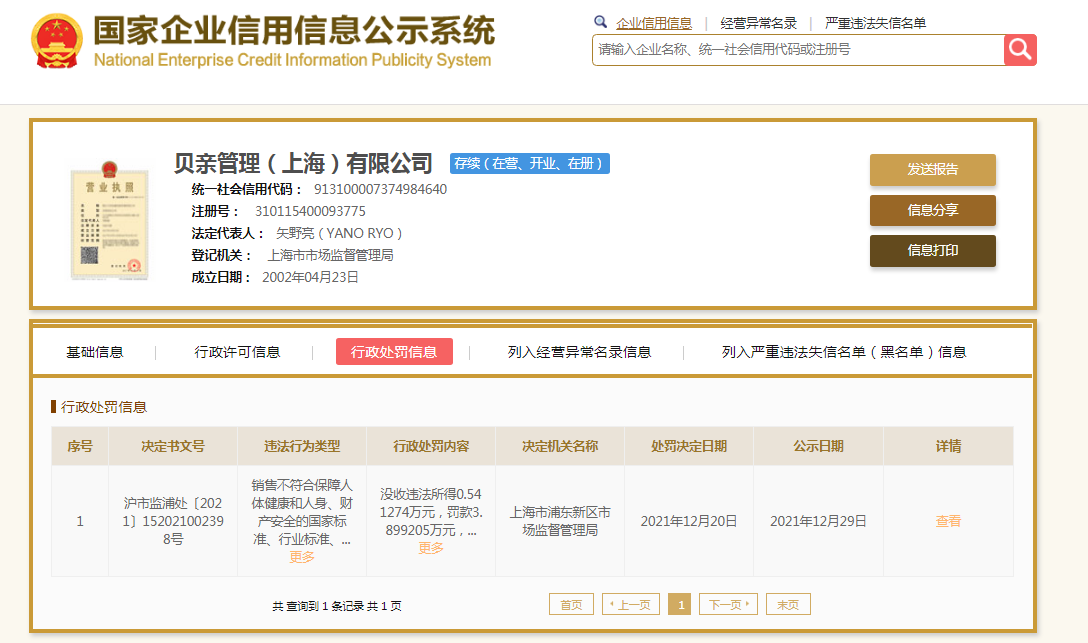 中(闫冬)日前,上海市市场监管局对该市生产、销售的家用和类似用途插头插座、搅拌机、空气压缩机等16种产品的质量进行了监督抽查。抽查了583批次产品,不合格48批次。不合格产品中包括一款贝亲吸奶器。 贝亲Smart睿享智能型单边电动吸奶器“结构”不合格 通报显示,上海第一八佰伴有限公司销售的标称贝亲管理(上海)有限公司生产的贝亲Smart睿享智能型单边电动吸奶器(商标:Pigeon、规格型号:XN/MD-QA54、生产日期/批号(标称):20191015)“结构”项目不合格。 据了解,吸奶器能让妈妈即便不在家时也能持续哺乳,尤其对上班族,可让妈妈的时间安排得更灵活。吸奶器用于吸出积聚在乳腺里的母乳,产后妈妈可能会遇到母婴分离、婴儿无吮吸能力、母亲身体条件不适合哺乳等情况,因此吸奶器是很多待产妈妈的必需品。而“结构”项目则是电动吸奶器的重要质量指标。 公开资料显示,贝亲管理(上海)有限公司成立于2002年4月,注册资本200万美元。法定代表人矢野亮(YANORYO)。贝亲管理(上海)有限公司系总部设在日本的贝亲公司的全资中国子公司。据其官网介绍,贝亲在中国拥有上海外高桥、上海青浦和江苏常州3家工厂。工厂引进国外先进的生产流水线,严格按照PQS(PigeonQualityStandard)执行管理,在整洁无菌的环境下,以规范、专业、安全的流水线操作,以高超的制造技术生产出与日本同等水准的高品质产品。 被市场监管部门罚款3.9万元 本网还注意到,贝亲管理(上海)有限公司(以下简称:当事人)正是因为生产销售上述不合格电动吸奶器还被上海市浦东新区市场监督管理局处罚。 据国家企业信用信息公示系统,行政处罚决定书显示,当事人于2019年6月13日委托德清某有限公司组装生产了30盒“贝亲Smart睿享智能型单边电动吸奶器(规格型号:XN/MD-QA54、生产日期:20191015)”用于销售;实际销售8盒,库存22盒。该批次产品货值22936.50元,违法所得5412.74元。 当事人的上述行为,违反《中华人民共和国产品质量法》第十三条第二款的规定,构成了生产销售不符合国家标准的产品的行为。依据相关规定,上海市浦东新区市场监督管理局对该公司罚款38992.05元,没收违法所得5412.74元及非法财物。