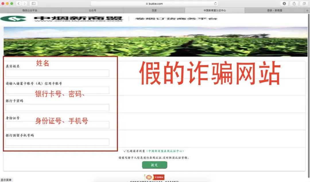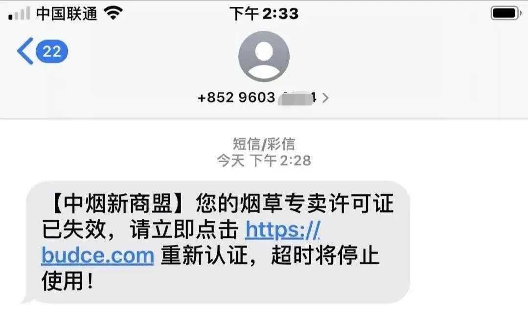 最近,一种针对烟草行业的 新型诈骗方式在全国各地出现 不少人上当被骗 前几天 珠海一名卖烟的老板也中招了 因为一条短信 卡里的钱被转走了 烟草专卖证过期? 由于冯女士店内确实在销售香烟,几年前她也办理过烟草专卖许可证,回想一下,也差不多到换证的日子了,便相信了这条短信。 没过多久,冯女士收到第一条银行发来的通知短信——银行卡被转走618元。更可怕的是,在接下来的5分钟内,冯女士又接连收到多条银行发来的取款通知短信,一共被转走3000余元。 意识到被骗的冯女士马上打电话报警,然后立即到就近银行将这张银行卡注销。 钱是怎么被转走的? 这次的骗术,其实跟此前 骗外卖店老板认证店铺信息 骗车主重新认证ETC的手段如出一辙 骗子冒充美团平台给商户发送诈骗短信。 骗子发送的ETC认证诈骗短信。 骗子利用零售客户对烟草新商盟的信任 以“中烟新商盟”的名义 向零售客户发送短信 打着“失效”“需及时认证” “超时停用”的幌子 其实就是钓鱼网站 一旦点开,后果将不堪设想 短信中的链接,其实是骗子搭建的假平台。 下面才是真的中烟新商盟网站: 输入信息登录 在假的诈骗网站上随意输入三个字,就可登录到下一级页面。 输入个人信息 进去后需要填写个人信息,包括银行卡号、密码、身份证、手机号码等信息。 正规的平台是不会要求用户输入银行卡号、密码等信息。商家一旦在陌生网站内填写上述资料,骗子便可通过快捷支付功能将商家银行卡内的资金全部转走。 烟草专卖商注意啦 烟草专卖零售许可证是每一个零售户在从事烟草经营活动之前,必须向当地烟草监管执法部门申请办理的。 根据《烟草专卖许可证管理办法》第二十八条规定,烟草专卖许可证有效期最长不超过5年。 如果烟草专卖零售许可证有效期届满,零售户想要继续经营烟草制品,则需在有效期满30天前向发证机关提出延续申请。 正是因为许可证的有效期较长,很多商户对于换证的时间比较模糊,让骗子间接钻了空子。所以,商户们收到上述提醒重新认证的短信时一定要小心,可以先去看看许可证上的有效期限,这是最简单快速的辨别方法。 另外,通过短信的内容,我们从电话号码就可以知道,这种以“00”(部分手机会在号码显示时将“00”翻译为“+”)开头的电话均来自境外,一定要留心。 此外,中烟新商盟只有一个官方网站: 大家一定要牢记! 审核张紫灵