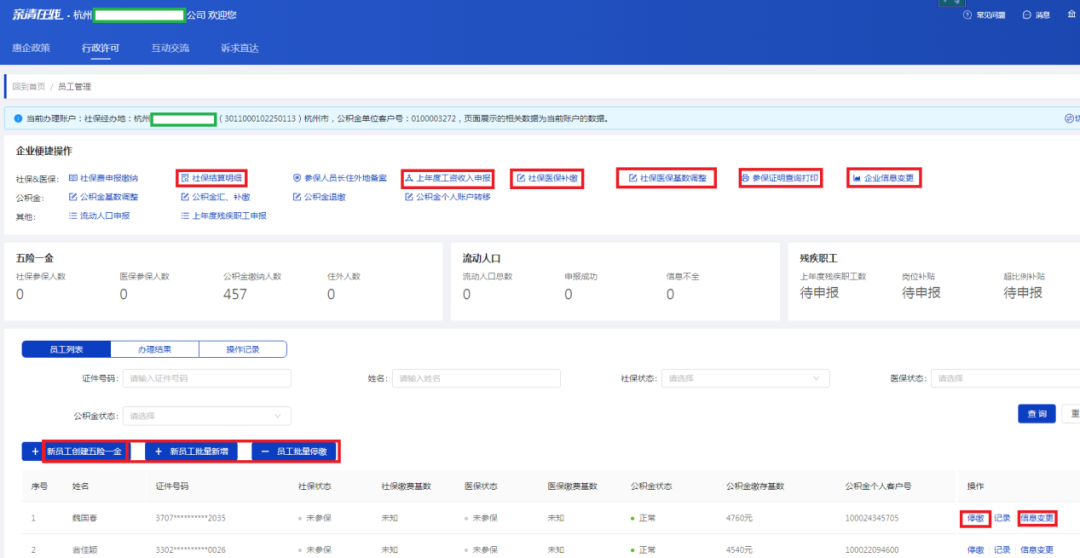 办理页面的社保办理事项分别用红色框标示,如下图: