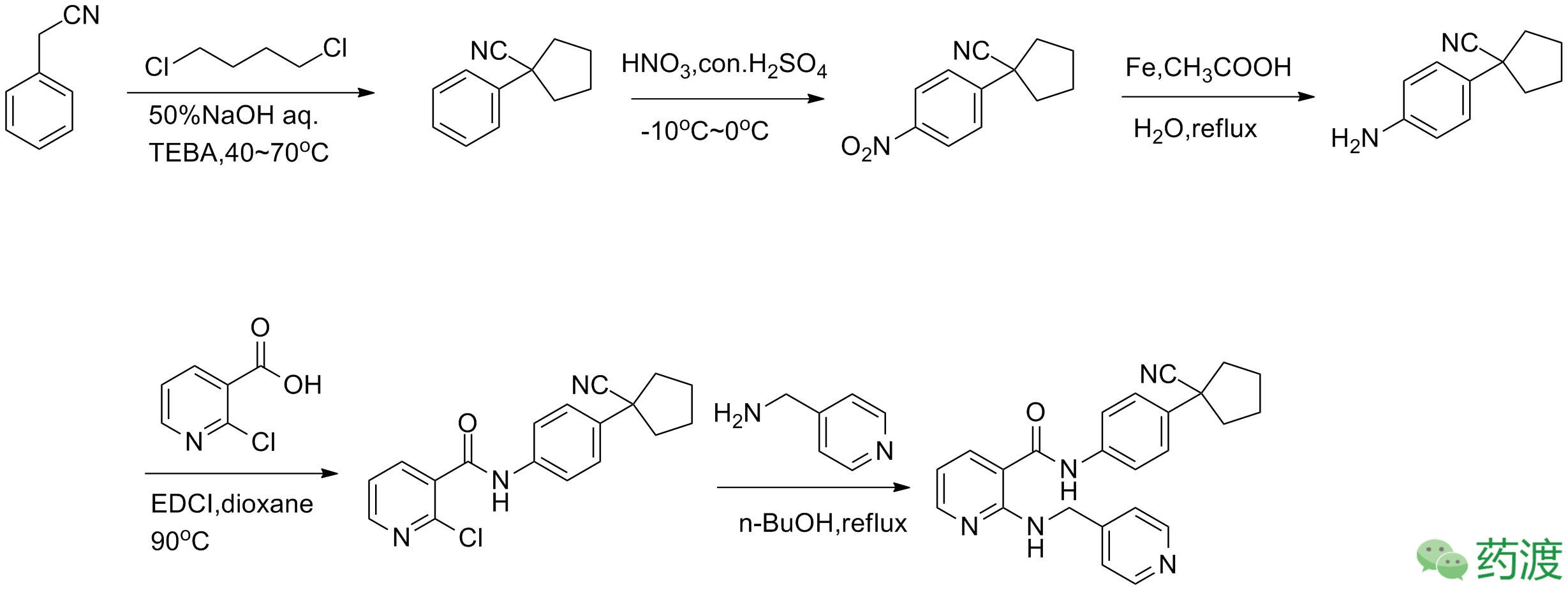 癌症是我国居民死亡的一大主要原因,近年来其发病率和死亡率持续上升。据统计,2016年我国有280多万人死于癌症,平均每天就有7500人,其中胃癌、肺癌、肝癌、食道癌和结直肠癌的死亡人数占到了所有癌症死亡的3/4。此外,我国总体癌症的五年生存率仅为30.9%,处于较低水平。在第12届国际胃癌大会(IGCC)上,大会主席、北京大学肿瘤医院院长季加孚教授表示我国胃癌每年新发病例约为68万例,占了全球发病的50%左右,发病率远远高于欧美等国家。由于该病早期症状不典型,且胃镜常规检查未普及,所以大部分患者诊断时已为进展期胃癌,即中晚期胃癌,加上现有治疗手段获益有限,预后差,患者的五年生存率一般低于30%。可见,当前我国胃癌的形势十分严峻。 2014年12月13日我国首个完全自主研发的抗癌新药艾坦(甲磺酸阿帕替尼)上市,这是目前晚期胃癌靶向药物中唯一的口服制剂,可显著延长晚期胃癌患者的生存时间。同时,艾坦也是全球首个被证实在晚期胃癌标准化疗失败后,安全有效的小分子抗血管生成靶向药物。艾坦是国家“十一五”、“十二五”重大新药创制专项之一,由江苏恒瑞医药股份有限公司研发生产。解放军南京八一医院副院长秦叔逵和复旦大学附属肿瘤医院内科主任李进教授共同牵头、38家中心参与的艾坦治疗晚期胃癌III期临床实验,进一步证实了该药治疗晚期胃癌病人的有效性和安全性。艾坦(阿帕替尼)的上市打破了胃癌恶化程度快、生存时间短的困境,延长了晚期胃癌患者的生命。 阿帕替尼的基本信息 通用名:甲磺酸阿帕替尼片 商品名称:艾坦 英文名称:ApatinibMesylateTablets 分子式:C24H23N5O·CH4SO3 分子量:493.58 化学名称:N-[4-(1-氰基环戊基)苯基]-2-(4-吡啶甲基)氨基-3-吡啶甲酰胺甲磺酸盐 性状:为薄膜衣片,除去包衣后显白色或类白色。 化学结构式如下图(图1): 图1阿帕替尼的化学结构式 阿帕替尼的研发历程 事实上,阿帕替尼的十年研发历程也是恒瑞自主创新转型的一个见证。2000年,恒瑞开始走自主研发的道路,阿帕替尼是其最早开发的药物之一。恒瑞之前上市的第一个创新药艾瑞昔布采用的是合作研发的模式,即委托一些研发团队完成恒瑞的项目,做成了再谈合作和后续的开发,做不成,就当风险投入。而阿帕替尼是恒瑞引入研发模式的一个代表,即与海外公司合作筛选化合物,然后恒瑞进行持续不断地开发。阿帕替尼在国内进行了长达十年的研究开发。具体研究开发时间点及相关研究如下图(图2)。当然了,目前恒瑞正在持续开发更多的适应症,如肝癌、肺癌、乳腺癌和结直肠癌。针对肝癌、肺癌的二期临床研究已经完成,三期临床也已开始;乳腺癌、结直肠癌的二期临床已经完成。希望能有更好的治疗效果和更低的毒性,造福于患者! 图2阿帕替尼的研发进程 阿帕替尼的作用机制 在恶性肿瘤的生长和转移过程中,肿瘤的新生血管形成起着非常重要的作用。当肿瘤的体积生长超过1mm2时,需要生成新的血管或者从已有的血管上出芽生成血管分支,以提供足够的血支持肿瘤细胞的存活。肿瘤的生长速度与转移倾向性和促血管新生因子水平以及新生的微血管数量有关。络氨酸激酶血管内皮生长因子(VEGF)及其受体(VEGFR)在肿瘤的新生血管生成中具有极其重要的作用,是阻断肿瘤新生血管生成中的重要靶点。血管内皮生长因子(VEGF)是体内最主要促进血管生成的因子。VEGF与位于内皮细胞的血管内皮生长因子受体(VEGFR)结合后导致多种血管生成的反应,如细胞增殖、迁移、血管通透性增加、内皮细胞前提骨髓移除。目前已有40多种抑制新生血管生成的药物进入临床研究。VEGFR抑制剂已逐渐成为一种非常具有应用前景的新型非细胞毒抗肿瘤药物。与抑制肿瘤生长的传统细胞毒药物相比,靶向新生血管生成的治疗药物具有更高的特异质性、更低的毒性以及有利于克服肿瘤的耐药性,并可以用于多种肿瘤的治疗。 艾坦(阿帕替尼)是通过高度选择性竞争细胞内VEGFR-2的ATP结合位点,抑制酪氨酸激酶的生成从而抑制肿瘤组织新血管的生成,阻断下游信号传导,从而强效抗肿瘤组织血管生成,最终达到全方位打击肿瘤的目的。这是因为血管生成是肿瘤恶性生长的关键环节之一,持续的血管生成与肿瘤发生、发展和转移密切相关(如下图3)。 图3阿帕替尼治疗胃癌的作用机制 阿帕替尼的合成方法 阿帕替尼的合成路线比较简单,总反应步骤只有五步,外加成甲磺酸盐才六步反应。总体上来讲,该合成路线避免了苛刻的反应条件,合成成本低、反应条件简单、工艺可操作性强、对环境比较友好。每个反应步骤的收率都在70%以上。具体反应步骤如下图(图4): (反应式中涉及到的简写:EDCI:羰基二咪唑,TEBA:苄基三乙基氯化铵) 图4阿帕替尼的合成方法 阿帕替尼的市场情况 2017年7月26日,公司发布公告,根据《人力资源社会保障部关于将36种药品纳入国家基本医疗保险、工伤保险和生育保险药品目录乙类范围的通知》,恒瑞主要产品甲磺酸阿帕替尼片新进入国家医保目录。 阿帕替尼顺利进入谈判目录,胃癌适应症优势明显。根据最终谈判目录,阿帕替尼医保支付标准为136元(250mg/片)、185.5元(375mg/片)、204.15元(425mg/片),相比原售价平均降幅约为37%,降幅明显小于进口靶向抗肿瘤药物。目前,全球范围获批胃癌的靶向治疗药物数量较少,已获批上市的有赫赛汀、雷莫芦单抗(Ramucirumab)、阿帕