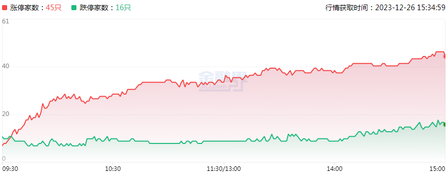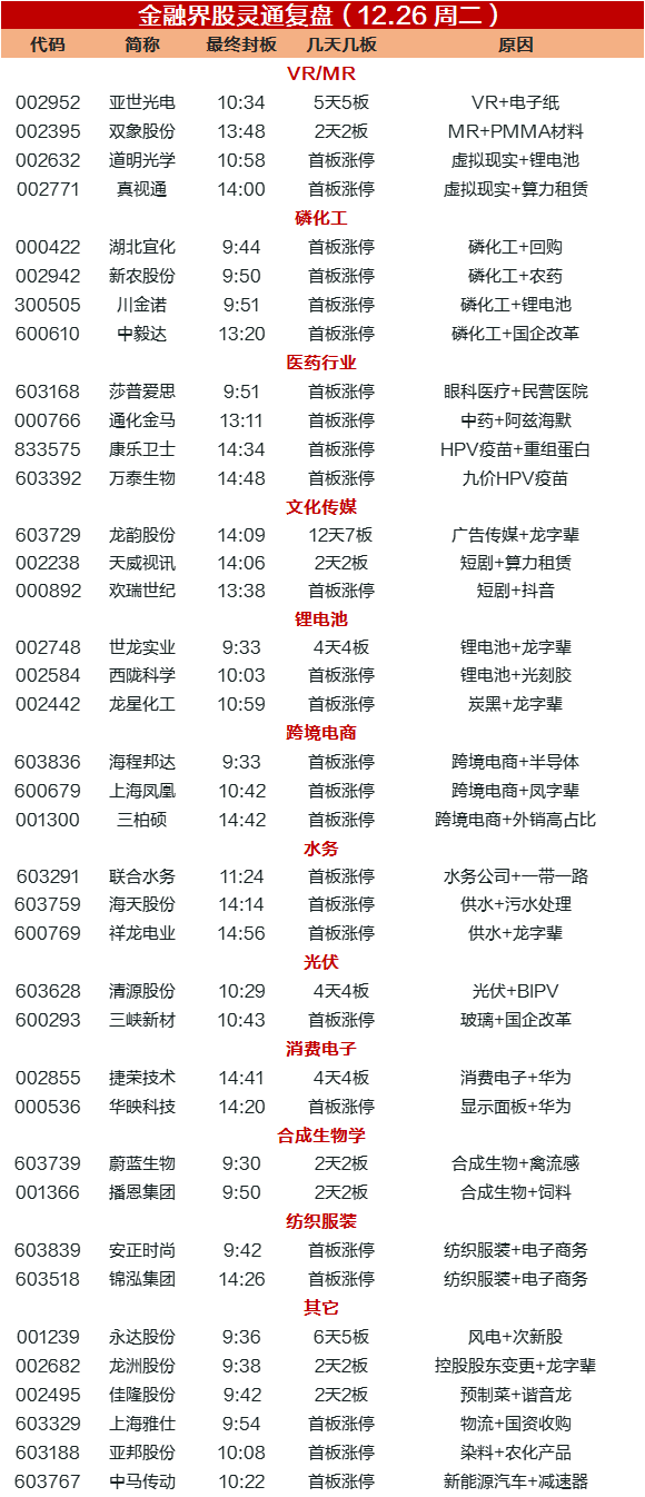 12月26日周二A股三大指数震荡下行,沪指2900点再度告失。A股共38股涨停(不含ST股),9股封板未遂,连板股总数11只,亚世光电(VR+电子纸)5连板,世龙实业(锂电池)、捷荣技术(消费电子)、清源股份(光伏)4连板,播恩集团(机器人+碳化硅)、天威视讯(军工+龙字辈)、双象股份(混合现实)、佳隆股份(预制菜+谐音龙)、龙洲股份(天然气+龙字辈)、龙韵股份(广告传媒+龙字辈)、蔚蓝生物(合成生物)2连板。 一、板块异动 二、涨跌停温度 三、涨跌家数 四、涨停揭秘 五、相关热点 VR/MR:苹果VisionPro或将在明年1月正式在北美发售;Meta明年将展示超前AR眼镜原型。 磷化工:红海“停运”,将影响化工产品的进出口;受天气、安全检查等因素综合影响,本月中下旬或有企业陆续有停采计划,磷矿石供应或进一步偏紧。 合成生物:美国南加州大学研究人员发明的一项突破性新技术,或将彻底改变合成生物学领域,它可显著推进基因工程,并推动医学、生物技术、生物燃料生产甚至太空探索领域的进步。 龙字辈:市场低迷叠加岁末年初的情绪,让龙字辈的行情再度升温。 六、市场情绪 本文源自金融界