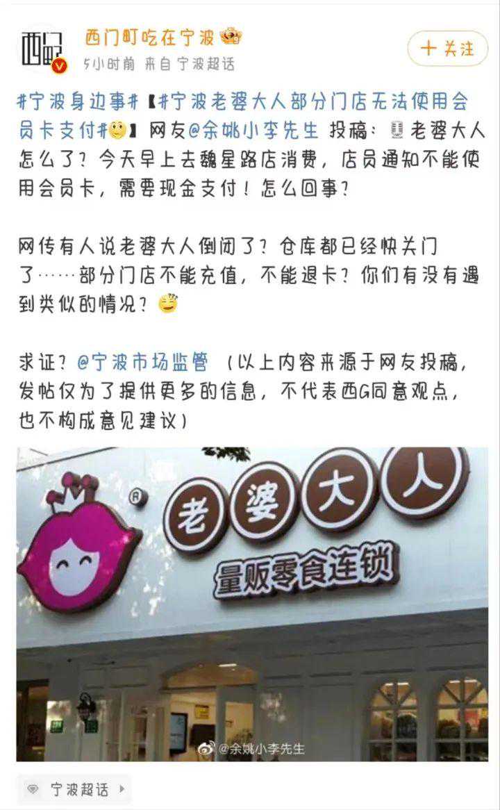今天上午,一条关于“老婆大人倒闭了,不能用会员卡”的消息,迅速在各大社交平台发酵。 “网传有人说老婆大人倒闭了?仓库都已经快关门了……部分门店不能充值,不能退卡?你们有没有遇到类似的情况?” “会员卡内余额被宁波总部扣押,停止返款……门店不得已停止使用会员卡……” “老婆大人”的词条,也冲上了微博热搜。 “老婆大人”,是指老婆大人量贩零食连锁店,以售卖各种散装、包装零食、饮料为主,通常门店开在大型居民社区附近或街边店铺,以会员卡充值消费模式为主。 中午,橙柿互动记者打开大众点评app,查找相关商户,发现杭州主城区及周边地区在内,有一百多家“老婆大人”门店,只有两家显示暂停营业。 记者通过电话,先询问了位于金家渡路上的“老婆大人”。接电话的是老板,一听来意,立马回答“正常正常”,“网上说的,都是宁波那边,跟我们没关系,杭州的门店都是正常的,放心放心,随时来店里。” 有人中午特地跑去门店看情况 家住在皇庆苑附近的郑大姐,中午12点多,就急匆匆地赶到常去的老婆大人新华路门店。记者赶到这家店时,正好碰到她在问店员情况。巧的是,新华路门店正好在装修。 郑大姐一早在家庭微信群里收到“老婆大人要关门”的消息。“我亲戚说‘你不是有卡的啊!快去用用掉’,我就过来看看,没想到这家店还装修了。”郑大姐说,她平时基本上一个月,会去老婆大人消费一两次,每次花个2、300元,目前会员卡里还有100多块余额。 “我们是正常装修,不是关店哦,装修结束还是营业的。”穿着老婆大人工作服的店员,站在店门口和郑大姐解释,因为店里的水管子破了,需要重新翻修,预计到5月26日恢复营业。“杭州我们有100多家店,有直营也有加盟,早上的消息我们也看到了,直接爆了!如果大家不放心,或者要买东西,可以去附近我们的建国北路门店,放心,都是正常开,正常可以用会员卡的。” 除了郑大姐,还有一个差不多年龄的大姐,也是上午听到“风声”,特地赶过来看看情况。 听店员解释了下,两位大姐逗留了会儿就走了。郑大姐说,晚点再去朝晖那边的门店看看,到底怎么个情况。 橙柿互动记者随即也拨打了另外两家门店,建国北路的店员表示“门店目前都是正常营业,网上传的都是谣言”,另一家朝晖店老板,也表示并没有网传的倒闭和不能用会员卡,“正常营业”。 相关门店遭遇大波人群“紧急消费” 在询问倒闭消息时,杭州其中一家门店的老板解释,起因是余姚慈溪部分加盟店停用了会员卡,只支持现金支付,继而导致“传出倒闭谣言”。而部分加盟店的所属,属于另一老板。 据天眼查App显示,老婆大人量贩零食关联公司宁波老婆大人企业管理有限公司成立于2014年,注册资本100万人民币,袁振勤为法定代表人,持股51%,系第一大股东及实控人。 热搜话题里,有不少网友晒出了今天去相关门店紧急消费的场面,人多到已经排队到店铺外,店门口更是贴出了“排队付款预计3小时”的告示。相关门店所属地都在余姚。 尽管杭州门店目前不受影响,但就像特地赶去的郑大姐一样,听到风声了多少有点“心有余悸”。卡里充了值,结果突然一夜之间成了废卡,这样的事情也不是没发生过。前两天吵得沸沸扬扬的许留山,还有之前很多杭州人被“套牢”的丹比蛋糕、浮力森林,以及瑜伽馆、教培行业等等。 “我已经算留心了,每次充个3、400,用个2、300,卡里余额保持在100多块。也不敢多充的,生怕哪天用不来了。”郑大姐说,“现在还是觉得用多少充多少最放心。” 你有去过老婆大人买零食吗?你现在会不会办充值会员卡?留言区等你。