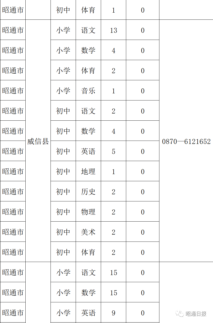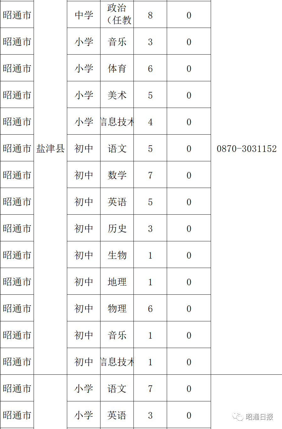 5月29日 省教育厅网站发布 云南省2023年特岗教师招聘考试公告 将在昆明市、昭通市等 13个州(市)、60个县(市、区) 招聘2380名特岗教师 招聘对象以普通高校本科及以上毕业生为主 昭通岗位如下 ↓↓↓ 云南省教育厅关于2023年中央特岗教师招聘考试的公告 一、招聘计划发布 云南省2023年在昆明市、昭通市、保山市、楚雄州、红河州、普洱市、西双版纳州、大理州、德宏州、丽江市、怒江州、迪庆州、临沧市共13个州(市)60个县(市、区)招聘2380名特岗教师。详细岗位要求请查阅各州(市)、县(市、区)发布的招聘公告。 各州(市)、县(市、区)即日起在公布的网站(网址见附表)发布招聘公告。应聘毕业生可登录各州(市)、县(市、区)网站查阅招聘信息,或登录云南省招考频道-云南省招生考试工作网(),在报名系统内查看岗位信息。 二、招聘对象、条件和服务年限 (一)招聘对象 以普通高校本科及以上毕业生为主,鼓励师范类专业本科毕业生应聘,可适当招聘2021年、2022年、2023年毕业的师范类高等专科毕业生。面向全国招聘,边远艰苦地区可向本地生源倾斜。 (二)招聘条件 1.具有中华人民共和国国籍。 2.年龄不超过30周岁(1992年6月5日及以后出生)。 3.思想政治素质好,热爱社会主义祖国,拥护党的各项方针、政策,热爱教育事业,有强烈的事业心和责任感,品行端正,遵纪守法,在校或工作(待业)期间表现良好,未受过任何纪律处分,为人师表,志愿服务农村基层教育。 4.符合招聘岗位要求,符合《教师法》《教师资格条例》等法律法规规定的学历标准、普通话水平、身体条件和心理条件。符合新时代中小学教师职业行为十项准则要求,无刑事犯罪记录和其他不得聘用的违法记录。参加过“大学生志愿服务西部计划”、有从教经历的志愿者和参加过半年以上实习支教的师范院校毕业生同等条件下优先录取。支持鼓励符合条件的退役军人毕业生到中小学任教。具体岗位学历、专业等要求由设岗县设定。 5.身体条件符合云南省申请教师资格人员体检标准和《关于修订〈公务员录用体检通用标准〉(试行)及〈公务员录用体检操作手册〉(试行)有关内容的通知》(人社部发〔2016〕140号)的规定,并能够适应设岗地区工作、生活环境条件。 6.教师资格有关要求: (1)已取得教师资格证的考生应具有与报考岗位要求一致的教师资格证(教师资格证学段应不低于报考岗位学段,教师资格证学科符合报考岗位要求,具体由设岗县设定)。“小学全科”教师资格证可视为持有小学任一学科教师资格证。 (2)暂未取得教师资格证书的人员,可持在有效期内的全国中小学教师资格考试合格证明或笔试合格成绩——“中小学教师资格考试(NTCE)成绩”(小学教师资格为两科笔试成绩,初中教师资格为三科笔试成绩)或师范生教师职业能力证书报名(退役军人在服役前1年内取得中小学教师资格考试合格证明的凭入伍通知书、退役证书等相关材料,教师资格考试合格证明有效期可延长2年)。严格“持证上岗”,此类拟聘人员在办理聘用手续前(即2023年8月底前)必须取得岗位要求的中小学教师资格证书。 7.现役军人、在职在编公职人员、在岗特岗教师、全日制在读的非应届毕业生(如专升本在读学生、研究生在读学生)不属于特岗教师招聘范围(时间截止到2023年6月5日)。 (三)服务年限 3年。 三、招聘程序 招聘工作坚持“公开、平等、竞争、择优”的原则,按以下步骤进行: (一)报名 1.提交报考申请(2023年6月5日8:00-6月9日18:00)。 采用网络提交的方式,不设现场报名,免交报名费,报名网址为:云南省招考频道-云南省招生考试工作网()。考生登录网站后→选择注册按钮,按系统提示填写注册信息→考生报名,填写信息,仔细核对并保存→上传附件,仔细核对信息及附件,勾选同意声明后确定提交→报名信息查看→等待审核→审核通过后在规定时间内打印准考证。本次考试在各州(市)设立考点,按照“报哪里到哪里考”的原则,考生在报考岗位所在州(市)参加笔试,笔试考点及相关信息以准考证为准。 每位考生只能报考一个岗位。考生须如实填写个人报考信息,资格审查贯穿招聘工作全过程,弄虚作假或不符合报考条件者,一经查实取消录用资格。报考信息一经提交确认后,不能作任何修改。因身份证过期、信息填写失误、照片模糊或变形等情况,造成无法进入考场考试、无法通过资格复审等后果,责任由考生本人承担。 2.审核报名资格(2023年6月5-14日)。 报名期间,资格审查单位一般在报考人员报名两日内提出资格审查意见。报考申请通过资格审查的,不能再改报其他岗位;未通过资格审查的,可以改报其他岗位。2023年6月12日18:00-6月14日18:00期间,报考申请未审查或未通过资格审查的,不能再改报其他岗位。岗位报名人数统计将于6月8、9、10、14日在云南省招考频道()通报,建议报考人员理性选择报考,勿观望扎堆。 3.打印准考证(2023年7月4日8:00-8日9:00)。考生登录云南省招生考试工作网(),按照系统提示打印本人准考证。考试时,考生需持本人准考证和有效居民身份证原件(有效期内的居民身份证或临时居民身份证)到指定地点参加考试。两证不全者不得参加考试。居民身份证遗失或过期,应及时到户籍所在地公安机关补办临时居民身份证参加考试。 (二)笔试 1.笔试(2023年7月8日星期六9:00-11:30)。 笔试为分学科闭卷考试。考