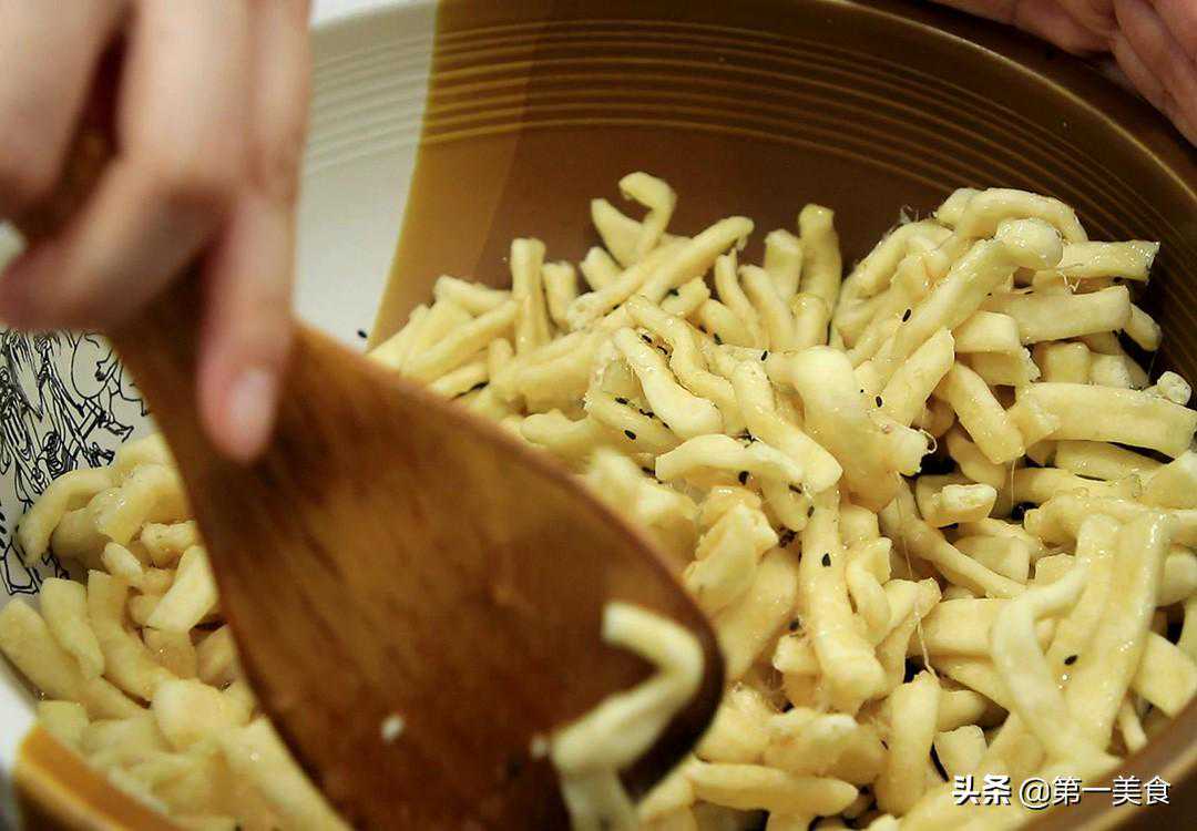 今天和大家分享6种小零食的做法,每一种都很美味,而且做法超简单,轻松就能在家搞定,零技巧零难度,比外面买的吃着更放心,有喜欢的朋友们可以收藏起来照着做,大人小孩都爱吃,尤其在追剧时边吃边看,真是舒服。 1.准备一个小盆,打入4个鸡蛋,加入食盐2克,白糖80克用筷子快速把鸡蛋打散,一直打到把白糖化开为止,这一步比较累人可以借助工具。 白糖化开以后加入黄油100克边倒边用筷子搅拌,倒入低筋面粉90克,低筋面粉要过一下筛子,筛细一点,搅拌成糊以后加入一把黑芝麻再次搅拌调匀备用。 2.把电饼铛加热,舀一勺子鸡蛋液倒在电饼铛的中间位置,盖上盖子鸡蛋液自然会压平,电饼铛两面加热,1分钟左右鸡蛋卷就变成金黄色,拿一根筷子把鸡蛋卷卷起来,一定要趁热卷起。 照着这个方法把所有的鸡蛋都烙好卷起来,一道简单美味的鸡蛋卷就做好了。 1.准备一个小盆倒入少许温水,加入1克小苏打化开,再打入三个鸡蛋用筷子快速打散。 2.准备普通面粉200克,把鸡蛋液倒进去,先搅拌成面絮再揉成光滑的面团,200克面粉,3个鸡蛋刚刚好,不用另外加水,揉好以后用锅盖盖住饧上15分钟,让面筋松弛方便一会儿整形。 面团饧好以后取出来,用擀面杖擀成1厘米厚的圆形面片,擀好以后用擀面杖挡住,切成5厘米左右的宽条,在上面撒上一层面粉,把宽条摞起来以免粘在一起,再切成1厘米左右的窄条。 3.开始炸制:锅内烧油,油温5成热时,把切好的窄条依次撒入锅中,炸的过程要用筷子不停地翻动,面条会慢慢的变色漂浮在油面上,炸至微黄、变脆就可以捞出控油。 4.锅内烧80克水,水烧开以后放入白糖80克,开小火慢慢加热化开白糖,倒入蜂蜜150克,用锅铲不停地搅动,把白糖和蜂蜜熬制粘稠起泡。 起锅倒在刚刚炸好的面条上面,倒的时候要用锅铲不停地翻动,让面条均匀裹上糖浆,再撒上一点黑芝麻、葡萄干或者坚果翻匀。 翻匀后把面条倒在提前准备好的磨具中按压结实,再放上一层葡萄干,多压几次压结实,冷凉以后切成小块,一道香甜可口的沙琪玛就做好了。 1.准备高筋面粉200克,打入一个鸡蛋,加入白糖10克,先把鸡蛋搅散,再用常温水和面,一点一点地添加,搅拌至没有干面粉下手揉成光滑的面团,揉好以后用保鲜膜盖住,密封饧面10分钟,让面筋松弛这样面会更加的柔软有弹性。 再准备一个小盆,打入一个鸡蛋,加入少许清水,搅拌打散成鸡蛋液备用。 2.10分钟以后,在案板上抹上一层植物油,把饧好的面团取出来,不用揉直接搓成长条,揉面起筋的话做出来的芝麻条容易回缩,用手掌摁扁,擀成1厘米左右的厚片,用刀划成一根一根的宽条,再把宽条搓圆一点。 把搓好的面条先粘上鸡蛋液,再裹一层芝麻,裹好之后再用手搓一搓,这样芝麻会粘得比较结实,下锅时不容易掉落。 3.开始炸制:锅内烧油,油温4成热时,油面平静无烟,把芝麻条一个一个放入锅内,轻轻晃动锅防止芝麻条粘在锅底,随着温度的升高,芝麻条会慢慢地飘浮在油面上,用勺子不停地翻动让芝麻条均匀受热,把芝麻条炸至表皮变硬即可捞出,一道焦香酥脆的芝麻条就做好了。 1.准备香蕉一把剥去外皮,切掉两边再切成两段,盆中放入适量的玉米淀粉,先把香蕉裹上玉米淀粉,尽量的裹匀一点。 盆中打入三个鸡蛋,用筷子快速打散;再准备一个小盆倒入面包糠;夹起香蕉先蘸上鸡蛋液再裹上面包糠,依次把所有的香蕉都这样操作。 2.开始炸制:把锅烧干不要有水,倒入植物油慢慢地加热至微冒青烟,放入香蕉,油面翻滚起泡,这个时候温度不要太高,保持中火转动炒锅,使香蕉均匀受热免得粘在锅底,香蕉变成金黄色就可以捞出控油,挤上沙拉酱再撒上一点西红柿碎粒点缀,一道香甜可口的脆皮香蕉就做好了。 1.准备适量的花生米,放入清水中浸泡一会儿去除其表面的杂质和灰尘,也能起到焦酥不老的作用,把花生洗干净控干水分放入盆中,花生表面的水分一定要控干,否则炸的时候容易脱浆。 加入一勺食盐用筷子搅拌均匀,打入一个鸡蛋颠盆拌匀,鸡蛋能够增加花生米的黏性不易脱浆,再分次添加适量的淀粉,让花生米表面均匀裹满淀粉,裹至表面干燥相互不粘连的状态即可。 2.锅内烧油,油温3成热,油面平静不冒烟,把花生倒在漏勺里面抖掉多余的淀粉,倒入油锅里面,保持小火浸炸,让热力慢慢地渗入到花生里面,期间要经常翻动让花生均匀受热,慢慢地升高油温。 炸的时候会听到噼啪的炸裂声,这是花生米水汽蒸发变脆的过程,大约炸制5分钟,花生米炸酥炸脆以后倒出来控油。 3.下面给花生米挂霜:锅内加入少许清水,放入一勺白糖,开小火把白糖搅散搅化,白糖全部融化以后,锅内会出现大量的气泡继续搅拌,当糖汁变得粘稠气泡开始变小的时候,把炸好的花生米倒入锅中,这是倒花生米的最佳时机,过早过晚都不行。 快速颠锅翻炒让花生均匀裹满糖汁,这个时候起锅远离热源,撒入一把熟的白芝麻利用余温不停地翻炒,随着温度的下降锅中会出现白色的糖霜,继续炒至花生表面干燥,粘稠的糖汁就变成了糖粉,糖霜就挂好了,一道香甜脆爽的挂霜花生米就做好了。 1.准备纯牛奶2盒,把锅烧热倒入准备好的纯牛奶,先开大火把牛奶煮至沸腾,再转小火勾入适量的水淀粉,水淀粉要多次少量地添加,不停地翻炒防止牛奶粘锅,熬至牛奶呈粘稠的糊状时即可起锅。 2.把牛奶糊倒入保鲜盒中盖上盖子,放入冰箱冷冻1个小时。 1个小时以后牛奶糊已经定型,把牛奶糊表面