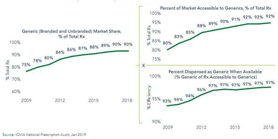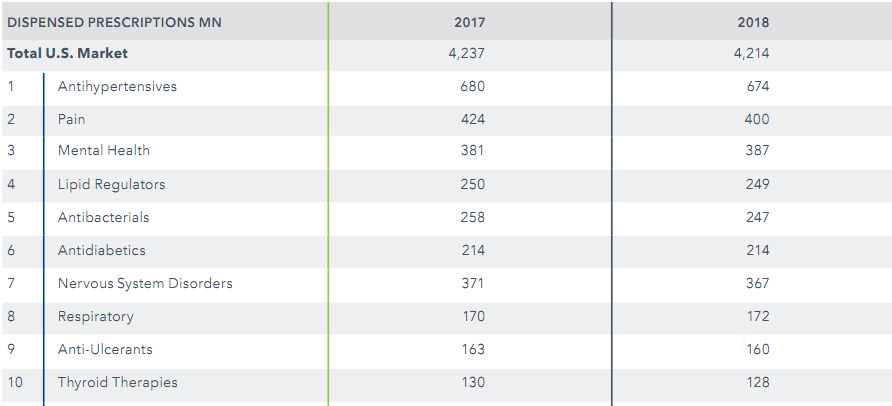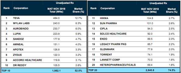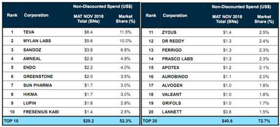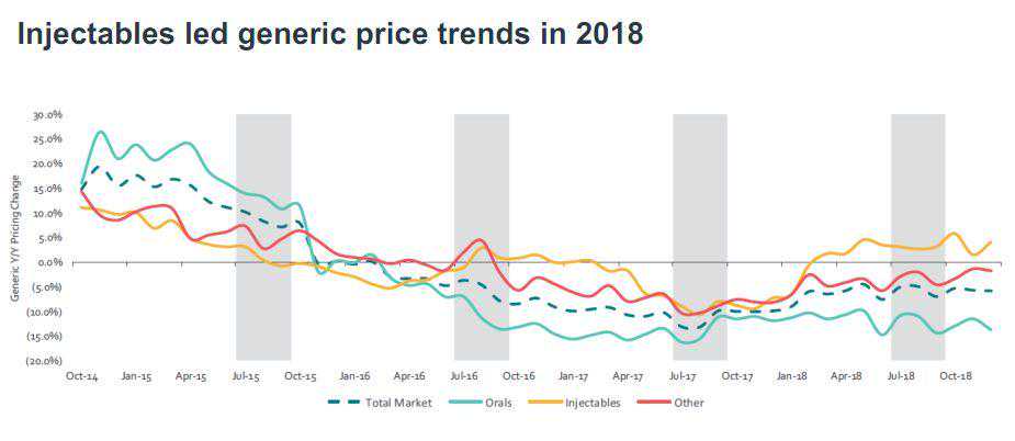 花开花落,又是一年。美国市场仿制药价格持续下滑的严冬仍在继续,一直以来令人向往的诗和远方如今着实有些望着发慌。然而,迷茫于眼前的苟且之际,大洋彼岸的全球第一大仿制药市场2018年至少没有变得更坏,甚至有些许复苏,还是让我们对未来充满了憧憬与希望。 不破不立,破而后立。激烈竞争带来市场困境的同时,也在另一方面提供了变革的动力,带来了更多选择的机会。不管是坚持比拼成本以价换量,用暂时的低盈利静待竞争对手知难而退,还是转型去做高壁垒的复杂仿制药,比拼真硬核,抑或将重心由美国市场转向全球其他区域,逐步战略转移、谋求协同发展抵御也行,再或是实力足够雄厚,加入创新药和生物仿制药的高端军备竞赛……道路千万条,找到最适合自己的那条就是最好的。 市场规模 2009-2018十年间,全球医药市场规模不断扩大,近5年复合增长率为6.3%,2018年已达12000亿美元。预计未来5年这一数字仍将继续增长,2023年有望突破15000亿美元。 2009-2018十年间,美国医药市场整体规模保持持续增长,占据了全球医药市场约四成的份额,在总体向上的大趋势下,增速并不稳定,有两个比较大的拐点,主要是因为2011-2012年的品牌药大面积专利到期,以及2013-2015年品牌药的集中上市。 2018年,美国医药市场规模达到了4790亿美元(以发票金额计),相比上年增长5.7%,主要得益于仍处于专利期保护的品牌药和新获批品牌药的销量增长,抵消了仿制药价格和销量下降的负面影响,在品牌药价格增长幅度不大的情况下带动了整体市场规模的扩大。仿制药的占比进一步下滑至21.3%,其中品牌仿制药占比9.6%,非品牌仿制药占比11.7%。考虑到美国医药市场流通环节中的折扣、返点等抵消因素,扣除后以净价计总规模为3440亿美元,同比增长了4.5%。2018年净价与发票价格之间的平均比例在品牌药和仿制药中分别为65%和70%。 预计未来五年,美国医药市场规模仍将继续扩大,以发票价格和净价计,平均增长率将分别达到4%-7%和3%-6%。 2018年美国市场总处方量为57.69亿张(按处方周期调整前为42.14亿张),相比上年提高了2.7%。2009-2018十年间,美国仿制药(包括品牌仿制药和非品牌仿制药)在整个处方量中的占比从75%稳步上升至90%,全部处方中有仿制药可选的比例从80%上升至92%,仿制药处方量在全部有仿制药可选药品处方总量中的占比则从93%上升至97%。 剂型及治疗领域占比 从2018年各剂型所占处方总量看,口服固体制剂处方量在美国医药市场总处方量中占比87%,在仿制药中占比则达到了92%,在各剂型中排名首位,注射剂、吸入剂和皮肤科用药等剂型处方量依次位列其后。从各剂型销售额看,片剂和注射剂排名前两位,份额占比分别为42%和38%,遥遥领先于其他剂型,两种剂型的仿制药收入同样位居前二,份额占比分别为60%和19%。 从2018年各治疗领域的处方总量看,高血压、疼痛科和精神科排名前三。其中,处方量TOP10治疗领域中的仿制药处方量占比约为90%。处方量TOP10治疗领域中,只有糖尿病(排名第6)和呼吸疾病(排名第8)的非品牌仿制药处方量占比低于上述平均水平,分别为57%和37%。 从2018年各治疗领域销售额看,糖尿病、肿瘤科和自体免疫排名前三。其中,销售额前十大治疗领域中,非品牌仿制药的销售额占比不足7%。销售额TOP10治疗领域中,只有精神科(排名第9)和疼痛科(排名第10)的非品牌仿制药销售额占比在20%以上,分别为23%和36%。 公司排名 从美国非品牌仿制药市场的各公司处方量占比看,TOP20的公司()占据了非品牌仿制药总处方量的74.5%,TOP10公司占比更是达到了52%。在TOP20中,Aurobindo收购Sandoz固体口服和皮肤科业务后跃升至三甲之列,以Aurobindo为首的印度公司占据了其中的十席,展现出了强劲的实力。 从美国非品牌仿制药市场各公司销售额占比看,TOP20的公司()占据了仿制药总处方量的72.7%,TOP10占比为56.1%。在TOP20中,印度军团入围5家,位次最高的Sun制药排名第六。Amneal和Impax合并后实力大增,跃居至前五。 注册审评 2018年FDA共批准了1021个ANDA,包括843个正式批准和211个临时性批准,略低于去年。其中首仿占10%,复杂仿制药占14%。首仿中有18%属于复杂仿制药。2018年,每个仿制药品种平均对应10个ANDA,而在五年前,这一数字尚不足2个。因为申报与获批之间存在的时间差,仿制药市场的瞬息万变也给申请人带来了一定的风险。在产品获批后继续上市不能带来利润的情况下,长痛不如短痛也不失为明智之举。截至目前,2016年获批的ANDA上市率不足六成,2018年新获批的ANDA在该年实现上市的也只有大约三分之一。 从申报情况看,2018年ANDA总申报数量为1042个,相比去年下降了7.6%,在多年连续增长后首次出现降低,这也一定程度上反映了各家仿制药公司对待美国市场研发产品线更加理性与谨慎。“在质而不在量、在精而不在多”的理念进一步得以普及。在申报新ANDA的同时,多家仿制药公司也纷纷将一些低盈利品种撤市以更加专注和节省成本。 价格变化 2018年,美国市场仿制药整体价格有所复苏、降幅减少,相比于2017年有所好转,但下滑的趋势仍在继续。从剂型看,门槛最低、竞争最为激烈的口服固体制剂降幅最大,而门槛相对较高的注射剂及其他剂型的价格则逐渐止住下滑趋势,或已经开始略微上浮。竞争的激烈程度决定了价格变化的幅度,2013-2018年没有新ANDA获批的分子,只是价格涨幅变小,2018年仍然保持了3.5%的增长。 在当前