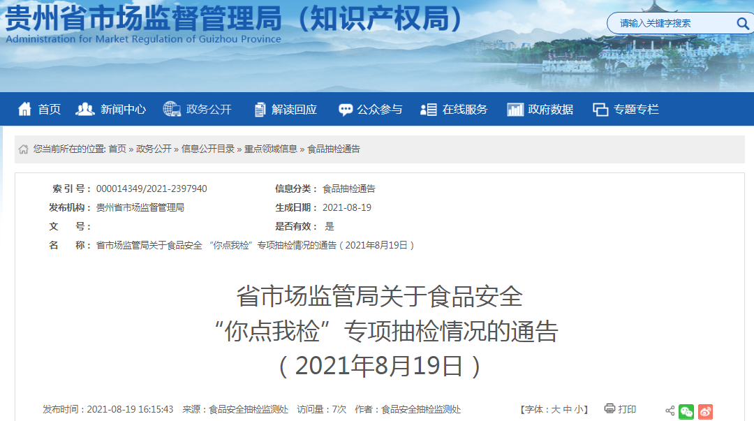 中2021年8月19日,贵州省市场监管局网站发布关于食品安全“你点我检”专项抽检情况的通告(2021年8月19日)。 对抽检发现的不合格食品,贵州省市场监管局已责成属地市场监管部门立即组织开展核查处置,查清产品流向,督促食品生产经营者采取下架、召回不合格产品等措施控制风险;对违法违规行为,依法严肃处理。涉及省外生产企业的,已及时通过“国家食品安全抽样检验信息系统”告知生产企业所在地市场监管部门依法开展核查处置。 贵州省食品安全“你点我检”服务活动后续将会持续开展,欢迎广大消费者积极参与,共同维护食品安全。有购买到上述不合格批次食品消费者,可拨打12315进行投诉处理。 部分不合格检验项目小知识.docx “你点我检”专项抽检不合格产品信息表 序号 标称生产企业名称 标称生产企业地址 被抽样单位名称 被抽样单位地址 样品名称 规格型号 商标 生产日期/ 批号 不合格项目║检验结果║标准值 分类 检验机构 备注 1 通海博鸿食品有限公司 云南省玉溪市通海县秀山街道六一村八组(长塘子) 黔南民族幼儿师范高等专科学校 贵州省黔南布依族苗族自治州贵定县金南街道利民路48号 小米辣(盐水渍菜) 1千克/袋 王发珠+图形商标 2021/4/1 苯甲酸及其钠盐(以苯甲酸计) ║1.20g/kg ║≤1.0g/kg 蔬菜制品 贵州省检测技术研究应用中心 / 2 湖南怀化湘榆调味酿醋厂 湖南怀化市鹤城区石门乡四方田村 铜仁学院丹桂餐厅 贵州省铜仁市碧江区川硐办事处教育园区启航路238号 料酒 480ml/瓶 湘榆+图形商标 2021/4/8 氨基酸态氮(以氮计) ║0.028g/L ║≥0.2g/L 调味品 贵州省检测技术研究应用中心 / 3 惠水县朗郎食品有限公司 贵州省黔南布依族苗族自治州惠水县濛江街道长田工业园区(A区) 贵阳市新世界学校 贵阳市观山湖区金珠西路107号 高级料酒 500ml/瓶 文字及图形 2021/3/6 氨基酸态氮(以氮计)║0.0070g/L║≥0.2g/L 调味品 贵州省产品质量检验检测院 / 4 成都杰麦食品有限责任公司 成都市温江区成都海峡两岸科技产业开发园西区(永盛镇团结5组)锦河路232号 新蒲新区虾子镇林秋霞杭瑞高速南区超市 新蒲新区虾子镇杭瑞高速服务区南区 老面包 300克/袋 佰仕杰麦 2021/6/4 酸价(以脂肪计)║7.2mg/g║≤5mg/g 糕点 贵州省产品质量检验检测院 / “你点我检”专项抽检合格产品信息表 序号 标称生产企业名称 标称生产企业地址 被抽样单位名称 被抽样单位所在省份 样品名称 规格型号 生产日期/批号 分类 备注 1 金城江四知堂健民食品厂 广西河池市金城江区东江镇长排村 六枝特区学生百货超市 贵州 八桂通心酥(酥性饼干) 50g/袋 2021/4/23 饼干 / 2 铜仁幼儿师范高等专科学校(二食堂) 贵州省铜仁市碧江区川硐街道桃源大道202号 铜仁幼儿师范高等专科学校(二食堂) 贵州 蘸料 散装称重 加工日期:2021/6/25 餐饮食品 / 3 贵州舒心后勤管理服务有限公司 贵州省铜仁市碧江区川硐镇墨香苑第3幢2单元16层2-16-14号房 贵州舒心后勤管理服务有限公司 贵州 鲜肉包子 散装称重 加工日期:2021/6/25 餐饮食品 / 4 贵州舒心后勤管理服务有限公司 贵州省铜仁市碧江区川硐镇墨香苑第3幢2单元16层2-16-14号房 贵州舒心后勤管理服务有限公司 贵州 蘸料 散装称重 加工日期:2021/6/25 餐饮食品 / 5 贵阳云岩华东鑫食品经营部 贵阳市云岩区蔡家关村草黄路新村巷154号 黔南民族幼儿师范高等专科学校 贵州 红薯粉 计量销售 2021/3/13 淀粉及淀粉制品 / 6 白云区斌斌食品加工坊 贵州省贵阳市白云区沙文镇范家院村二组34 黔南民族幼儿师范高等专科学校 贵州 斌斌粉丝 散装称重 2021/1/23 淀粉及淀粉制品 / 7 / / 黔南民族幼儿师范高等专科学校 贵州 豆腐皮 散装称重 购进日期:2021/6/15 豆制品 / 8 / / 黔南民族幼儿师范高等专科学校 贵州 泡豆腐 散装称重 购进日期:2021/6/15 豆制品 / 9 贵州美之选食品有限公司 贵州省黔南布依族苗族自治州惠水县濛江街道长田村(惠水经开区) 贵定县第一中学食堂 贵州 酱香豆豉 500g/袋 2021/5/13 豆制品 / 10 浏阳天之湘食品有限公司 浏阳市镇头镇食品工业小区 新蒲新区虾子镇林秋霞杭瑞高速南区超市 贵州 香辣素牛肉丸(大豆蛋白类制品) 90克/袋 2021/5/10 豆制品 / 11 重庆伍阳食品有限公司 重庆市北碚区东阳镇上坝路1号9幢 新蒲新区虾子镇林秋霞杭瑞高速南区超市 贵州 麻辣味风味豆干(非发酵性豆制品) 70克/袋 2021/4/20 豆制品 / 12 康师傅(重庆)方便食品有限公司 重庆经济技术开发区经开园平场工业区F32号地 观山湖区青客便利店 贵州 康師傅藤椒牛肉面 面饼+配料106克面饼:85克/桶 2021/3/24 方便食品 / 13 昆明统一企业食品有限公司 云南省昆明市呈贡新城大冲工业片区新加坡产业 观山湖区李元龙百货便利店 贵州 老坛酸菜牛肉面 121克/袋 2021/5/7 方便食品 / 14 昆明统一企业食品有限公司 云南省昆明市呈贡新城大冲工业片区新加坡产业 观山湖区李元龙百货便利店 贵州 老坛泡椒牛肉面 110克/袋 2021/5/10 方便食品 / 15 贵阳南明黔粮斋风味食品厂 贵阳市南明区龙洞堡食品轻工业园区A区03号羊城西饼1楼厂房 六枝特区学生百货超市 贵州 黑米粥 330克/杯 2021/5/19 方便食品 / 16 贵州省瓮安县柴姨妈乡土食品有限公司 瓮安县绿色食品工业园区(富水桥) 贵定天福观光茶园有限公司 贵州 豆汁黄粑 328克/袋 2021/4/1 糕点 / 17 贵州省瓮安县柴姨妈乡土食品有限公司 瓮安县绿色