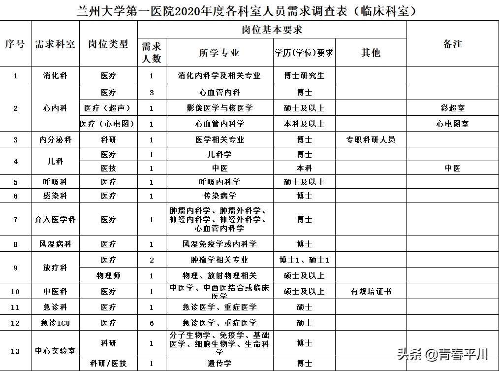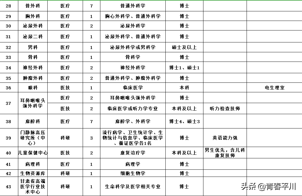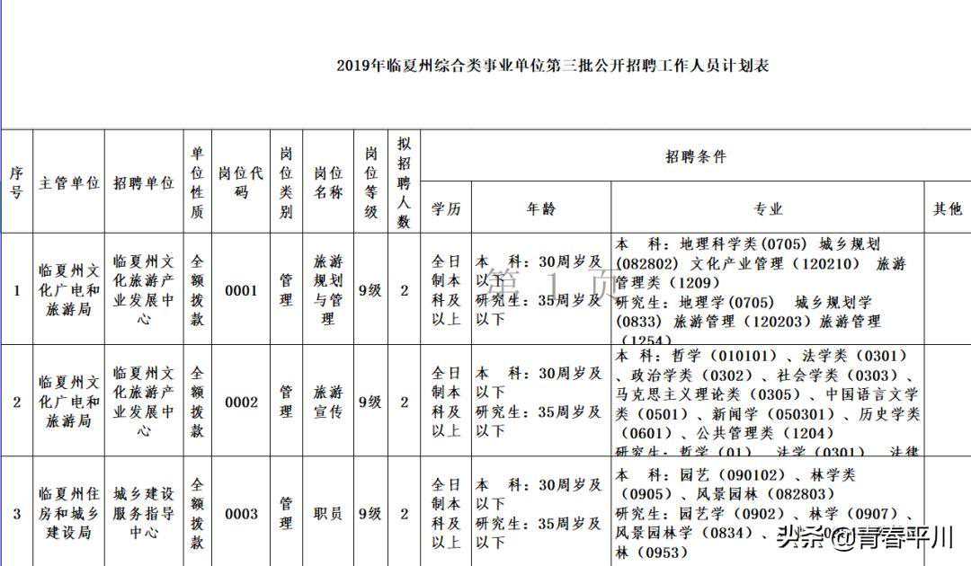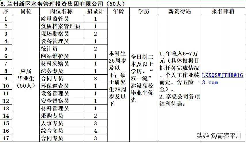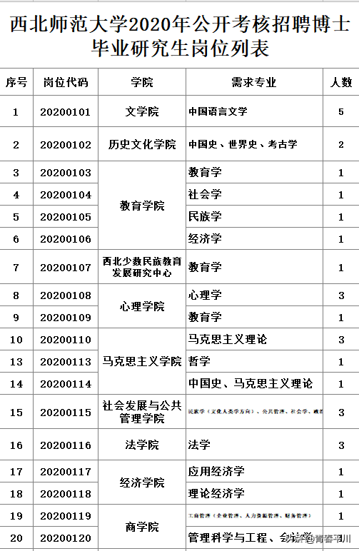 1、2020年中国铁路兰州局集团有限公司 招聘大专(高职)毕业生1232人公告 公司招聘信息 一、招聘岗位及专业要求 二、应聘条件 应聘毕业生应同时具备以下基本条件: 1.列入国家招生计划、具备派遣资格的2020年应届全日制普通高等职业院校大专(高职)学历毕业生; 2.符合招聘岗位要求的条件,在校期间所学专业为铁路相关方向或所学主要课程为铁路主专业课程; 3.品行端正,遵纪守法,热爱铁路事业,专业对口,学习成绩优良;服从工作分配。 4.身体健康,无色盲、色弱;具有正常履行岗位职责的身体条件,符合公务员录用体检通用标准或铁路行业职业健康检查规范。 5.机车乘务岗位符合铁路机车车辆驾驶人员健康检查规范,车务调车岗位符合车务调车岗位要求的身体条件。 三、招聘程序 (一)报名时间及方式 长按识别下方二维码 回复“铁路局”获取岗位表、进行报名 (二)审查和筛选 (三)考试考核 请接到通知的毕业生携带打印的毕业生应聘登记表(须本人签字)、推荐表、成绩单、就业协议、近三个月二级甲等及以上医院健康体检报告、学籍在线验证报告及其它能够证明本人资历或能力的材料,按指定的时间、地点参加考试考核,否则将被视为放弃应聘。 (四)确定拟录用人员 根据考试考核结果择优确定拟录用学生名单。 (五)公示签约 拟录用学生在中国铁路人才招聘网公示无异议后,正式签订就业协议。 在各招聘环节中,对未能进入下一环节的应聘毕业生恕不通知。 四、其它事项 1.应聘毕业生须对提供的信息材料真实性负责。发现弄虚作假、作弊行为以及其它违反招聘规定的,取消应聘资格。 2.医院出具的体检报告必检项目为:血压、辨色力、视力、听力、身高、心电图、胸片、血常规、尿常规、肝功能、肾功能等。 3.中国铁路人才招聘网是中国铁路兰州局集团有限公司发布招聘公告、通知及相关信息的唯一途径。此次招聘中国铁路兰州局集团有限公司不委托其他任何单位招聘,也不在招聘过程中向应聘毕业生收取任何费用,不举办也不委托任何机构或个人举办任何形式的辅导培训班,请提高警惕,谨防上当受骗。 4.应聘毕业生在招聘期间应留意中国铁路人才招聘网个人站内消息,并保证联系电话正常使用,避免消息遗漏。 5.本招聘公告由中国铁路兰州局集团有限公司人事部负责解释。 咨询电话:0931--4921791,咨询时间:工作日8:30--11:30,14:30--17:30。 附件 中国铁路兰州局集团有限公司人事部 2019年12月27日 长按识别下方二维码 回复“铁路局”获取岗位表、进行报名 为推进兰州新区高质量发展,进一步提升优化新区国有企业集团公司人才队伍结构,结合需求实际,面向全国高校开展引才活动。现将有关事项公告如下: 一、引进计划 二、引进对象 全国高校全日制本科及以上学历应往届毕业生。 三、资格条件 (一)具有中华人民共和国国籍,政治表现好,具有良好的道德品行,有较强的事业心和责任感,遵纪守法; (二)身体健康,具有正常履行岗位职责的身体条件,取得相应专业的国家职业资格证书,具有较强的岗位胜任能力; (三)金融、法律、国际贸易、农业科技、电子商务等新区国有企业集团公司急需的相关专业; (四)2020年全日制本科及以上学历应届毕业生,能如期获得毕业证、学位证(毕业时间截止2020年7月31日),学习成绩优良。 (六)有失信人记录、治安刑事处罚记录,在校就读或工作期间受过处分的,涉嫌违纪违法正在接受审查调查尚未作出结论的,现役军人,其他不宜报考的情形。 四、引才流程 (一)现场报名 此次引才在西安交通大学、四川大学设置现场报名点。 (1)西安交通大学 宣介时间:12月13日下午14:10 宣介会、招聘会地点:就创中心一楼信息发布厅 (2)四川大学 宣介时间:12月16日下午14:00 宣介会、招聘会地点:望江校区第3教学楼149室 二)网络报名 长按下方二维码、进入平台 回复“兰州”获取岗位表、进行报名 (三)资格审查 兰州新区各国有企业集团公司根据岗位需求,对引才对象资格进行审核。资格审核时需提供相关岗位要求的证明材料,如:学术、科研成果,荣誉奖励证书,职业资格证书原件或扫描件,引才对象提交的信息和提供的报名资料必须真实有效。 (四)面试 面试采用综合素质测试及面谈评估等方式进行,由各国有企业集团公司负责,面试通过后签订就业协议书。 五)办理入职 按规定办理入职手续,兑现相关待遇。 四、报名咨询 本公告未尽事宜由兰州新区组织部负责解释,报名者也可直接拨打用人单位电话直接咨询相关事宜。 兰州新区组织部 2019年12月6日 您一定收藏与分给更多人!不要错过报名时间! 长按下方二维码、进入平台 回复“兰州”获取岗位表、进行报名 啭给身边需要的人!不要错过报名时间 4、西北师范大学2020年公开考核招聘博士毕业研究生公告 一、应聘人员基本条件 1、遵纪守法,品行良好,身心健康。 2、具有岗位所需的学历、学位、专业及技能等条件。 3、博士毕业生年龄为1980年1月1日以后出生,条件优秀者可适当放宽。 二、报名 报名从本公告发布之日起至2020年12月31日截止,报名采取邮件报名与现场报名相结合的方式。 长按识别下方二维码 回复“师范”获取岗位表、进行报名 2、现场报名的应聘人员,往届毕业生须持“毕业证”、“学位证”及个人简历,有工作单位的须提供有人事管理权限部门出具的同意报名证明;