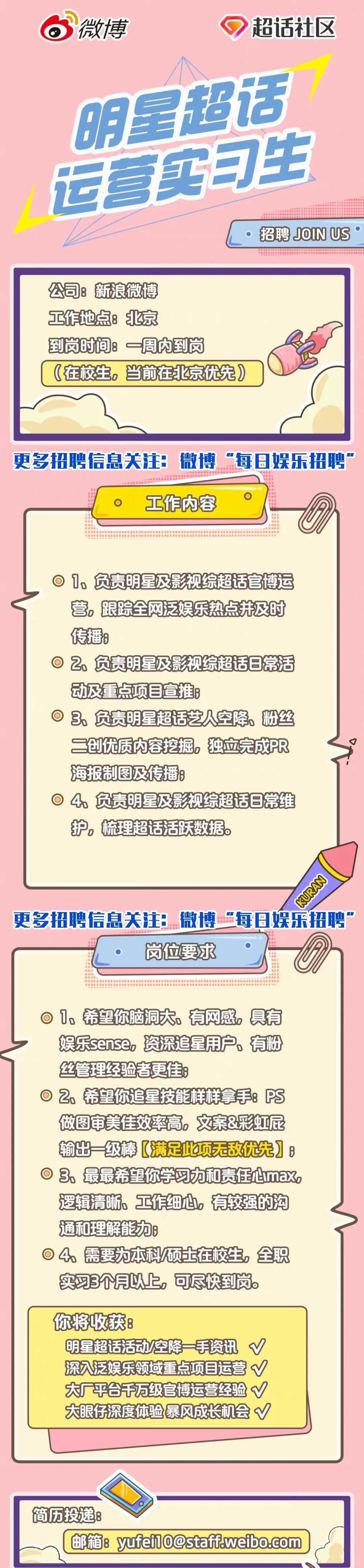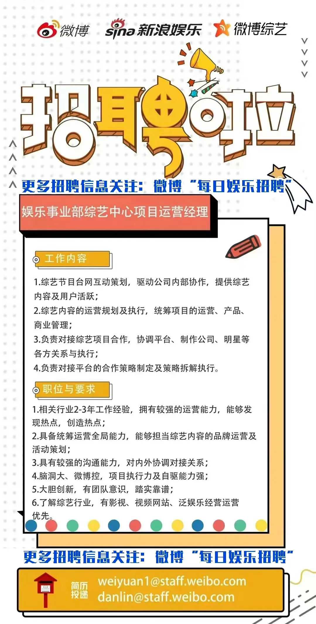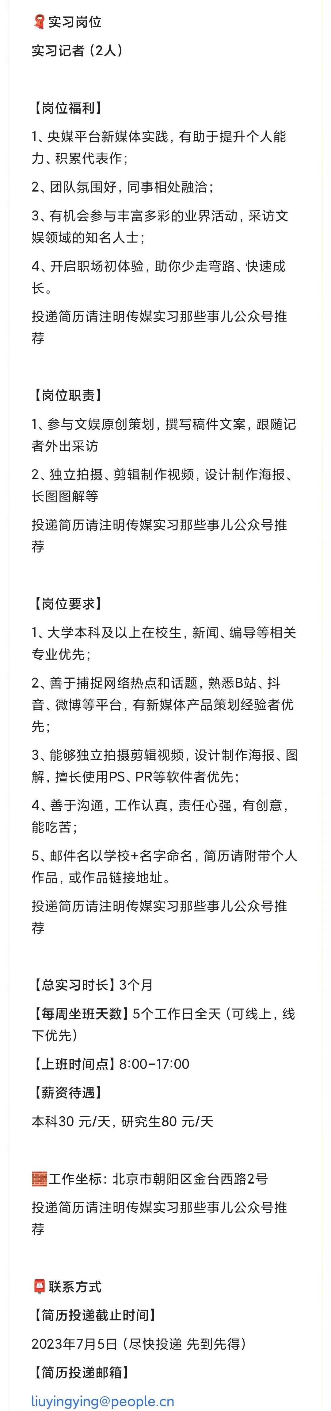 1、人民网招聘 2、界面新闻招聘新媒体运营全职/实习生 3、火星情报局节目招聘 4、新浪娱乐事业部综艺中心招聘 5、金鹰卡通制片组招聘 节目名称:2023《中国新声代》 6、人民阅读实习生(北京)招聘 7、微博明星超话社区运营实习生招聘 8、合屹文化招聘 整理:张芷潇