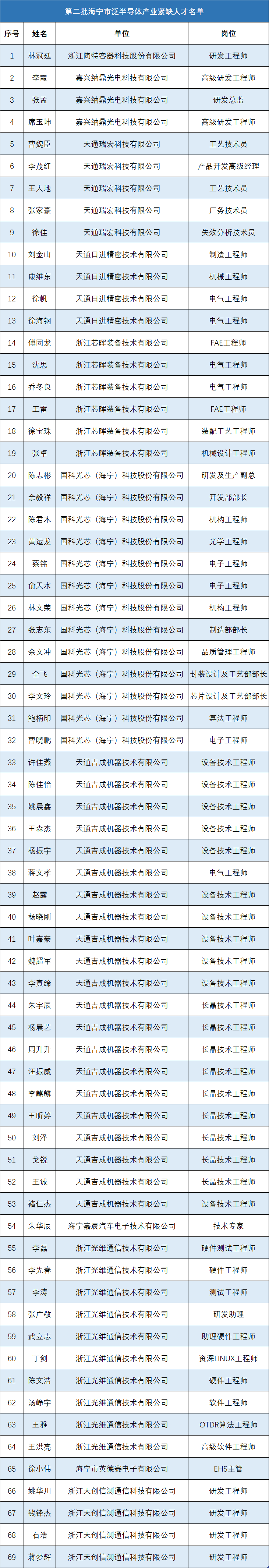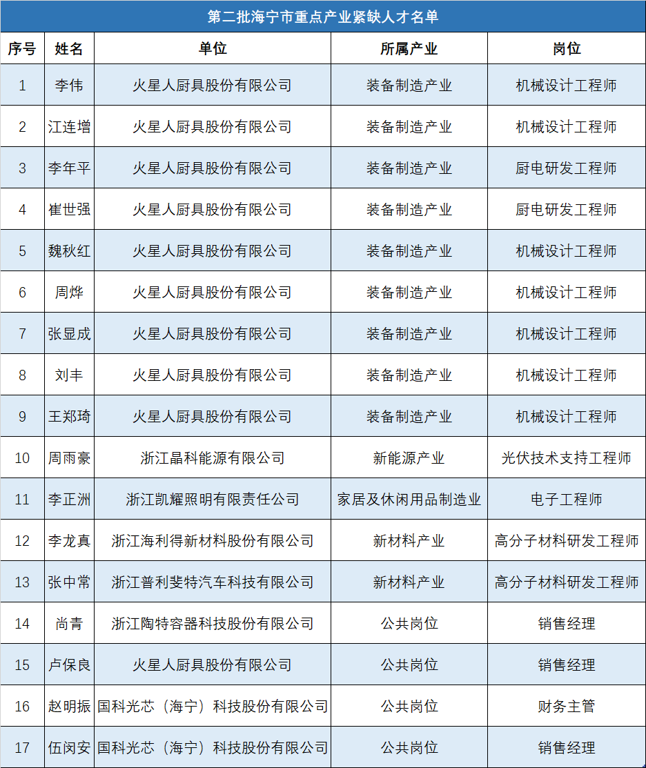 近日 海宁公布第二批紧缺人才名单! 共86人! 据悉 经认定的紧缺人才自正式引进之日起 可按照相关规定 享受重点产业紧缺人才奖补政策 关于公布 第二批海宁市重点产业及泛半导体产业 紧缺人才名单的通知 各镇人民政府、街道办事处,市级机关各部门、直属有关单位: 根据《海宁市引进重点产业紧缺人才资助实施办法(试行)》(海人社〔2018〕15号)及《海宁市支持泛半导体产业发展若干政策意见》(海政办发〔2018〕100号)等文件精神,经企业申报及我局审核确认,李伟等17人符合重点产业紧缺人才认定资格,林冠廷等69人符合泛半导体产业紧缺人才认定资格,现予公布(具体名单见下文)。 经认定的紧缺人才自正式引进之日起可按照相关规定享受重点产业紧缺人才奖补政策。 海宁市人力资源和社会保障局 2020年6月10日 ↓一起来看看完整名单↓ ▼ 有你认识的吗?