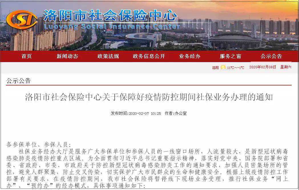 各参保单位、参保人员: 社保业务经办大厅是服务广大参保单位和参保人员的一线窗口场所,人流量较大,是新型冠状病毒感染肺炎疫情防控重点区域。为全面贯彻习近平总书记重要指示精神,落实好党中央、国务院部署和省委、省政府、市委、市政府关于防控新型冠状病毒感染肺炎工作的通知要求,加强人员密集场所的管控,避免人群聚集,防止交叉传染,切实保护广大市民群众的生命和健康安全。根据上级疫情防控工作部署有关要求,在疫情防控期间,我市社会保险将暂停线下现场业务受理,推行社保业务“网上办”、“预约办”的经办模式,具体事项通知如下: 一、暂停现场办理事项 1、暂停线下办理新参保登记、社保关系转移接续、在职退休(死亡)待遇申报、住院医疗费用手工报销、特殊门诊认定、工伤工亡申报以及人工窗口的业务咨询、受理、办理等事项。参保单位和个人可通过“河南省社会保障网上办事大厅”和“洛阳市社会保险网上办事大厅”,也可通过“河南社保”和“洛阳人社”以及“豫事办”手机APP查询、打印社保信息及参保证明。 2、暂停失业人员失业保险金申领业务,由原来收到用人单位解除或终止劳动关系之日起60日内申请,调整延长到我省重大公共卫生事件一级应急响应解除之后3个月内申领。 3、暂停职业技能提升补贴申领业务,对取得的职业技能等级证书、资格证书、专业技术类证书,如证书在2020年3月底达到一年期限的,调整延长到我省重大公共卫生事件一级应急响应解除之后三个月内申领。 4、暂停失业保险稳岗补贴业务办理时限,调整延长到我省重大公共卫生事件一级应急响应解除之后三个月内办理 5、暂停灵活就业人员参加企业职工养老保险办理新增保险业务。灵活就业人员在参保地的代理中心通过电话或微信报备后,待我省重大公共卫生事件一级应急响应解除之后三个月内再办理,可以从报备次月进行补缴,不加收滞纳金。 以上业务恢复时间视疫情发展形势另行通知。 二、特殊事项办理 1、对已参保缴费并被认定为工伤的因履行工作职责感染新型冠状病毒肺炎的医务人员和在疫情防控工作中遭受事故伤害的工作人员,开辟绿色通道、按照特事特办、急事急办原则优先处理,精减受理材料,开辟工伤待遇支付快捷通道,第一时间依法落实相关待遇。 2、2月份已申报的退休手续,我们将采取一站式审核和内部集中流转手续的办法进行办理。在办理过程中如有问题,我们将通过电话和参保单位或参保人员进行联系沟通,确保按时办结。截至2月份达到退休条件但没有给职工申报的单位,该系统办理停保手续,并在疫情结束待遇计算办结后进行补发,保障其退休待遇不受影响。 3、疫情结束前的需要办理退休申报的事项,我们将采取提前一次性告知,建立微信交流群、简化手续、电话预约等措施确保该项工作顺利进行。 4、对即将退休不能足额领取失业保险待遇的失业人员,我中心会通过电话预约的方式通知失业人员办理失业登记和失业金申领手续。 5、一是延长定点医药机构限时月结算票据的报送时间,不影响定点医药机构的正常费用结算;二是个人需手工报销的费用待疫情结束后再行受理,不因时间延长影响待遇享受;三是对重特大疾病备案程序进行调整,各定点医疗机构确诊患者符合重特大疾病标准的,在各就诊医院医保办可直接备案手续,四是异地安置备案手续可电话预约或传真异地安置备案表形式办理。五是异地就医转诊仍由医院即时办理。 6、在疫情防控期间凡是特殊疾病门诊认定的患者有效期到期的,暂不再组织集中体检,通过电话报备医疗监督科后继续有效。 7、新生儿参保登记业务,如新生儿住院且已在公安部门办理出生登记的,可在户籍所在地县(市、区)社保中心预约办理参保登记业务;其他新生儿参保登记暂停,疫情结束后在户籍所在地县(市、区)社保中心正常办理。新生儿出生当年至次年3月31日前,均可办理。 三、现场办理 特殊事项需要现场办理的,请通过电话预约办理。为了您及其他办事群众的身体健康,请您进入业务经办大厅时佩戴口罩。如有发热、咳嗽等不适症状,建议您先行就医,急需办理业务的,可与我中心电话联系。 四、网上办事大厅网址及预约咨询电话 1、河南省社会保障网上办事大厅网址: 洛阳市社会保险网上办事大厅 2、市社保中心预约电话: 市民之家值班电话 申报登记科 养老待遇科 医疗保险监督科 医疗保险费用审核科 居民医疗保险科 失业保险接收科 失业保险管理科 工伤待遇康复科 3、个人社保卡业务0379-12333 2020年2月4日