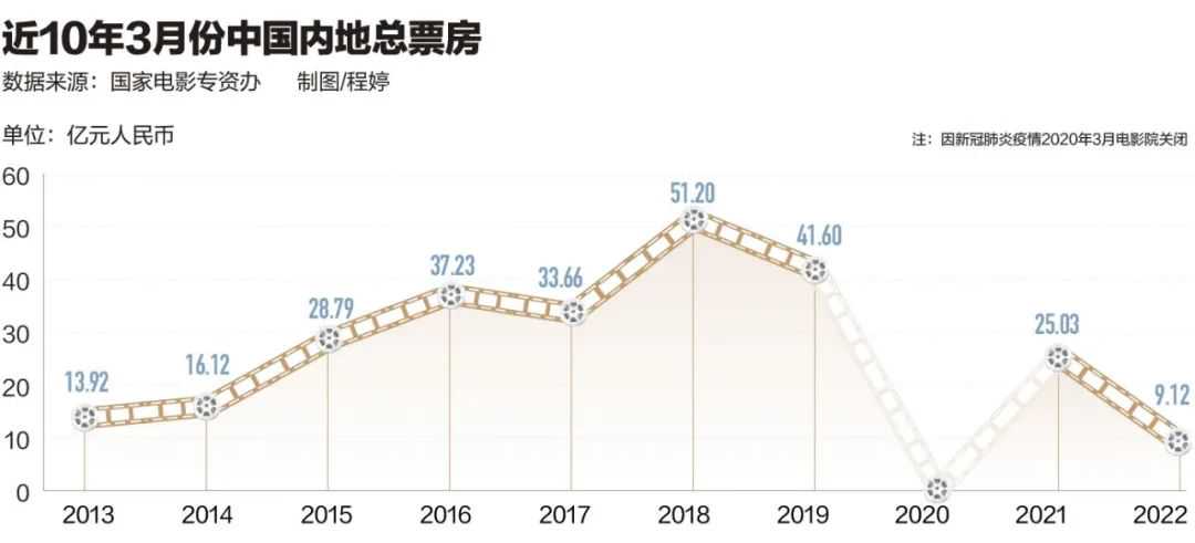 本刊记者/倪伟徐鹏远 发于2022.4.11总第1039期《中国新闻周刊》 “靴子落了地,济南影院即日起关门。”3月30日,董文欣在朋友圈转发了一张红头文件,语气平静地说道。当天,济南通报4例新冠阳性病例。 两天前,她还庆幸地对《中国新闻周刊》说,济南的影院都开着,只不过上座人数几乎都是个位数。她是济南百丽宫影城总经理,已经忍受了一个月的煎熬。3月以来,中国内地电影票房惨遭低谷,继两年前因疫情停摆之后,百丽宫影城再次面临入不敷出,当月收入不抵房租的困窘局面。 有的同行更惨,济南有一家影院一天只卖出去四张票,“还不如关门呢。” 新冠疫情暴发后,继初期停工的半年,电影院的第二次危机已经到来。今年3月,中国内地电影票房超低位运行。3月24日,内地总票房跌破1000万元,止步于965万元(不含服务费)。这是十年来,除疫情复工初期之外,内地单日票房最低的一天。每个影院平均每天卖出50张票,平均每场只有1.8人。 低潮延续至清明。清明节这个迷你档期每年都有5亿多元进账,去年,清明档上映的《我的姐姐》更是收获8.6亿票房。而今年,八部国产片撤档,新片仅有两部引进片《密室逃生2》和《精灵旅社4》撑场面,加上3月上映的《月球陨落》和《新蝙蝠侠》,清明档(4月3日~5日)全国票房最高是在首日为4657.13万元,票房最低在最后一日只有2915.54万元。 2020年7月20日,广东东莞CGV影院国贸店,一位首场观影的观众独自观看电影《中国合伙人》。自7月16日,国家电影总局网站发布了“低风险地区的电影院可以在7月20日有序恢复营业”后,CGV影院国贸店成为了东莞首家通过检查复工的影院。图/人民视觉 疫情无疑是最直接的原因,但在营业率低的表面原因之下,票房冰点还有更深层的缘由。投资收紧、开工不足、片荒来临、不敢上映……疫情再度暴发叠加疫情前的行业寒冬,对电影业的长远影响已经逐步浮现。观众不愿走进影院,实际上是因为没那么多值得去看的电影了。 两年前,人们还在担忧电影院的生死,像过节一样地迎接影院复工。两年后,当电影院再次落入困境,却连一声关心的询问都很难听见了。疫情以及疫情催生的行业重构,颠覆了人们与电影院的物理和心理距离。当影院已经看似可有可无,也许,“冰点时刻”才真正到来了。 3月18日,导演蔡成杰看完《新蝙蝠侠》,走出电影院,在手机上瞅了眼票房,低得让他诧异。他手头正有一部新作还没上映,感到一阵来自市场的寒意。“作为拍电影的人,都有这样的担忧吧,”蔡成杰告诉《中国新闻周刊》,“我也担心将来能不能收回成本,或者让出品方有点基本的收益。” 曾经拍出过《心迷宫》的导演忻钰坤也挺焦虑,这两年,他注意到因为对票房回收没有信心,很多影片撤档,片方囤积的影片太多,回款压力变大,投资新片的诉求就会减少。“影院的大面积停工,会产生非常持久的连锁反应,整个行业都会出现大面积裁员、公司倒闭。” 影院里的这场倒春寒,是在快速复苏中猝然降临的。疫情控制较为平稳的2021年,全国票房从上一年的203.14亿元拉升回472.58亿元,恢复到2019年的74%。万达影视集团总裁曾茂军去年预测,全球电影经过两年的沉淀,2022年将迎来电影市场大年。但事与愿违,今年开局并不顺利,春节档便遭遇同比23%的下滑,之后连滚带爬一路下行。 3月底之前,济南还没有收紧防疫政策,百丽宫影城的票房却跌到去年同期一半左右。影城总经理董文欣分析,今年春节比去年早,3月距离春节档比较远,春节档影片余热所剩无几。另外,新上映的大片也表现欠佳。去年3月,海外大片《阿凡达》和《哥斯拉大战金刚》接连上映,使得三四月这个传统淡季,每月也报收25亿元,而今年3月仅有9.1亿元入账。 这是10年来,除疫情影响被要求全部停工外,单月票房第一次跌破10亿元。 影院经理们在焦虑中等待救市强片的到来,超级英雄大片《新蝙蝠侠》被寄予最大的期待。然而,3月18日首映日这天,与《新蝙蝠侠》同时到来的,还有《国家电影局关于从严抓好电影院疫情防控工作的通知》。中高风险地区电影院一律暂不开放,可是一些并未出现确诊病例的城市,也主动关闭了影院。有观众电影看到一半,被通知立刻清场关门。最终,虽然电影口碑不错,票房却遭遇滑铁卢,八天后才艰难破亿。当然,这部电影的暗黑文艺气质,决定了其不可能成为超级爆款,但这样的票房着实难以匹配“超英片”的身份。 全国影院营业率锐减是票房走低最直接的原因。3月,全国影院营业率跌至50%以下,是自影院复工以来最低点。票房占比前四的城市上海、北京、深圳、广州中,沪深两城影院全部歇业,作为重要票仓的华东地区影院大面积停摆,对票房构成重大打击。即使在电影院正常开放的城市,影院也寒气逼人。为了迎接《新蝙蝠侠》,北京首都电影院将晚间的黄金场次大部分都留了出来,西单店晚间将近一半的场次都排映了该片,并且开了零点场。但增长乏力在第一天就很明显了。首都电影院副总经理于超分析,这跟全国大盘太低有关,“谁也没想到,全国大盘低到这个份儿上。” 一位影院从业者告诉《中国新闻周刊》,电影院里的氛围与社会氛围具有同频的特点:当整个社会心态较为积极,影院就会出现叫座的娱乐片;当社会在一段时期里弥漫着焦虑和紧张,人们也很难在影院里找到沉浸的感觉。这既可以在社会心理机制上找到原因,也伴随着