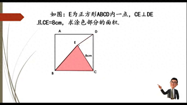 巧用"割补法"求面积(1)。 家人们,如果我说这道题难住了百分之九十的小学生,你想来挑战一下吗?知道正方形内有一个点E,CE和DE是垂直的,知道CE的长等于八厘米,求涂色部分的面积。 当我读完题,一定有人会想说:老师,这么简单的问题让你说的神乎其神,不就是正全等吗?从B点向底边做垂线,得到一个三角形BCF。假设用F来表示,证明三角形BCF和三角形CDE全等,就能证出BF等于CE等于八厘米。再用底乘高除以二,得到三角形的面积。 这种方法当然非常好,但是小学生并没有学过全等,就要想一种小学生能够接受的办法:割补法。把三角形EDC割下来,补到正方形的下边,就会发现这两个角原来相加是等于九十度的。把角一拿到下边,它俩的和仍然是九十度,这里是九十度,这里又是九十度。 一个四边形如果它的三个角都是九十度,一定就是长方形。就知道长方形的对边是相等的,从而求出了涂色部分的高也为八厘米。用底乘高除以二,就求出了它的面积为三十二平方厘米。