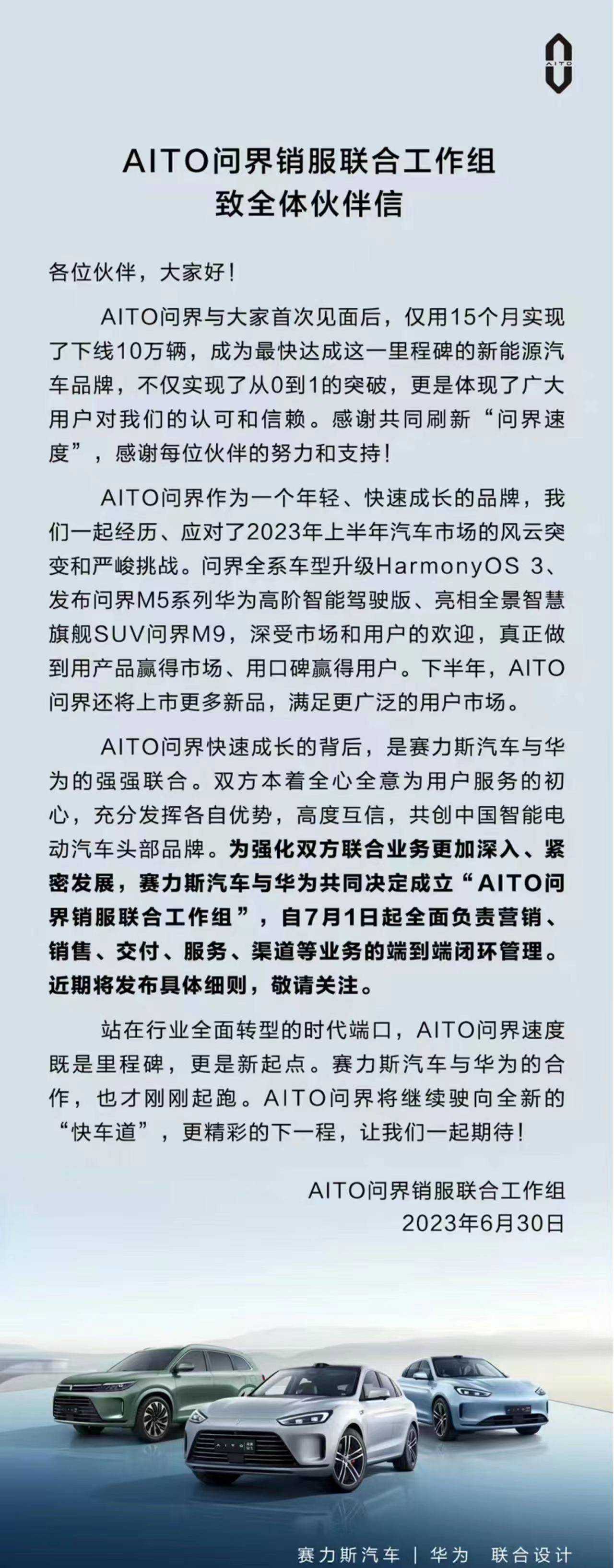 近日,AITO问界发布了致全体合作伙伴的一封内部信。信中称,为强化双方联合业务更加深入、紧密发展,赛力斯汽车与华为共同决定成立“AITO问界销服联合工作组”,自7月1日起全面负责营销、销售、交付、服务、渠道等业务的端到端闭环管理。 进入2023年,受市场需求不振、竞争加剧等一系列因素影响,问界销量持续低迷,前五个月累计销量仅2万多辆,月均销量4000辆左右。而且一向积极参与新势力每月一号销量海报大战的问界,并没有参与6月份的销量比拼,看来6月销量表现不会太好。 问界销服联合工作组很可能就是为了实现这一构想所做的准备,就在这一工作组宣布成立的前两天,有媒体报道了华为智选车业务正在建设专门用于销售智选车生态联盟车型的汽车销售门店,门店将统一使用“问界”生态品牌,渠道布局方式包括新建和旧有门店扩容,将优先从原来的手机端门店投资人中招募。 此外,得益于电动车的售后服务相对简单,所以华为打造这样一个服务体系难度和成本都不会太高,不过自己出手去组建一个能支撑年销30万辆,甚至更大规模的渠道体系,仍然需要很可观的投入,这毫无疑问会让华为智选车生态变“重”,这对于想以轻资产模式切入汽车产业的华为来说,并不是个好消息。