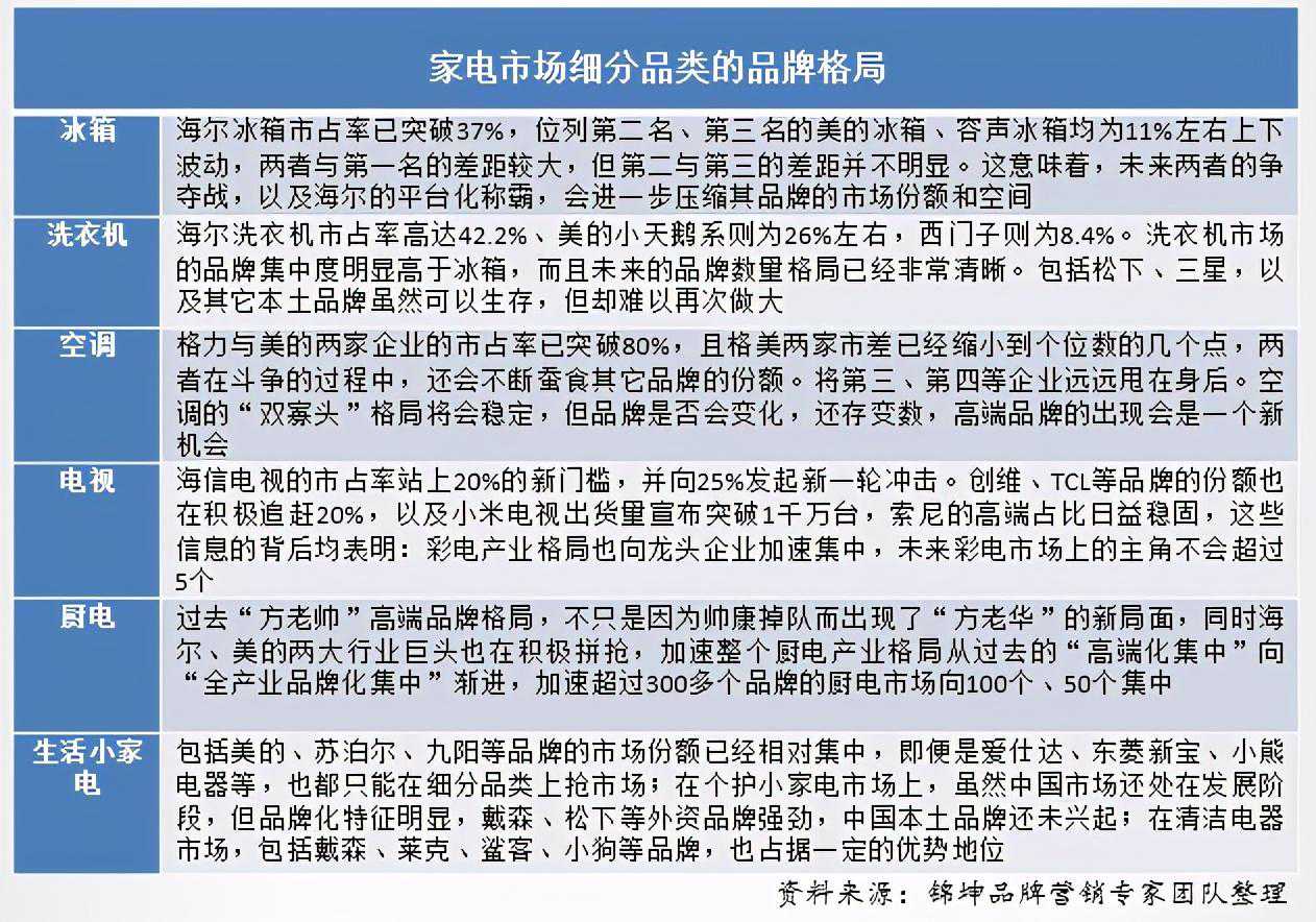 曾经无比辉煌的比当下的互联风有过之而不及的家电行业又开始了新的呼风唤雨,美的、格力、海尔的高歌猛进,海信、TCL的涅槃重生,小米、华为的跨界破局,进一步重塑和巩固了江湖地位和产业声浪。在互联网、物联网和5G风暴下,小电厨电快速发展,万亿产业指日可待,谁会是第一个千亿之王呢?又会以怎样的姿态出现在市场上? 文/锦坤家电专家团 曾经无比辉煌的比当下的互联风有过之而不及的家电行业,诞生了无数的商战传奇。科龙、容声、春兰、万宝等等当年不亚于当下的阿里、腾讯、京东,如今都已销声匿迹。 曾经的渠道老大国美更是家电行业当之无愧的老大,小目标老王当年拜访黄光裕时都以小弟自称,强势如苏宁也只能是屈居千年老二,当时的京东尚还没有出生。2018年国美巨亏将近50亿,已经处在一种非常危险的境地。好在创始人黄国裕已开始幕后掌控,期望国美能够重返江湖。 沧海桑田、行业巨变,并不是每个企业都能做到快速转型和变化,管理层动荡、转型不及时以及跨界者的进入,都是影响品牌生存和发展的关键因素。但是尽管倒下了一批老品牌,还是会有一批又一批的新品牌出现在消费市场上,通过产品、技术、模式等不断的创新为消费者提供更先进的产品和更好的使用体验。 家电行业可谓是中国改革开放40年的见证史。 谁是中国家电下一个千亿俱乐部成员? 海信、长虹和TCL从黑电板块的短兵相接开始到如今的拉锯战,已经很难有突破。 TCL更是连续5年千亿徘徊,2019年业务分拆后干就干脆退出千亿俱乐部,而曾经每三台电视就有一台是长虹的昔日电视一哥,如今电视业务也占比不到20%,只有海信一如既往的稳定领跑黑电市场,连续15年市场排名第一,在南非、澳洲、日本等国也是市场占有率第一。 而传统的白电三剑客海尔、美的和格力却是早早就突破了千亿大关,更是一度突破2000亿直逼3000亿的骄人业绩。 但是随着市场的快速变化,各家的发展路径却千差万别,开始全面分化,既有在家电品类上的竞争交集点,又有在智能家居上的共同追求,还有在其它新赛道、新品类上的各自探索、互不交集。 三大挑战下中国家电行业破局点在哪儿? 客观地说,家电行业的又一个黄金十年已过,从第一个黄金十年的产业红利到第二个黄金十年的地产红利,留给家电行业的行业红利越来越式微了。 与此同时,疫情又成黑天鹅,优势市场饱和,互联网化道阻且长,传统模式举步维艰,传统大电面临巨大挑战,志高、康佳等大电巨头已如明日黄花,就连格力这般大鳄也面临增长瓶颈。 小电厨电行业更是面临无数的新锐、黑马和互联网企业的冲杀,企业普遍未来面临巨大挑战和不确定性。 1.疫情常态化,全球经济陷入漫长下滑期,外部需求持续萎缩,企业内外部供需失衡 亚投行的评估报告指出,疫情可能对全球经济造成5.8万亿-8.8万亿美元的损失,相当于全球GDP的6.4%-9.7%。亚开行预测,亚太地区的疫情防控期如按半年估算,对应的区域经济损失在1.7-2.5万亿美元之间,占全球产出下滑总额的30%。其中中国将损失1.1万亿-1.6万亿美元。疫情可能将使全球GDP出现6%左右的下滑。经济下滑导致需求大幅度萎缩,以前靠内外贸两架马车同时发展的企业,只能依托于内需市场的快速恢复。 2.去全球化使得出口受阻,外循环变成内循环,对企业提出更高要求 外贸一般采取订单制,只要有稳定的客源,那么企业的重心则放在生产层面就好,但是内循环之后,企业不只要生产,还要建立起一整套从订单制到零售的营销体系,参与到市场竞争中去,这无疑给很多外贸企业出了一个很大的难题,在很多外贸企业内部,甚至完整的市场部都没有,更别说还要线上线下一体化、建立新零售体系等难题,这要求企业拥有非常高的决策和执行力,因为这次转换留给企业的窗口期很短,一旦国内消费市场全面恢复,则不会再留给外贸转内销的企业任何特殊机会。 3.后疫情时代,行业基本盘已经基本恢复,但由此引发的变化也会成为常态 受疫情影响,今年第一季度,线上家电市场零售额规模首次超过线下。但随着疫情得到控制,线下市场复苏明显,线上线下形成均分天下的局面。进入下半年,由于国家管控有力,疫情的影响已经结束,消费市场已经基本恢复,今年7-9月,我国家电市场零售额规模为2102亿元,比去年同期微增1.6%,线下零售额为1052亿元,线上为1050亿元。线下市场规模依然呈下降趋势,同比降幅17.8%。由于市场消费习惯的形成、促销手段的多样化、渠道布点的下沉,线上市场增幅重新上扬,增速为26%。今年前三季度,我国家电市场整体零售额规模为5792亿元,同比下降8.6%,前三季度零售额分别为1204亿元、2486亿元和2102亿元。线下家电零售规模为2829亿元,线上零售规模仍高于线下,为2963亿元,线上渠道整体占比达51.16%。 与此同时,经过疫情的洗礼,家电渠道加速整合,线上线下融合的新型消费模式和产业生态正在形成,线上线下界线日趋模糊,渠道正在洗牌。 从零售商格局看,市场向优势渠道商聚拢,市场占比在5%-10%之间的中间层渠道商几乎绝迹,占比在5%以下的渠道商面临与优势渠道商结盟的命运。从份额看,第三季度,京东、苏宁、天猫分别以23.64%、19.6%、17.51%的份额占据60.75%的市场份额;从1-9月整体看,市场集中度更高,三强份额达63.35%,分别为:京东以26.97%位列第一,苏宁以20.98%位列第二,位列第三的天猫份额为15.4%。 同途殊归