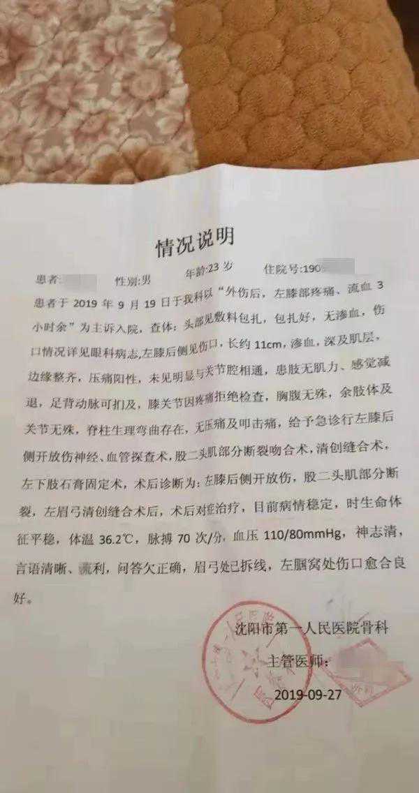 昨天上午,微博@用户5630021383发文求助称,因评定奖学金引发矛盾,他于9月19日在校内遭同学持刀捅伤,腿部留下一道11cm的伤口,照片上看伤口触目惊心。目前事情已过去3个月,事情仍没有处理结果,希望曝光此事,为自己讨个说法。 昨晚7时许,沈阳市公安局对外发布,正在抓捕涉嫌故意伤害沈阳大学学生王某宇的犯罪嫌疑人。 根据@用户5630021383的自述,他叫王某宇,23岁,沈阳大学研二硕士在读,2019年9月19日中午,学院评定奖学金,两名同学因不满对其报复,自己在两名同学的带领下来到学生会办公室,屋里有个陌生男子等着,三人随后将门反锁,对其进行辱骂、殴打。最终造成王某宇眉骨被划伤4cm,大腿划伤11cm,跟腱断裂。 王某宇表示,89天来,自己在医院床上大小便失禁,坐轮椅拄拐杖,非常痛苦,“从一个马拉松选手成长为一个瘸子”,希望为自己讨一个说法。 18日下午,记者联系到发博人小张 得知此事缘于一场比赛 2018年11月,小张与同班的两名女同学王某某、丛某某 以及另两位同学一起 参加了“辽宁省首届研究生ERP沙盘模拟大赛” 并获得一等奖 小张参加的比赛,图中手捧证书者为小张↑ 2019年9月,学校在评定奖学金时,考虑到此次比赛成绩优异,决定小组负责人可获得额外加分。于是,小张和丛某某、王某某就谁是小组负责人这一问题发生了矛盾。后三人均没被学校认定为此次比赛小组负责人,均被取消了加分。 “19号那天我们都在老师那儿签了字,表示接受,我没什么意见就去自习了,然后丛某某和王某某就来喊我,叫我去谈点事。”小张告诉记者,丛某某和王某某将他带到研究生院学生会所属的一间办公室。当时办公室里还有一个人,他是王某某的男友马某。 “丛某某是学生会的干事,她有那儿的钥匙。”据小张介绍,进入办公室后,王某某便将办公室门锁死,并与另外两人一起对他进行辱骂,四人爆发了争执。“我当时听不下去想走,但门锁了出不去,然后他(马某)就拿一把刀捅了过来,他对象(王某某)还抱着我让他捅。” 遭刀捅后,小张见无法脱身只得向三人求饶,王某某与丛某某看他满身鲜血,遂要求马某将其“弄出去”,王某某和丛某某则留在办公室内清洗血迹。后来他们被学校老师发现,小张便被送往沈阳市第一人民医院接受治疗。 记者查询到,王某宇为沈阳大学研究生会组织部部长。此前照片看上去非常健康阳光。 18日下午,记者就此事联系沈阳大学党委宣传部,一名工作人员表示,确有此事发生,但她也告诉记者,事情发生后小张始终不肯去派出所做笔录,导致警方始终无法结案。由于警方无法结案,校方也无法决定该如何处理几位涉事学生。不过记者事后向小张求证时,他表示“绝对没有(此事),我在沈阳70多天,始终在打电话找警察,找学校解决此事。” 该校党委宣传部的另一名工作人员告诉记者,学校正就此事召开会议,最迟会在12月19日早上就此事发布官方声明。 据沈阳市公安局官方微博12月19日凌晨通报,9月19日,沈阳大学2018级研究生王某宇被本校同学殴打并持水果刀划伤致轻伤二级。沈阳市公安局经过初步调查,已决定将案件提级管辖,由市局成立专案组负责侦办此案,务求将该案办成铁案。 通报说,已责成由市局纪检监察、警务督察和法制控申等部门组成的联合调查组,对该案执法办案过程全面彻查,并据情对存在慢作为等问题的责任人员依纪依规严肃处理。案件侦办和调查处理情况将及时向社会公布。 通报称,沈阳市公安局衷心感谢广大网友一直以来对沈阳公安工作的厚爱与监督,希望广大网友继续对我们的工作给予关心和支持。
