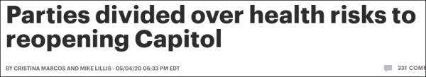 (文/观察者网郭涵)特朗普敦促各地复工之际,休会一个多月的美国国会也要带头做表率,今明两周将分别重开参、众议院。可两党议员人还未到,首个争议话题已经出现:国会山如今是否仍有传染风险。 原来有媒体曝出,17名两周前在众议院办公楼装修的建筑工人,已确诊感染新冠病毒。当时在场和即将复工的议员与助理们,因未被提前告知此事而感到紧张。知情人士透露,这些工人与其他人没有直接接触。 3月以来,已有1名参议员、7名众议员确诊新冠肺炎,47人先后接受隔离。民主党认为,应谨慎评估议员到场的风险,提出允许远程投票、禁止议员在办公室过夜。共和党则反对远程投票,批评民主党在关键时刻“缺席”。 截图:《国会山报》 据《国会山报》3道,过去两个月几乎处于“歇业”状态的国会山,本周将率先开放参议院,拥有超过400名议员的众议院开放时间则被推迟到下周。此外,两党领袖对于如何安全地议事存在分歧。 共和党认为,随着越来越多的州在特朗普鼓励下解除“社交隔离”,国会也应该尽快恢复运作,作为“面向全国工人的政治宣示”。民主党则持谨慎态度,认为应听取专家意见,避免过早重开导致二次感染。 美国国会众议院一栋办公楼出现17名建筑工人确诊 4月29日,美国政治新闻媒体“RollCall”报道,前一周在众议院坎农办公楼(CannonHouseOfficeBuilding)内部从事装修工作的建筑工人中,已有17人确诊新冠肺炎。就在23日,好几名众议员与助理在楼内参加了对4840亿美元纾困法案的投票,还有记者进行采访。“RollCall”创刊于1955年,是一家位于华盛顿特区专门报道国会立法、竞选等政治议题的新闻机构。 坎农办公楼位于国会大厦东南部,两者仅一街之隔。该楼建于1908年,是国会最老的建筑,近年来屡次曝出卫生与环境问题。其维修工作始于2015年,耗资8亿美元,预计将持续至2024年。 众议院坎农办公楼图自:国会大厦建筑管理局 令议员感到紧张的是,办公楼的管理机构国会大厦建筑管理局(ArchitectoftheCapitol)、处理一般事务的众议院行政委员会,都没有发布工人确诊的通知。一些助理是通过杂志和社交媒体才得知此事。有人向众议院领导层发邮件询问,但未获正式回复。 行政委员会一名资深民主党助理透露,这些工人是通过单独通道进入大楼,且工作环境与楼内的其他人没有直接接触。 得克萨斯州民主党议员科林·阿雷德周一对此表示,专家与医生的意见都是“(国会山)还有严重的疫情”,必须要找到一种“尽可能高效”的远程工作方式。民主党正策划推出提案,允许议员远程投票。 加州民主党议员杰基·斯贝尔当天也提出,应禁止议员们在国会大楼办公室内睡觉的做法,减少被感染的风险。 伊利诺伊州众议员麦克·奎格利在办公室内铺床图自:社交媒体 《国会山报》估计,大约有数十名众议员会睡在办公室,主要因为华盛顿特区房租太贵,但没有已知的参议员这么做。前南达科他州女议员克里斯蒂·诺姆(现该州州长)透露,她曾在国会办公室睡觉时遇见一只老鼠。 共和党则对于众议院推迟开放表示不满,并拒绝远程投票的提议,称在参院共和党人努力工作之际,民主党却“缺席”。自3月下旬国会正式休会以来,后者就曾靠“玩失踪”来阻挠纾困法案的投票。 共和党众院领袖麦卡锡周一提出,可以采取在安检处架设玻璃、逐渐开放委员会活动以及限制每周出席投票人数上限等方式,确保安全。 民主党这边,面临换届选举压力的议员也有强烈的复工意愿。众议院议长佩洛西表示,本周会安排至少一场委员会,尤其是调查特朗普政府抗疫表现的听证会。不过,白宫已经阻止医疗专家福奇出席作证。 参议院方面,共和党领袖麦康奈尔表示本周会照常安排线下会议。“我们本来就是‘关键工作者’,会名副其实地投入工作。”民主党参议员则主要选择了电话会议的方式。 麦康奈尔与佩洛西还一致拒绝了白宫为议员提供新冠病毒检测试剂盒的建议。他们在联合声明中说,试剂盒应优先供应一线医务人员。以至于特朗普还在推特上调侃,“有趣,国会……想说他们‘不关键’。” “全国公共广播”(NPR)曾统计,自3月份以来,国会已经有1名参议员、7名众议员确诊新冠肺炎,47人先后接受隔离。截至4月27日,国会警察局也有12名警员确诊。 本文系观察者网独家稿件,未经授权,不得转载。