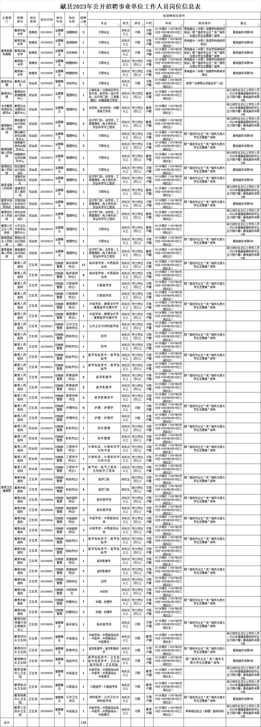 献县2023年公开招聘事业单位工作人员公告 根据《事业单位人事管理条例》《河北省事业单位公开招聘工作人员暂行办法》《沧州市事业单位公开招聘工作人员实施办法》,结合我县实际,经县政府研究决定,面向社会公开招聘事业单位工作人员132名。现公告如下: 一、招聘原则 坚持德才兼备的用人标准,贯彻民主、公开、竞争、择优的原则,在考试、考察的基础上择优聘用。 二、招聘方式 本次招聘采取统一招聘方式。按照制定招聘方案、发布招聘公告、报名及资格审查、笔试、面试、体检、资格复审、考察、拟聘人员公示、聘用等步骤进行。 三、招聘数量和岗位 根据上级批复的事业单位招聘工作人员计划,此次公开招聘共有招聘岗位63个,招聘工作人员132名。各招聘单位具体招聘人数和岗位条件详见《献县2023年公开招聘事业单位工作人员岗位信息表》(附件1)。 四、招聘对象和条件 (一)招聘对象 招聘对象为2023年7月底及以前毕业的国家承认学历的大学专科及以上学历毕业生(以学信网查询结果为准)。国外留学人员需经认证。 硕士研究生及以上学历人员、2023年普通高等院校毕业生不限户籍;其他报考人员除报考招聘单位要求不限户籍的岗位外,须具有献县户籍。 (二)应聘人员应具有以下基本条件 1.具有中华人民共和国国籍; 2.遵守宪法和法律,具有良好的品行和职业道德; 3.具有与招聘岗位要求相适应的年龄、学历学位、专业、资格证书等条件; 4.适应岗位要求的身体条件; 5.具备岗位所需要的其他条件。 留学回国人员和其他海外、外国学历学位获得者的专业名称与招聘岗位要求专业名称不完全一致,但所学专业课程与招聘岗位专业课程大部分相同,且符合该岗位所需要的其他条件的,也可报考该招聘岗位。 凡涉及年龄、户籍、工作经历等需要确定时间的,计算日期截止到报名第一天。 (三)部分岗位条件的说明 1.本次招聘部分岗位限“高校毕业生”报考,包括以下人员: (1)纳入国家统招计划、被普通高等院校录取的2023年应届高校毕业生。 (2)国家统一招生的2021年、2022年普通高校毕业生在择业期内未落实工作单位的。 (3)2023年取得国(境)外学位并完成教育部门学历认证的留学回国人员及2021年、2022年取得国(境)外学位并完成教育部门学历认证且未落实工作单位的留学回国人员。 (4)参加“服务基层项目”前无工作经历,服务期满且考核合格后2年内未落实工作单位的人员。 (5)普通高等院校在校生或毕业当年入伍,退役后(含复学毕业)2年内未落实工作单位的退役士兵。 2.岗位条件中“服务冬奥大学生志愿者”是指2023年应届毕业生中服务冬奥会、冬残奥会的大学专科及以上学历志愿者。 3.职业院校毕业生报考时,在符合专业等其他条件的前提下,技工院校预备技师(技师)班毕业生可报名应聘学历要求为大学本科的岗位,高级工班毕业生可报名应聘学历要求为大学专科的岗位。 4.面向社会招收的普通高校应届毕业生经住院医师规范化培训合格后当年在医疗卫生机构就业的,按应届毕业生同等对待;经住培合格的本科学历临床医师,按临床医学、口腔医学、中医专业学位硕士研究生同等对待。 (四)有下列情形之一的人员不得报考 1.曾因犯罪受过刑事处罚的和曾被开除公职的; 2.现役军人; 3.被依法列为失信联合惩戒对象的人员; 4.试用期内的公务员和试用期内的事业单位工作人员; 5.未满最低服务年限或未满约定最低服务期限的人员; 6.全日制普通类高校在读的学生; 7.法律、法规、规章及政策文件规定的不得招聘为事业单位工作人员的其他情形人员; 8.应聘人员不得报考聘用后即构成回避关系的招聘岗位。回避关系包括《事业单位人事管理回避规定》第六条和《河北省事业单位公开招聘工作人员暂行办法》第四十一条所列情形。 五、招聘程序 (一)发布公告 通过献县人民政府官网()面向社会发布《献县2023年公开招聘事业单位工作人员公告》。公告发布时间不少于7个工作日。 (二)报名 1.报名办法 报名采取现场报名的方式,报名时间不少于2个工作日。2023年8月19日上午9:00开始公开招聘报名工作,截止时间为2023年8月21日下午5:00。每人只能报考一个岗位。 2.资格审查 资格审查由县人社局组织实施。报考人员可登录献县人民政府官网下载《献县2023年公开招聘事业单位工作人员报考资格审查表》(附件2,一式两份),持本人有效期内二代居民身份证(报名与考试时使用的身份证必须一致)、户口本(要求复印户主页及本人页)、毕业证、学位证、教师资格证及相关证件原件和复印件,近期免冠彩色1寸照片6张;服务冬奥会大学生志愿者,须提供相关证明材料。报考人员须在规定时间内到县人社局二楼大厅报名。 按照岗位条件,对报考人员提供的证件进行审查,经审查合格后每人交纳报名考务费100元。 3.开考比例 同一岗位报考人数与招聘计划数的比例不低于2:1,达不到这一比例的,经领导小组研究决定,减少或取消该岗位招聘人数,并通知报考该岗位人员。被取消招聘岗位的报考人员可在规定时间内改报一次其他符合招聘条件的岗位。请考生保持报名时所留联系电话的畅通,以便通知有关事宜,避免造成不必要的损失。 (三)考试 考试分笔试与面试两部分。考试由县人社局统一组织。纪检监察部门全程监督。 1.笔试 笔试采取闭卷考试的方式进行。满分100