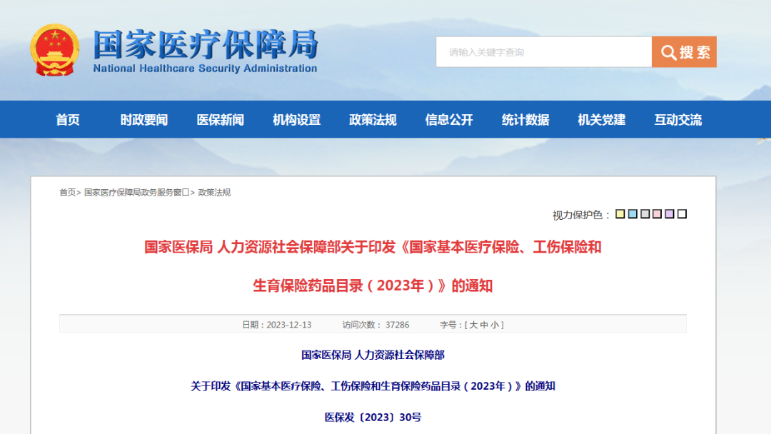 国家医疗保障局政策法规国家医保局人力资源社会保障部关于印发《国家基本医疗保险、工伤保险和生育保险药品目录(2023年)》的通知()