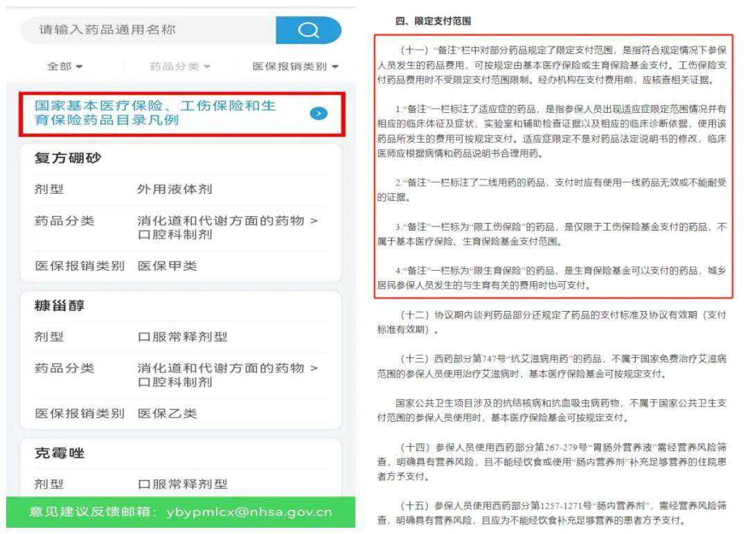 举例说明:如“重组牛碱性成纤维细胞生长因子”的备注显示“限Ⅱ度烧伤”,也就是说只有确诊Ⅱ度烧伤的患者用该药品才可报销。