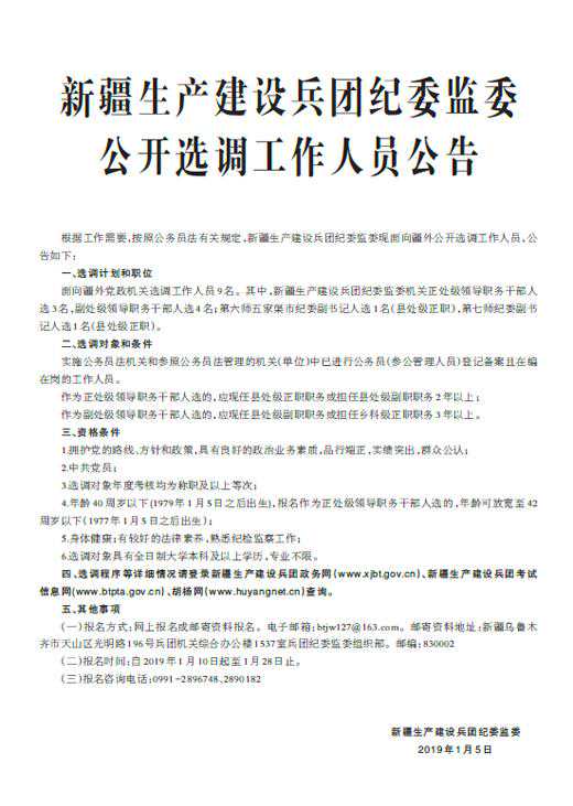 根据工作需要,按照公务员法有关规定,新疆生产建设兵团纪委监委现面向疆外公开选调工作人员,公告如下: 一、选调计划和职位 面向疆外党政机关选调工作人员9名。其中,新疆生产建设兵团纪委监委机关正处级领导职务干部人选3名,副处级领导职务干部人选4名;第六师五家渠市纪委副书记人选1名(县处级正职),第七师纪委副书记人选1名(县处级正职)。 二、选调对象和条件 实施公务员法机关和参照公务员法管理的机关(单位)中已进行公务员(参公管理人员)登记备案且在编在岗的工作人员。 作为正处级领导职务干部人选的,应现任县处级正职职务或担任县处级副职职务2年以上; 作为副处级领导职务干部人选的,应现任县处级副职职务或担任乡科级正职职务3年以上。 三、资格条件 1.拥护党的路线、方针和政策,具有良好的政治业务素质,品行端正,实绩突出,群众公认; 2.中共党员; 3.选调对象年度考核均为称职及以上等次; 4.年龄40周岁以下(1979年1月5日之后出生),报名作为正处级领导职务干部人选的,年龄可放宽至42周岁以下(1977年1月5日之后出生); 5.身体健康;有较好的法律素养,熟悉纪检监察工作; 6.选调对象具有全日制大学本科及以上学历,专业不限。 四、选调程序等详细情况请登录新疆生产建设兵团政务网()、新疆生产建设兵团考试信息网()、胡杨网()查询。 五、其他事项 (一)报名方式:网上报名或邮寄资料报名。电子邮箱:btjw127@163.com。邮寄资料地址:新疆乌鲁木齐市天山区光明路196号兵团机关综合办公楼1537室兵团纪委监委组织部。邮编:830002 (三)报名咨询电话:、2890182 新疆生产建设兵团纪委监委 2019年1月5日 《》(2019年01月05日06版)