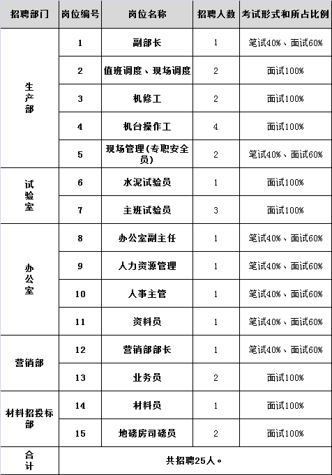 南京江北新区混凝土有限公司现根据实际工作需要,决定面向社会公开招聘工作人员25名,具体招聘简章如下: 一、报考条件: (一)应聘人员需具备的基本条件 1、具有中华人民共和国国籍,享有公民的政治权利,拥护党的路线、方针、政策; 2、遵纪守法,品行端正,团结协作,廉洁奉公,吃苦耐劳; 3、具有良好的个人品行和职业操守,责任心和团队合作意识强,爱岗敬业,无违法违纪等不良行为; 4、具备岗位所要求的身体条件; 5、具备岗位所需要的其他条件(详见《岗位信息表》)。 (二)应聘人员有下列情形之一,不得应聘 1、现役军人、院校在读人员; 2、单位辞退或解聘未满五年的原机关事业单位工作人员; 3、尚未解除纪律处分或者正在接受纪律审查的人员、刑事处罚期限未满或者涉嫌违法犯罪正在接受调查的人员。 二、招聘岗位、人数及任职要求 具体岗位信息请下载附件《南京江北新区混凝土有限公司2019年第二批次公开招聘专业人才岗位信息表》,共计招聘25人。 三、招聘程序与办法 招聘工作按照报名、资格审查、笔试、面试、体检、公示、决定录用等程序进行,具体环节如下: (一)简章公示 1、招聘简章在领航招聘网()、领航招聘微信公众号上发布。 2、公示时间:2019年3月11日至2019年3月27日中午12时。 (二)报名阶段 1、报名时间:2019年3月11日至2019年3月27日中午12时。 2、报名方式: 2.1邮箱报名。 报名时间以邮件发送时间为准,逾期将不接受报名。 2.2现场报名。 需携带本人身份证、学历证书/学位证书、学信网学历证明(以上材料均需提供原件及复印件)以及本人2寸近期免冠证件照两张前往以下报名地点,并现场填写报名登记表。 现场报名地点:江苏领航人才开发有限公司。具体地址:秦淮区龙蟠中路323-1号,领航人才大厦四楼。 该报名点接收报名时间:报名周期内工作日(周一至周五)上午9:00-11:30,下午14:00-17:00。 报名咨询电话:,。 (三)资格审查 根据招聘公告确定的资格条件,对应聘人员的学历、年龄、任职经历等进行审查,应聘人员须如实提供个人信息和材料,凡弄虚作假者,一经查实,即取消考试或聘用资格。 1、资格审查时间:以具体通知为准。 2、资格审查地点:以具体通知为准。 3、资格审查须携带材料: ①本人身份证原件及正反面复印件; ②学历证书原件及复印件、学位证书原件及复印件; ③学信网学历证明打印件; ④工作证明(劳动合同、单位盖章工作证明、单位缴纳社保记录等); ⑤岗位要求的相关资质/资格证书原件及复印件; ⑥本人2寸近期免冠证件照两张。 (以上材料已现场报名递交齐全者无需重复递交) 4、资格审查须由本人参加,材料缺一不可,合格人员当场领取笔试准考证,不合格人员的应聘材料由招聘机构收纳存档。 (四)笔试 1、笔试名单。按照简章发布的岗位要求,需要笔试的岗位应聘人员,经资格审查合格后凭准考证参加笔试。 2、笔试时间:以具体通知为准。笔试地点以准考证上信息为准。 3、笔试采取闭卷形式纸笔测试,试卷满分为100分,测试时限为120分钟。试题由专业考试机构出具。笔试内容不指定考试教材,主要测试应聘者的公共基础知识、行政职业能力、职业道德素质。 4、笔试成绩达到卷面总成绩60%为合格,不合格者直接淘汰。笔试成绩出具后将在领航招聘网()上进行公示,公示期3天。 (五)面试 1、面试形式。采用半结构化面试,通过对应聘人员过去的行为进行全方位的了解,从而预测应聘者能否适合新的岗位。 2、按照简章发布的岗位要求,需要笔试的岗位应聘人员,在笔试合格者中,根据各岗位综合成绩从高分到低分择优,按照拟聘人数1:3的比例确定面试人员名单(若该岗位笔试合格人数不达相应比例的,则按实际人数确定面试人选)。不需要笔试的岗位,在资格审核合格后确认面试名单。 3、面试时间:以具体通知为准。 4、面试成绩不当场公布。按照《南京江北新区混凝土有限公司2019年第二批次公开招聘专业人才岗位信息表》要求,计算总成绩后,在领航招聘网()对综合成绩进行公示,公示期3天。 5、面试总分100分,设置合格线60分,面试成绩低于合格线者无录用资格。 (六)体检 根据各岗位总成绩排名,按各岗位拟聘人数1:1的比例从高分到低分确定参加体检人员(如遇总成绩并列,按笔试成绩排序;若笔试成绩亦并列,则按笔试试卷分值最高题得分排序)。若被通知人员放弃体检或体检不合格者,则按各岗位总成绩从高分到低分确定递补人员。 (七)录用 对体检、考察合格的拟录用人员于领航招聘网()上进行公示,公示期3天。若被录用人员没有在规定时间内到岗或放弃,则按各岗位总成绩从高分到低分确定递补人员。实际录用人数不足计划拟聘用人数的按实际人数录用。 四、劳动关系 经体检及考察合格人员,公示期满后,对拟聘用人员进行录用,与第三方签订劳动合同。根据《劳动法》规定实行试用期,缴纳五险一金。试用期满且考核合格者决定正式聘用;试用期考核不合格者,取消聘用资格。 本简章由南京江北新区混凝土有限公司负责解释。 详情请戳链接