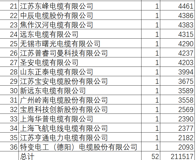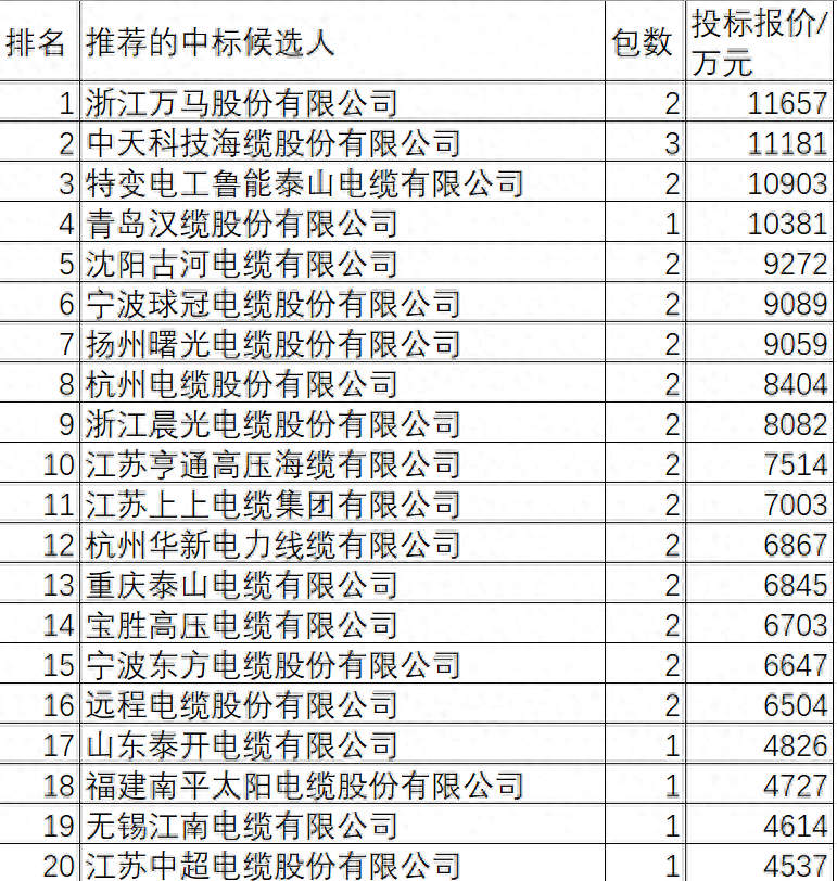 国家电网有限公司2024年第一批采购(输变电项目第一次变电设备(含电缆)招标采购)(招标编号:0711-240TL00211001)推荐的中标候选人于2024年3月7日公示。电能革新/命号以国网2024-1变电的名称进行分析。 电能革新/命号对此批电力电缆以国网2024-1电力电缆名称进行中标情况分析。 国网2024-1电力电缆共招52包211517万元,由36家供应商中标提供。 36家中标供应商中,最低的过2000万元,27家金额过4000万元,16家过6000万元,9家过8000万元,4家过1亿元。 国网2024-1电力电缆211517万元36企中标榜单 第1的浙江万马股份有限公司中2包11657万元,占总金额的5.5%。 第2的中天科技海缆股份有限公司中3包11181万元,占总金额的5.3%。 第3的特变电工鲁能泰山电缆有限公司中2包10903万元,占总金额的5.2%。 第4的青岛汉缆股份有限公司中1包10381万元,占总金额的4.9%。 第5的沈阳古河电缆有限公司中2包9272万元,占总金额的4.4%。 第6的宁波球冠电缆股份有限公司中2包9089万元,占总金额的4.3%。 第7的扬州曙光电缆股份有限公司中2包9059万元,占总金额的4.3%。 第8的杭州电缆股份有限公司中2包8404万元,占总金额的4.0%。 第9的浙江晨光电缆股份有限公司中2包8082万元,占总金额的3.8%。 第10的江苏亨通高压海缆有限公司中2包7514万元,占总金额的3.6%。 第11的江苏上上电缆集团有限公司中2包7003万元,占总金额的3.3%。 第12的杭州华新电力线缆有限公司中2包6867万元,占总金额的3.2%。 第13的重庆泰山电缆有限公司中2包6845万元,占总金额的3.2%。 第14的宝胜高压电缆有限公司中2包6703万元,占总金额的3.2%。 第15的宁波东方电缆股份有限公司中2包6647万元,占总金额的3.1%。 第16的远程电缆股份有限公司中2包6504万元,占总金额的3.1%。 山东泰开电缆有限公司、福建南平太阳电缆股份有限公司、无锡江南电缆有限公司、江苏中超电缆股份有限公司、江苏东峰电缆有限公司、中辰电缆股份有限公司、焦作汉河电缆有限公司、远东电缆有限公司、无锡市曙光电缆有限公司、江苏普睿司曼科技有限公司、圣安电缆有限公司、山东正泰电缆有限公司、江苏宝安电缆股份有限公司、新远东电缆有限公司、广州岭南电缆股份有限公司、宝胜科技创新股份有限公司、上海华普电缆有限公司、上海飞航电线电缆有限公司、江苏亨通电力电缆有限公司、特变电工(德阳)电缆股份有限公司20家企业中标金额在4826万元-2093万元,位居第17-第36。 汉缆的青岛汉缆股份有限公司、焦作汉河电缆有限公司2家企业合计中14764万元,占总金额的7%,位居第一品牌。 特变的特变电工鲁能泰山电缆有限公司、特变电工(德阳)电缆股份有限公司2家企业合计中12996万元,占总金额的6.1%,位居第二品牌。 浙江万马股份有限公司一家占5.5%,对应品牌位居第三。 中天科技海缆股份有限公司一家占5.3%,对应品牌位居第四。