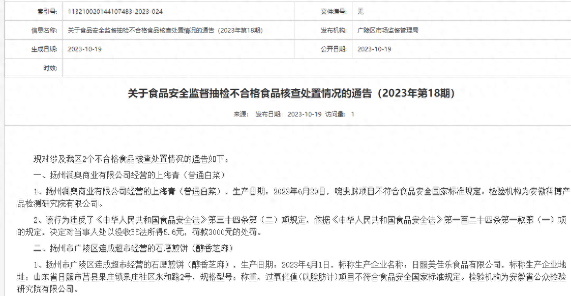 江苏扬州市广陵区市场监督管理局19日发布不合格食品核查处置情况的通告(2023年第18期),涉及该区2个不合格食品,其中,扬州润奥商业有限公司经营的一批次上海青(普通白菜)抽检不合格被罚款3000元。 核查处置情况的通告如下: 一、扬州润奥商业有限公司经营的上海青(普通白菜) 1、扬州润奥商业有限公司经营的上海青(普通白菜),生产日期:2023年6月29日,啶虫脒项目不符合食品安全国家标准规定。检验机构为安徽科博产品检测研究院有限公司。 2、该行为违反了《中华人民共和国食品安全法》第三十四条第(二)项规定,依据《中华人民共和国食品安全法》第一百二十四条第一款第(一)项的规定,决定对当事人处以没收非法所得5.6元,罚款3000元的处罚。 二、扬州市广陵区连成超市经营的石磨煎饼(醇香芝麻) 1、扬州市广陵区连成超市经营的石磨煎饼(醇香芝麻),生产日期:2023年4月1日,标称生产企业名称:日照美佳乐食品有限公司,标称生产企业地址:山东省日照市莒县果庄镇果庄社区永和路2号,规格型号:称重,过氧化值(以脂肪计)项目不符合食品安全国家标准规定。检验机构为安徽省公众检验研究院有限公司。 2、该行为违反了《中华人民共和国食品安全法》第三十四条第(十三)项规定,依据《中华人民共和国食品安全法》第一百二十四条第一款、第二款的规定予以处罚,决定对当事人处以没收非法所得35元,罚款1000元的处罚。 潇湘晨报综合