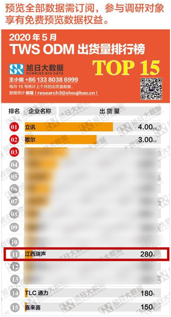据9月1日TWS高峰论坛还剩7天,旭日大数据TWS调研小伙伴们还在奔波于产业链上下游的各大企业,这不,又来到了江西瑞声电子在深圳的分公司迈诺科电子。 深圳迈诺科电子有限公司是江西瑞声电子有限公司的一家分公司,是一家专业电声制造、电声方案提供、智能穿戴产品制造的科技型企业,集中高端耳机、蓝牙耳机及智能穿戴产品的研发、生产、销售为一体。 江西瑞声是TWSODM领域不可忽视的一员,据悉,江西瑞声目前生产线多达60多条,研发人员200人。其中,运动蓝牙产品每月出货量达到60-70万件。 为了更好的服务品牌客户,做好TWS耳机代工业务,江西瑞声自主研发了多款带ANC降噪功能与AI语音交互功能的TWS耳机,在研发上具备相当优势。 江西瑞声目前主要客户群体有OPPO、vivo、一加等国内外知名手机品牌和网易、酷狗音乐平台以及京东电商平台等。 图/旭日大数据 图/旭日大数据 据旭日大数据调研统计的2020年5月全球TWS耳机出货量TOP15中,江西瑞声的TWS耳机以280k的月出货量位列第11位。 图/旭日大数据 而在旭日大数据统计的TWS耳机ODM/OEM公司25强(排名不分先后)中,江西瑞声的身影也赫然其中。 图/江西瑞声自主研发TWS蓝牙耳机BTE-603和BTE-601
