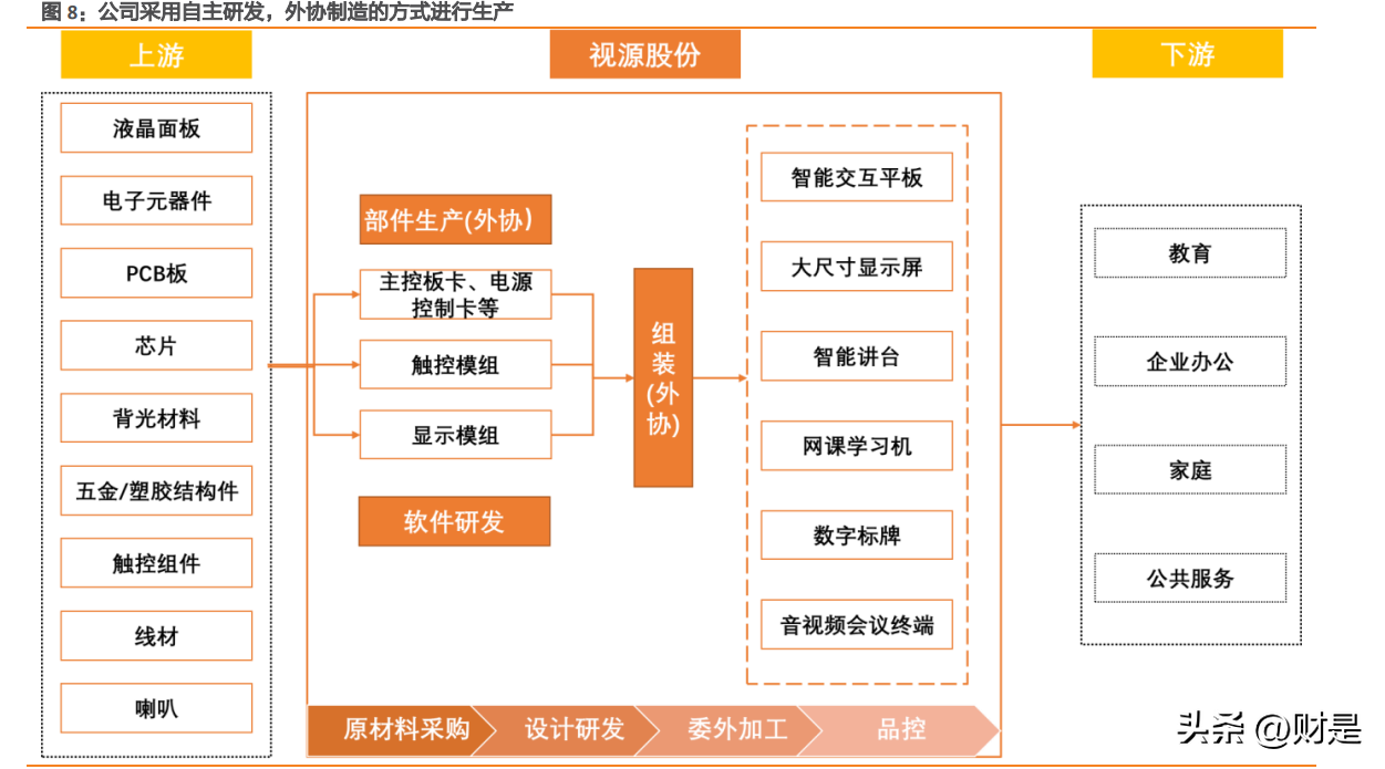(报告出品方/作者:天风证券,缪欣君、潘暕) 1.1.股权结构稳定,轮值董事长促进企业管理先进性 公司股权结构稳定,6位一致行动人合计直接持股比例达49.14%。实控人中,周开琪为公司高管,黄正聪于2011年6月通过增资加入公司。王毅然目前为公司董事长。6位一致行动人经长期合作,已建立稳固良好的合作关系,共同管理公司。股权激励与员工持股平台持续激励员工内生动力。上市前通过两个员工持股平台视欣投资、云南视讯实施员工股权激励,截止2022年8月公司最新一轮定增完成后,合计持有公司股份的5.10%。上市后,股权激励常态化,目前已实施三期股权激励。 公司董事长轮岗,管理去中心化保证高管学习动力。公司董事长职位自2011年12月至2017年12月由实控人黄正聪担任,后由周勇接任至2019年4月,目前董事长职位由实控人王毅然出任。公司董事长轮值保证团队进行灵活、有效的管理。 公司管理层大多出身产业,且具备名校EMBA学历。公司管理层大多出身于显示行业,且具备名校EMBA学历,我们认为复合背景能有效保证公司对产业的前瞻洞察力与管理企业的能力。技术方面,公司CTO杨铭博士毕业于中山大学计算机系,多项研究成果发表在TVCG等国际顶级学术期刊及会议,在技术层面为公司带来有效支持。 1.2.发展历程:从部件到整机的坚定转型 从部件到整机,海内到全球,公司跨界能力卓越,现已跻身多领域行业龙头。2005年,视源股份成立于广州,为电视整机厂商生产显示板卡。2008年,公司推出交互智能平板品牌“希沃”,以教育信息化作为方向,切入下游整机行业。2017年,会议平板产品“MAXHUB”发布。同年,部件业务延伸至白电,开拓智能控制组件业务。2018年公司收购上海仙视51%股权,布局数字标牌领域,同时拓展海外业务,成立印度子公司。2019年,公司收购LED显示头部企业青松光电51%股权。22年定增约20亿元,用于建设智慧工厂,进一步提升公司供应链管理与研发创造能力。公司在液晶显示板卡领域已成长为全球龙头,在教育与会议交互智能平板、数字标牌、LED等领域成长为中国龙头。 回顾公司历史,主要存在三条成长曲线:1)2005-2015年:电视产业技术升级阶段成为全球液晶电视板卡龙头。在电视机由CRT向液晶电视升级的阶段,公司前瞻布局开发适配液晶电视的二合一板卡,凭借产品的快速迭代迅速战略市场,成为全球液晶电视板卡龙头。2)2008-2018年:教育信息化1.0时期率先开发出教育交互智能平板,并成为全国龙头,盈利结构改善。3)2017-至今:企业数字化转型加速,会议交互智能平板放量,与海外教育信息化转型构成公司后续的主要增长点。 交互智能平板毛利率达30%,液晶显示主控板卡毛利率稳定在15%左右。交互智能平板设计制造难度高于液晶显示主控板卡,且销售直接面向终端用户,因此拥有更高溢价,近10年毛利率稳定在30%左右,随着核心原材料成本变动略有波动。液晶显示主控板卡业务面向下游电视整机厂商,且产业趋向成熟,因此溢价空间相对有限,毛利率稳定在15%左右。 业务结构中交互智能平板占比提升,公司盈利能力持续改善。回顾公司盈利能力,随着毛利润较高的交互智能平板的营收占比持续提升,公司综合毛利率在21年达到25%,考虑21年面板价格大幅上行影响,毛利率预计仍有上升空间。同时净利率21年达到8%,考虑21年研发人员大幅扩招,净利率预计仍有上行空间。 公司业务已从电视机部件延伸至商业、教育应用场景的显示解决方案。其中部件业务包括电视机部件与白家电部件,合计占21年营收33%。在教育业务中,产品包括交互智能平板、学习机、智能讲台等产品,配合系列应用于教学的软件产品,形成了教育行业整体信息化解决方案,21年营收占比达到32%。海外业务包括教育业务ODM与会议产品自由产品出海两系列产品,21年营收占比达到19%。企业服务业务包括交互智能平板等硬件与智慧协同平台应用软件,营收占比达8%。 我们认为视源股份的业务布局用意在于:传统业务液晶显示板卡做大收入,旨在供应稳定现金流,同时积累供应链管理know-how;跨界布局交互智能平板,享受行业高beta的同时增厚利润,目前会议与海外市场预计仍存在较大空间,依托供应链管理与研发能力,公司有望持续受益行业高增红利。同时,持续以公司平台支持创新业务孵化,LED、家电显示模组等新业务有望成为公司新的增长点。 2.1.供应链管理能力卓越,经营风险低,盈利能力强 视源股份采用自主研发,外协制造的方式进行生产。公司位于产业链的中游,上游为原材料制造商,下游为教育、企业、政府、电视制造商等客户。公司目前所有生产均通过外协完成,但通过把控液晶面板、背光、芯片等核心原材料的采购,同时在生产流程上精细化管控,在产品品质与成本管控上均维持较高水平。同时,委外加工模式让公司得以投入更多精力在设计研发和品牌打造。我们认为,生产侧人力与资产的轻量级投入,让公司的经历更多聚焦于设计与研发,不断通过推出差异化的产品巩固自身在行业的竞争优势。 公司对外协厂商的精细化管理,有效管控制造成本与产品品质。公司通过ERP和MES的信息化系统,对外协工厂进行协同管理。实时监控加工厂的产能效率、品质良率、库存和帐务,确保准时交付;根据每月绩效评价结果确定与加工厂的合作政策,使加工厂得以更好的满足交付需求。同时,公司不定期为外协工厂进