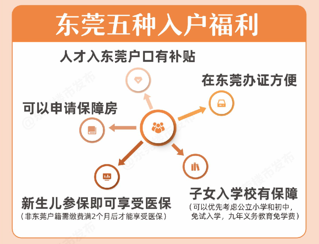 今日(8月1日)起,没有学历职称、居住证或社保没满五年也能入户东莞了! 根据7月26日东莞公安局官网发布的《东莞市优秀产业工人入户实施试行办法》: 符合条件的人员,只要满1年社保,持有《广东省居住证》,未达到法定退休年龄,就可以申请入户。 相比于之前的人才入户和“双五”入户,条件放宽了不少! 优秀产业工人入户政策,今日起实施 日前,东莞公安局官网发布了《东莞市优秀产业工人入户实施试行办法》(以下简称《办法》),这个入户新政,今日起正式实施。 根据规定,在经评定为优秀企业的用人单位工作,属于急需的技术技能工人或管理人员,满足以下4个基本条件,就能直接入户。 总体来说,该入户新政没有学历要求,社保和居住证无需满5年,年龄也放宽至小于退休年龄。 而且符合条件的,其配偶及未成年子女也能随本人同时申请入户东莞。 与之前东莞市主要的入户政策,“双五”入户(即社保满5年+居住证满5年)和人才入户相比,这次的入户新政,大大的放宽了门槛。 对于很多因为社保、居住证年限不够,或者学历、职称达不到要求而无法申请入户的人来说,是个极大的好消息。 东莞南城东莞楼市发布摄于2023年7月 入户东莞最大的好处就是子女上学有保障,可以直接报读公立学校,免试入学,享受免费的九年义务教育。 要知道,目前东莞私立小学一学期的学费在1-2万左右。入读公立学校,能够降低教育成本。 此外,东莞户籍在购房名额上也有优势。在楼市限购期,本地户籍购买二手房不限套数,而非本地户籍限购2套。 虽然东莞目前不限购,但若是政策收紧,户籍人口的优势就凸显出来了。 该入户新政的实施,也能填补现行入户政策的空白,打破现行政策的局限性。 为不符合“双五”入户和人才入户政策的优秀产业工人,提供新的入户途径。 5种企业符合条件,镇区企业拥有自主权 入户新政放宽了东莞入户门槛,对申请人的要求较低。但是对企业的要求较高,需要在经评定的优秀企业工作才能申请。 那么,哪些企业符合条件呢?以下5种企业适用: 1、国家、省级制造业创新中心所在企业,省级企业技术中心所在企业,国家和省级工业设计中心所在企业,国家、省级工业设计研究院,规模以上软件和信息技术服务业企业(《软件和信息技术服务业统计调查制度》纳统名单),国家级专精特新“小巨人”企业和省级专精特新中小企业。 2、国家高新技术企业,国家和省级重点实验室、工程技术研究中心所在单位,经省市认定的新型研发机构,省实验室,有关科技服务企业,百强创新企业和瞪羚企业,市级及以上在研的重点领域研发计划项目(科技重大专项)牵头单位。 3、进驻并获战略性新兴产业基地认定的企业,国家企业技术中心所在企业,国家、省工程实验室(工程研究中心)所在企业,经认定的总部经济企业和国家重大科技基础设施的牵头科研单位及其地方运营单位(需为独立法人单位)。 4、我市上年度经济贡献突出的前1000家制造业企业。 5、经各园区管委会、镇人民政府(街道办事处)推荐的其它优质单位,或有特殊贡献的单位。 尤其是第5条,给予了镇街、园区充分的入户自主权,能够为各优秀企业分配入户名额,鼓励产业发展。 松山湖东莞楼市发布摄于2022年1月 《办法》中还规定,纳入优秀企业名录的用人单位,可获得当年优秀产业工人入户推荐资格,由入户申请人所在企业负责申报。 但是对于急需的技术技能工人或管理人员的认定,文件中并没有明文规定。申请入户的资格名单均由企业提供。 这也就意味着这个人员认定弹性很大,只需要由企业来评估,也相当于是放宽了入户门槛。 最新最全,东莞最新入户政策图解 最后,楼市君整理了东莞最新的购房政策图,把入户福利、条件、所需资料和办理流程等,一张图给你说透! 有需要的小伙伴可以点赞收藏。