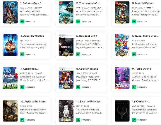 2023年即将结束,随着国外年尾圣诞假期的到来,各大游戏媒体的评分工作也已结束,M站评分自然也已尘埃落定。根据M站数据显示,今年《博德之门3》凭借96分的高分成为了2023年M站最高分游戏,《塞尔达传说:王国之泪》以同样的分数位列第二名。 前十排名如下: 1.《博德之门3》96分 2.《塞尔达传说:王国之泪》96分 3.《银河战士Prime复刻版》94分 4.《阿斯加德之怒2》93分 5.《生化危机4重制版》93分 6.《超级马里奥兄弟惊奇》92分 7.《异度神剑3》92分 8.《街头霸王6》92分 9.《TurboOverkill》91分 10.《风暴之城》91分