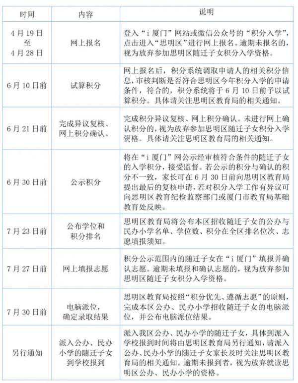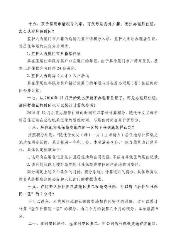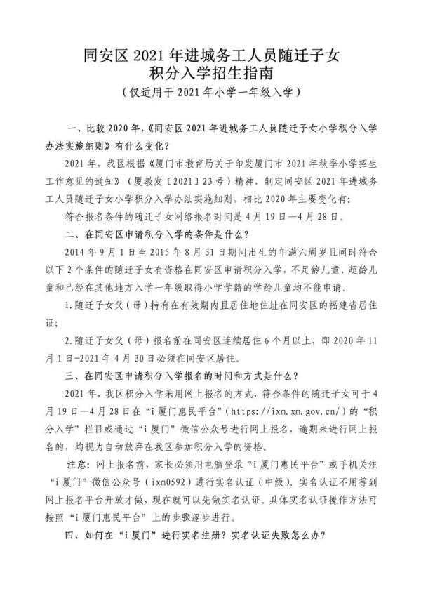 今天 思明区、集美区、海沧区、 翔安区、同安区 发布积分入学细则 昨天湖里区已经率先发布! 厦门6个区积分入学细则 已全部发布啦~ 今年积分入学报名时间为 4月19日-28日 ↓↓↓ 思明区 思明区发布 《2021年进城务工人员随迁适龄子女 申请就读思明区小学一年级积分入学实施细则》↓ 以及 《2021年进城务工人员随迁适龄子女申请就读思明区一年级积分入学指南》↓ 向下滑动查看↓ 1.思明区2021年进城务工人员随迁适龄子女(含随迁残疾子女,以下简称随迁子女)申请就读思明区小学一年级积分入学的政策在哪里公布? 2.在哪里报名参加思明区随迁子女积分入学? 答:要申请参加思明区随迁子女积分入学的家长,须按规定时间登入“i厦门服务平台”(),进入“积分入学”选择“思明区”进行网上报名。 ●温馨提示:思明区只受理网上报名,不受理线下的现场报名。 3.电脑端和手机端都可以进行积分入学的网上报名吗? 电脑端有利于阅读和操作,手机端便于及时查询和拍照上传材料,请报名者自行选择电脑端或手机端的报名途径,两种途径可以互为补充使用。 4.今年随迁子女参加思明区积分入学的申请条件是什么? 答:①随迁子女应年满六周岁(即2014年9月1日至2015年8月31日出生); ②随迁子女父(母)持有在有效期内且居住地住址为思明区的福建省居住证; ③随迁子女父(母)报名前在思明区连续居住6个月以上(即2020年11月1日-2021年4月30日必须在思明区连续居住)。 5.哪些人可以申请参加思明区随迁子女积分入学? 答:①符合报名条件的境内非本市户籍随迁子女; ②符合报名条件的厦门岛外四个区(海沧区、集美区、同安区、翔安区)户籍的随迁子女。 ●温馨提示:思明区户籍、湖里区户籍以及港、澳、台、侨、外籍学生不属于参加思明区随迁子女积分入学的对象。 6.孩子符合厦门小学一年级入学年龄,但已在其他地方就读小学,取得了全国小学学籍,能否申请就读思明区小学一年级? 答:已经取得全国小学学籍的学生,严禁参加我区随迁子女积分入学,否则一律取消其入学资格。 7.不足龄或超龄的随迁子女能报名参加思明区的随迁子女积分入学吗? 答:严禁不足龄或超龄的随迁子女报名。 8.多胞胎子女能否捆绑报名参加积分入学电脑派位? 答:一对夫妻有两个及以上的孩子当年同时符合申请参加思明区随迁子女积分入学的,可以申请捆绑在一起参加积分入学电脑派位。报名者在网上报名时填报相应栏目。捆绑派位会出现以下两种情况:①可能捆绑派位的子女都派入同一所学校;②可能捆绑派位的子女都没派入任何学校。 9.今年参加思明区随迁子女积分入学的工作流程是怎样的? 10.听说参加积分入学网上报名前必须先在“i厦门”进行实名注册是吗? 答:是的,积分入学网上报名前,家长必须在“i厦门”网进行实名注册认证(至少要进行中级实名注册认证)。 ●温馨提示:实名注册认证成功并不是网上报名成功哦!实名注册只是让申请人在“i厦门”网站取得一个符合要求的账号密码而已。实名注册认证成功后,家长须在4月19日至4月28日用这个账号和密码登入“i厦门”--“积分入学”进行网上报名,填写积分入学报名的相关信息。 11.如何在“i厦门”进行实名注册认证? ●温馨提示: ①只能用随迁子女父或母的身份信息进行注册认证,不能用随迁子女本人或其他人的身份信息进行注册认证,否则无法进行网上报名; ②请务必记住自己设置的账号,以免忘记导致无法报名; ③请务必记住注册时填的手机号,积分入学工作期间不要更换手机号码,否则将无法收到后续积分入学相关通知; ④请务必记住设置的密码,以免无法登入报名,同时须谨防密码外泄; 12.今年思明区随迁子女的积分如何计算? 答:随迁子女小学积分入学按务工社保积分、稳定居住积分和计划生育积分三个项目计算积分,满分为120分。随迁子女父母双方均在厦门居住和务工参加我市社会保险的,一方可作为主申请方计算积分,另一方作为副申请方计算积分。 居住按天计分,社保按月计分,积分保留小数点后两位。具体积分计算规则如下: 13.网上报名时要拍照上传哪些材料? 答:①因监护人姓名有生僻字而无法录入的,才须拍照上传监护人身份证正反面; ②因随迁子女姓名有生僻字而无法录入的,才须拍照上传随迁子女户口册本人页; ③随迁子女的出生医学证明作为判定亲子关系的第一材料,必须拍照上传。若无法提供随迁子女的出生医学证明,或虽能提供出生医学证明,但随迁子女与监护人关系较为复杂,还须拍照上传监护人结婚证等其他有效的亲子关系佐证材料。 ●温馨提示: ①对少数亲子关系较为复杂,系统无法明确判定亲子关系的,系统将推送短信通知申请人按规定的时间带亲子关系佐证材料原件和复印件到指定的地点现场审核。派位后,入学报到时学校将再次逐一核实随迁子女的身份信息和亲子关系,一经发现有弄虚作假的,将取消其入学资格。 ②孩子的出生医学证明不得涂改,孩子姓名不允许空白,不允许单独手写孩子姓名。请持不符合规定出生医学证明的家长及时规范孩子的出生医学证明。否则,因亲子关系审核不通过的,将无法参加我区随迁子女积分入学。 14.居住证制度实施之后,在厦暂住与居住如何衔接? 答:随迁子女父母申领居住证前在公安机关记录的暂住时间,可与居住时间合并计算积分,但暂住年